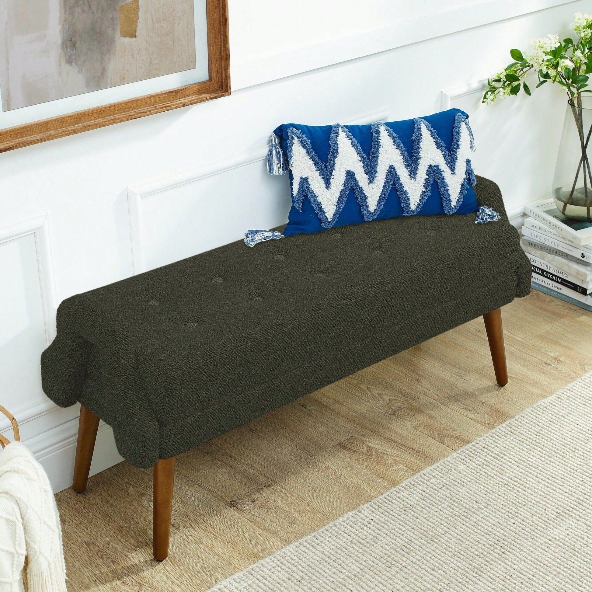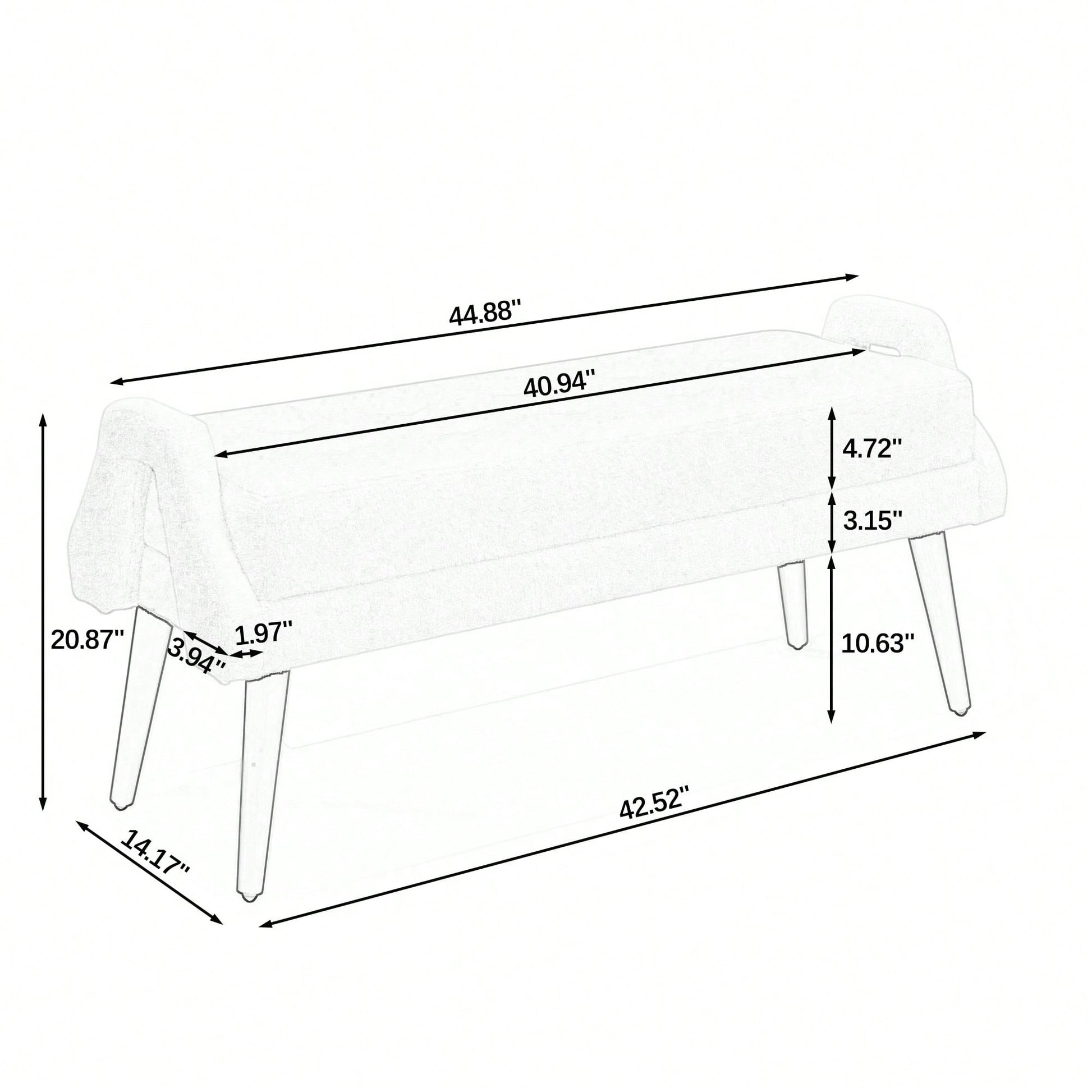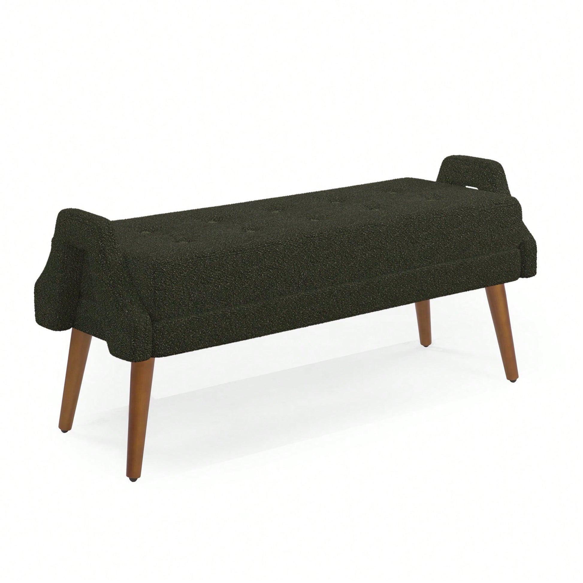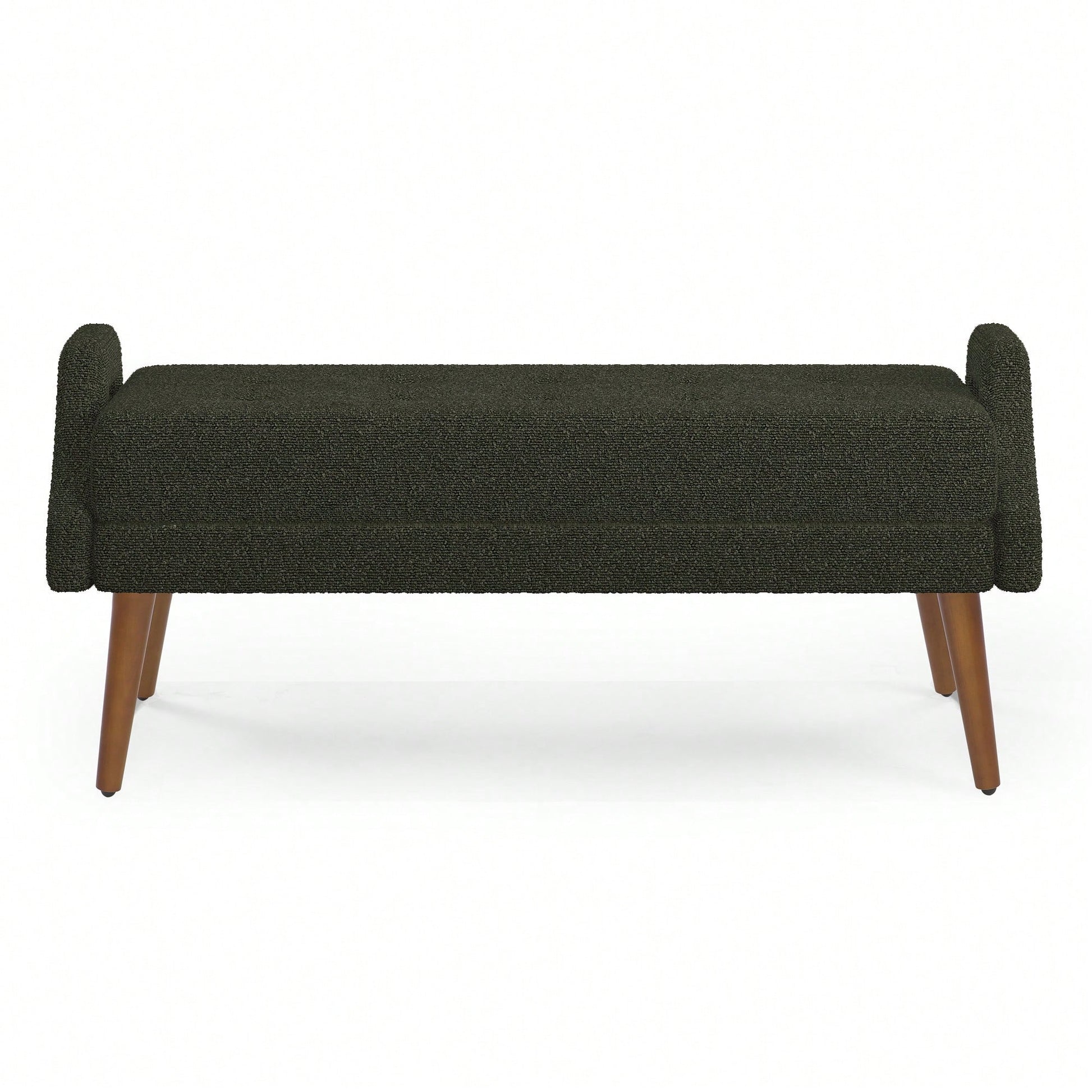 This modern living room bench combines style and functionality, featuring a sleek design that enhances any contemporary space. The bench is upholstered in soft looped yarn fabric, providing a comfortable seating experience. Its irregular geometric armrests break away from traditional designs, offering a fresh perspective from different angles. Crafted with sturdy rubber wood legs, this bench ensures stability and durability while showcasing beautiful natural textures. Assembly is straightforward, allowing you to set it up quickly without the need for specialized tools. Ideal for adding a touch of elegance to your living area, bedroom, or entryway.