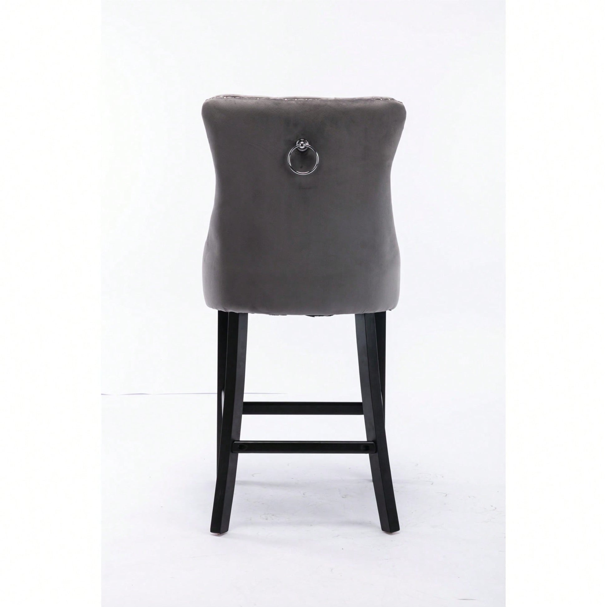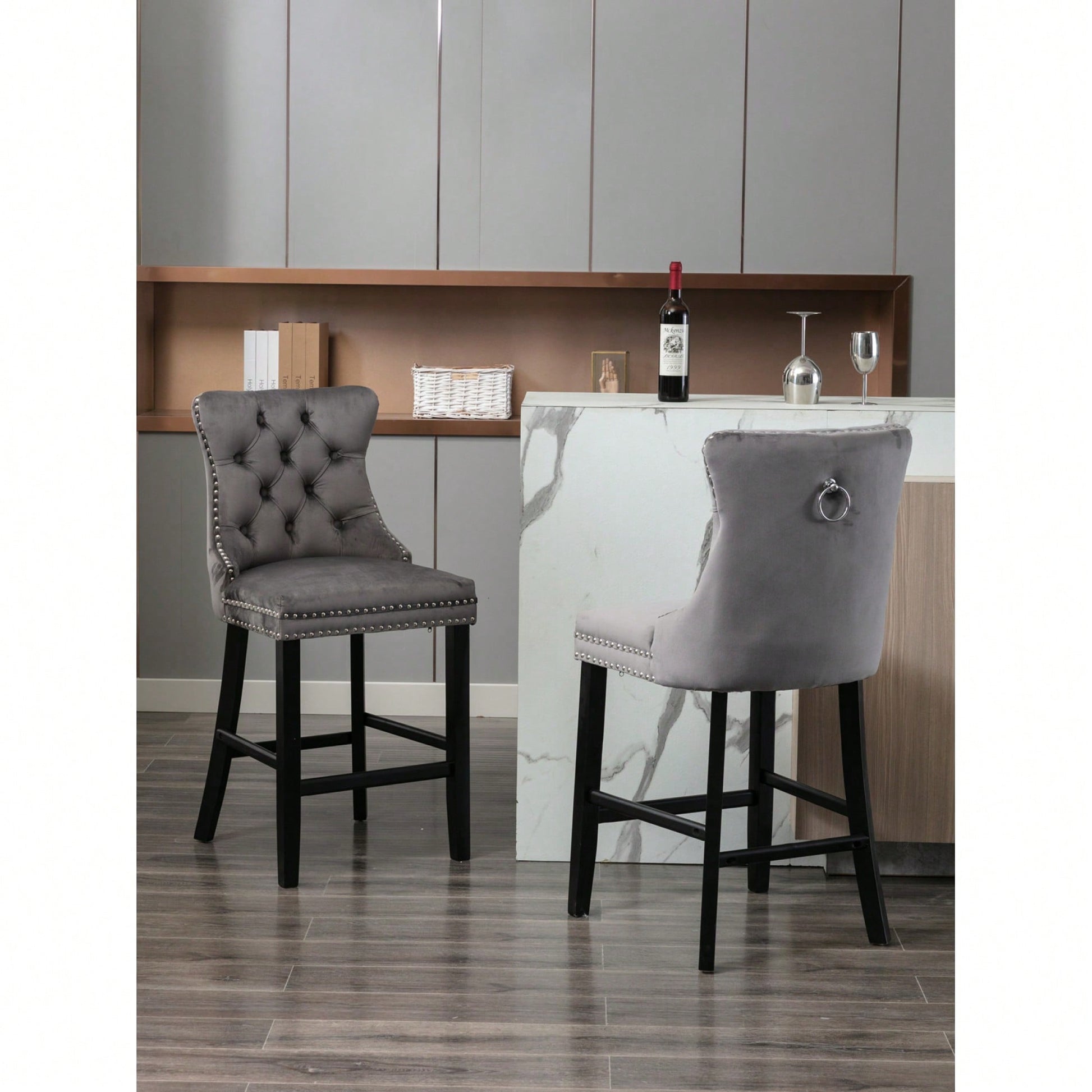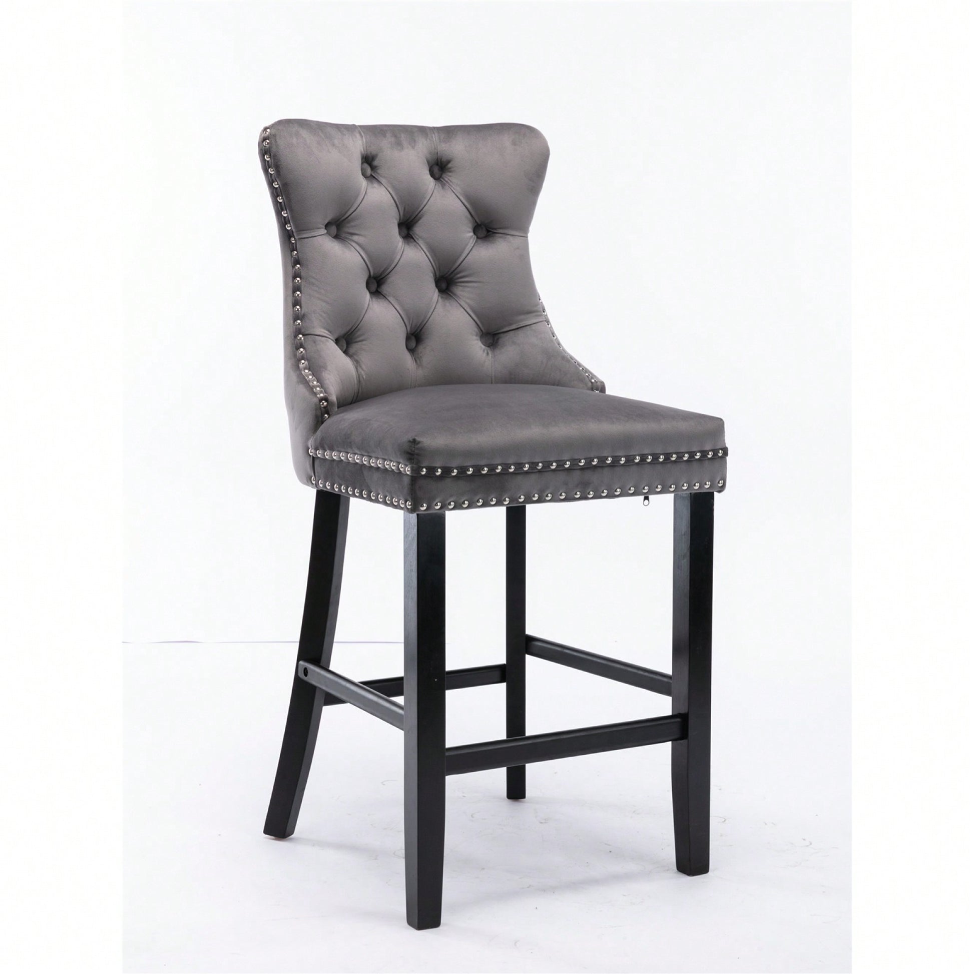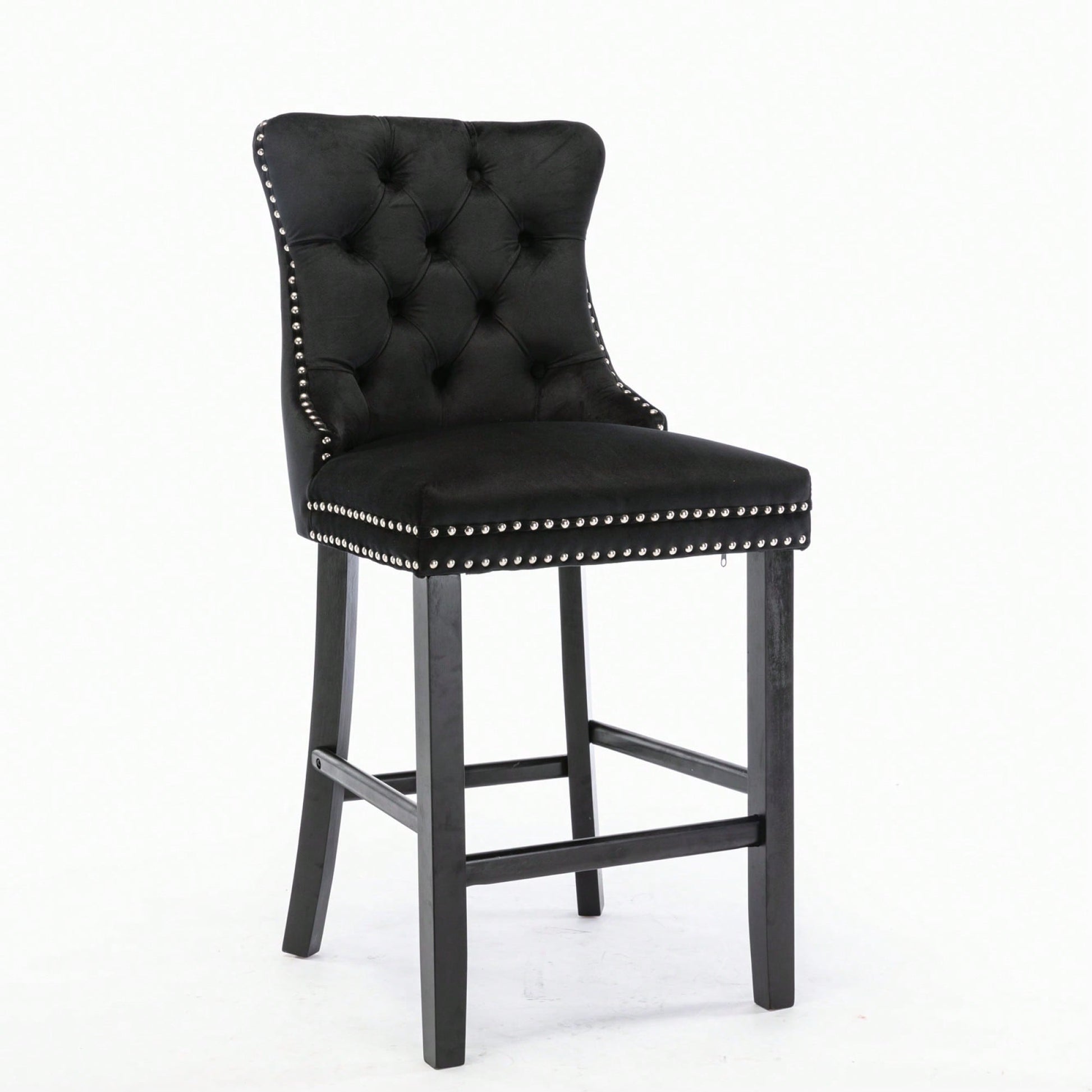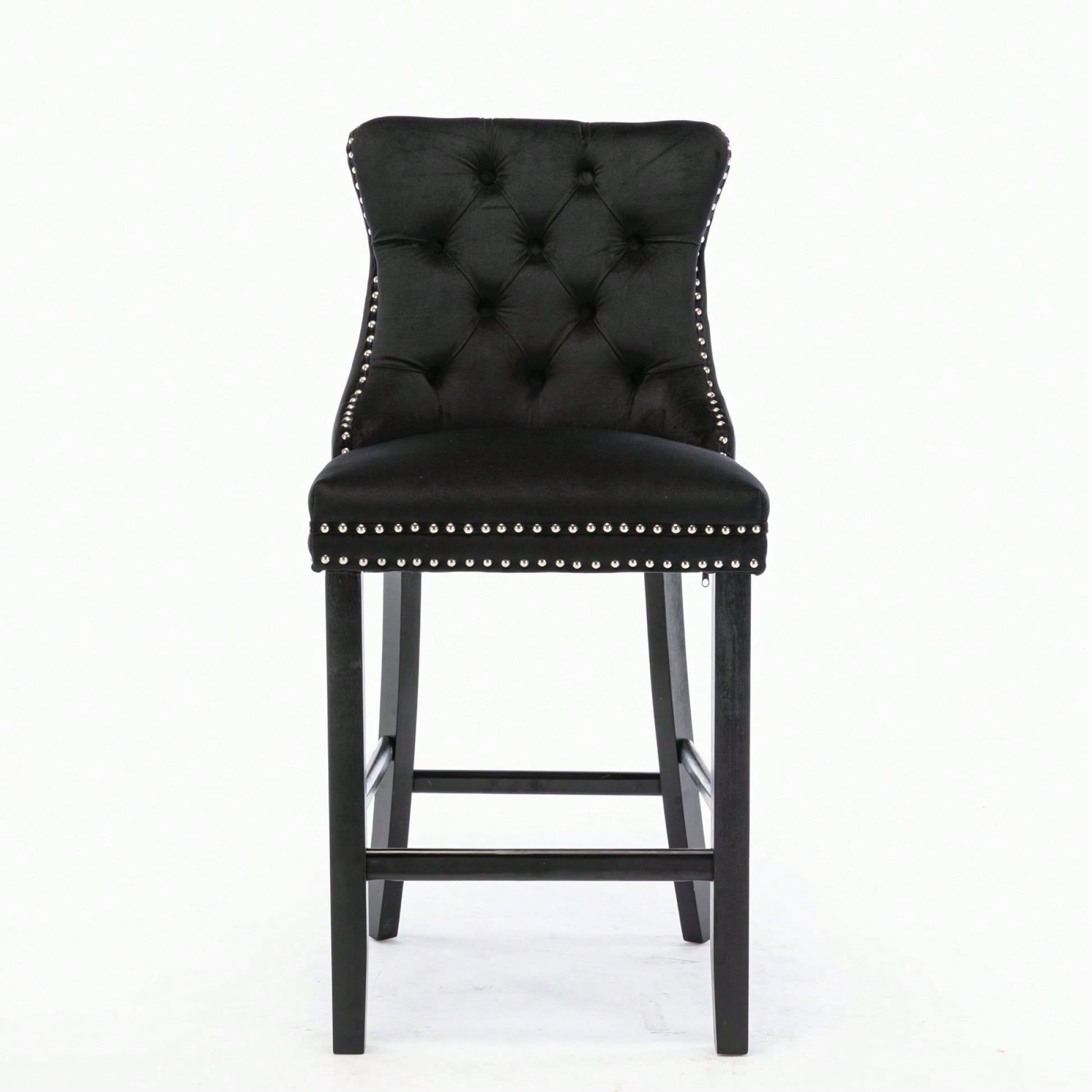These contemporary velvet upholstered barstools bring a touch of elegance to any space. The luxurious velvet fabric is soft to the touch, while the button tufted design and chrome nailhead trim add a sophisticated flair. The high backrest provides excellent support, making these barstools perfect for long gatherings. With a double elastic structure and high rebound sponge, the cushions ensure a comfortable seating experience. The solid wood frame and legs provide stability and security, accommodating users up to 300 pounds. Adjustable pegs on the legs allow for customization of height, making these barstools versatile for various settings. Ideal for dining rooms, sitting rooms, or apartments, they create a warm and inviting atmosphere.