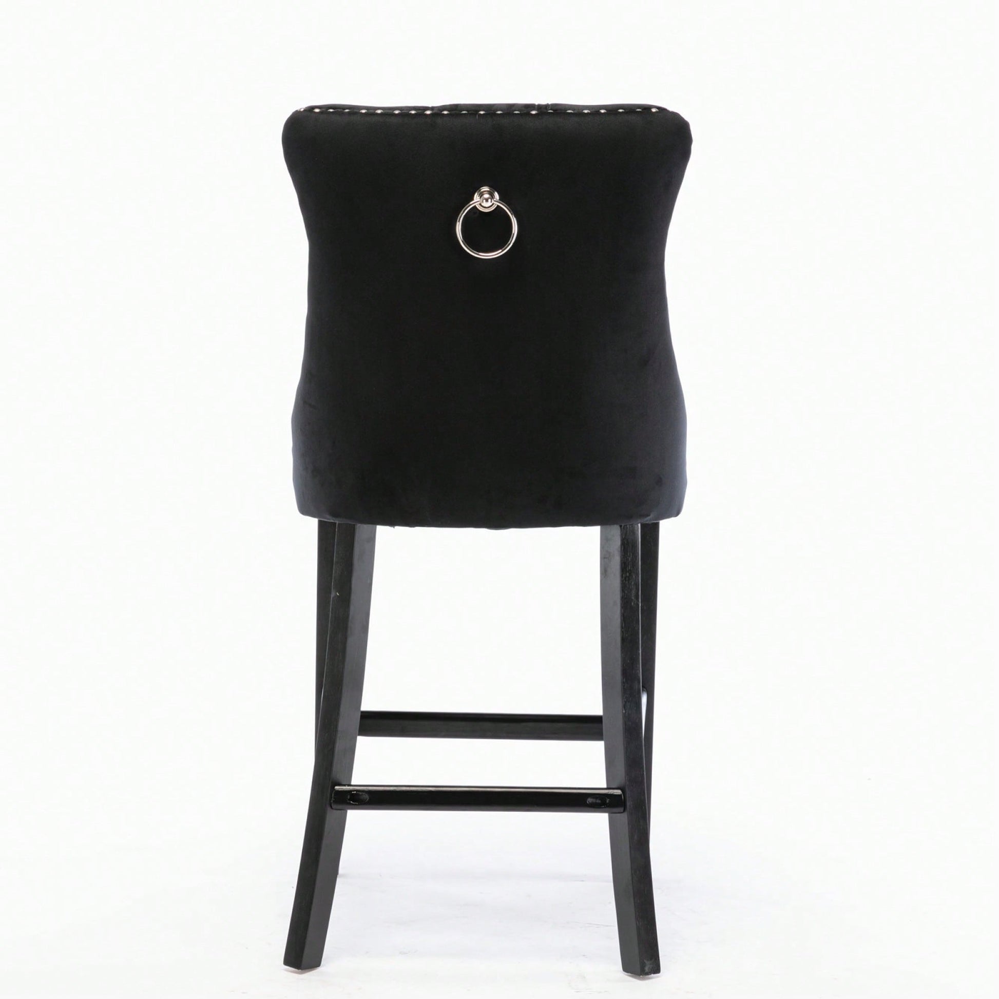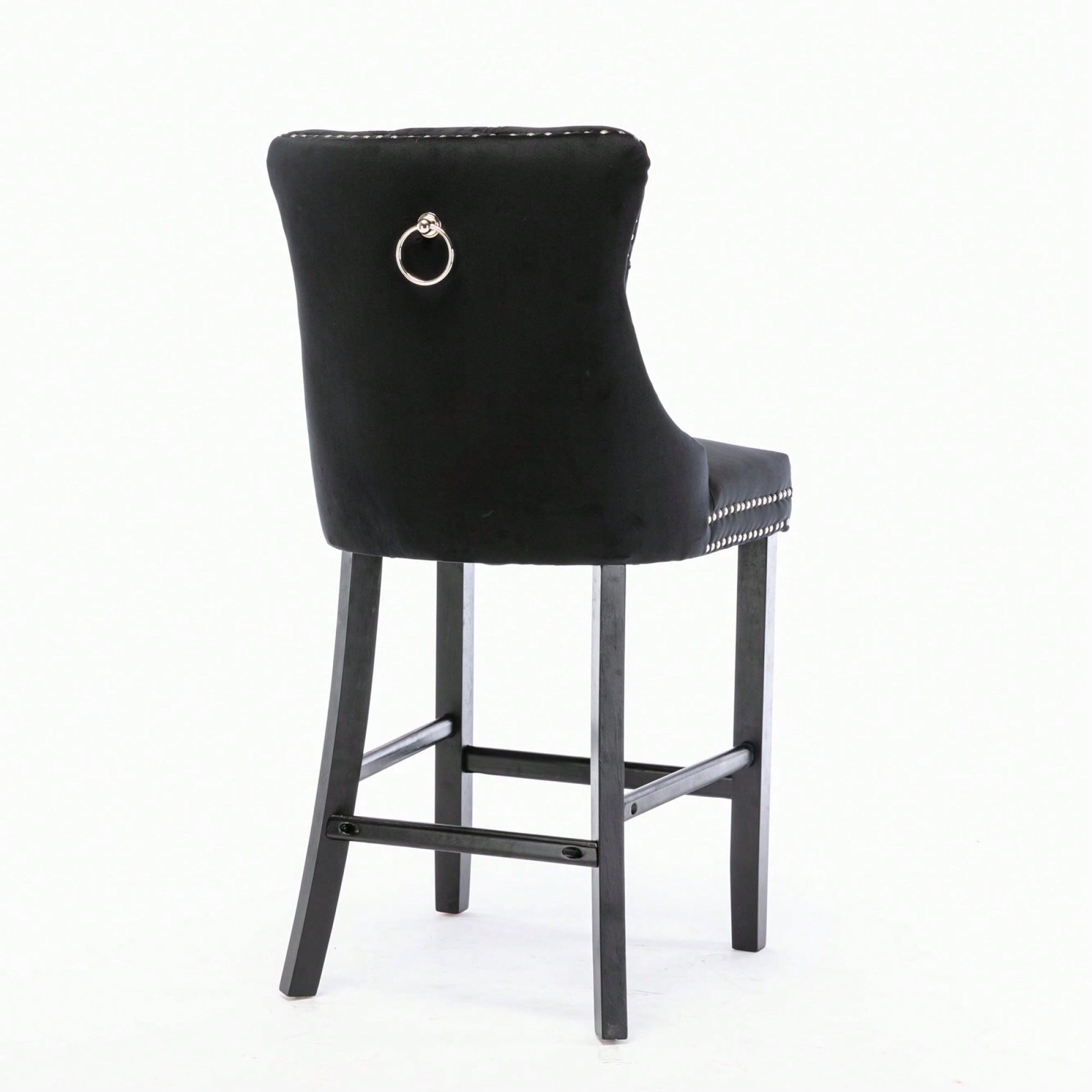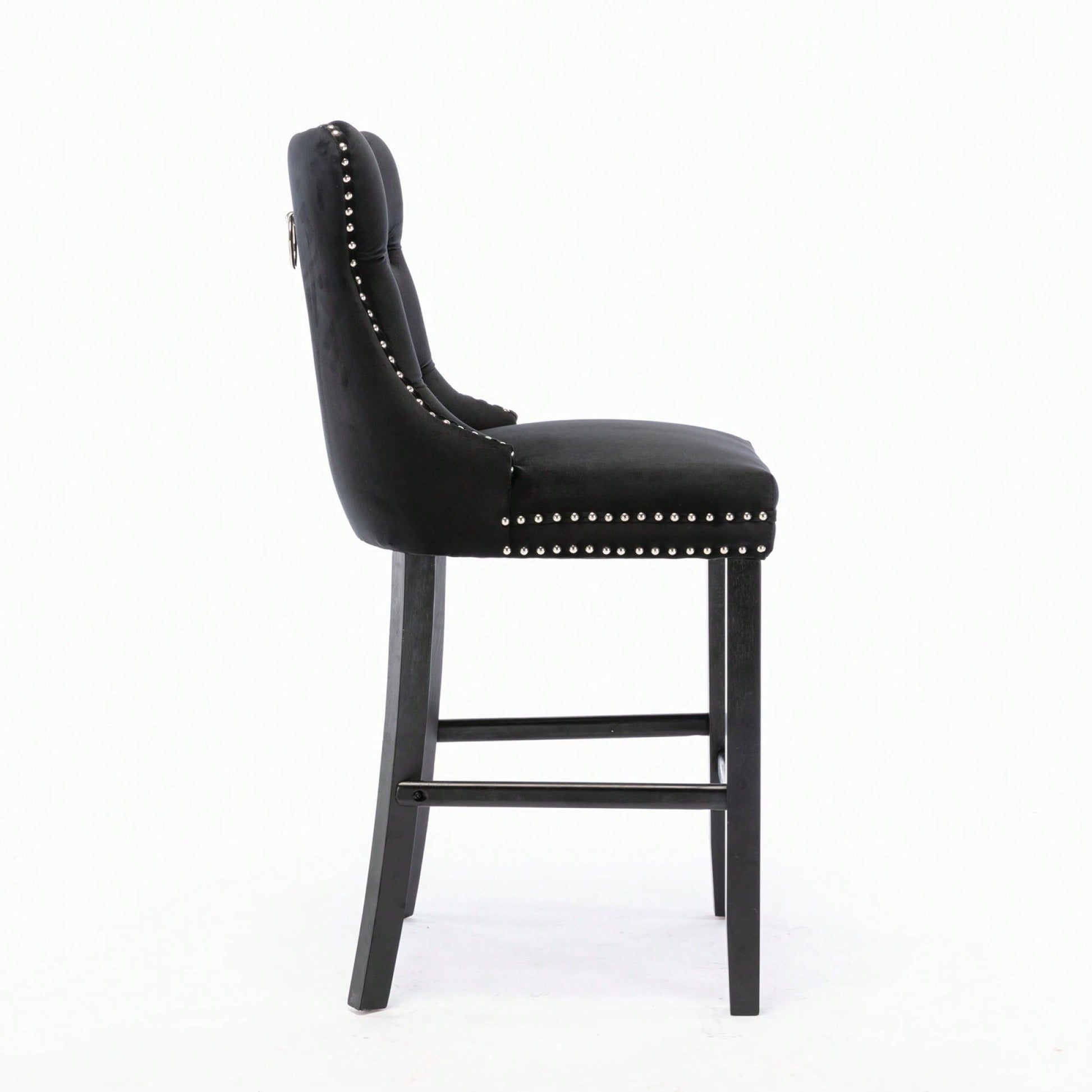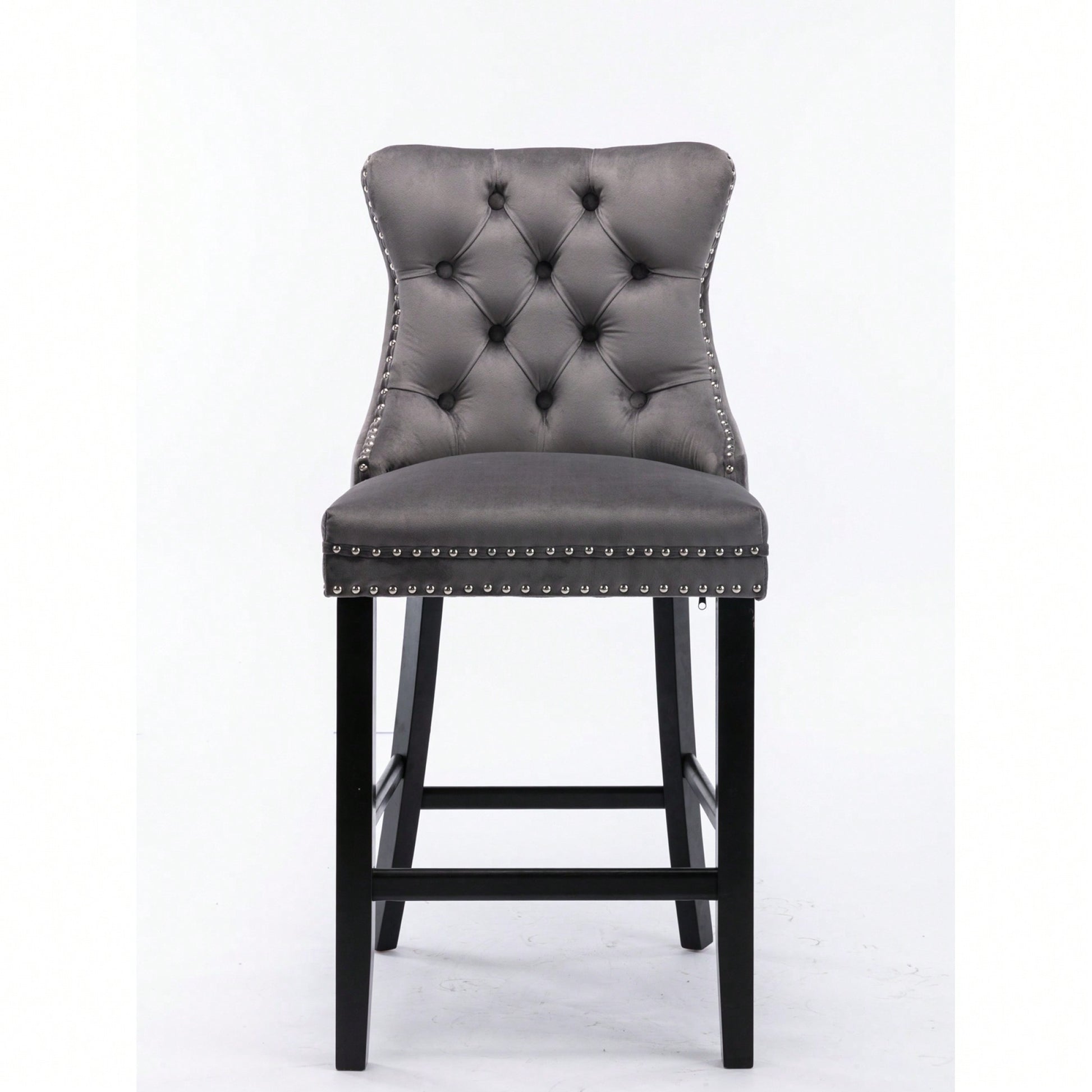 These contemporary velvet upholstered barstools bring a touch of elegance to any space. The luxurious velvet fabric is soft to the touch, while the button tufted design and chrome nailhead trim add a sophisticated flair. The high backrest provides excellent support, making these barstools perfect for long gatherings. With a double elastic structure and high rebound sponge, the cushions ensure a comfortable seating experience. The solid wood frame and legs provide stability and security, accommodating users up to 300 pounds. Adjustable pegs on the legs allow for customization of height, making these barstools versatile for various settings. Ideal for dining rooms, sitting rooms, or apartments, they create a warm and inviting atmosphere.