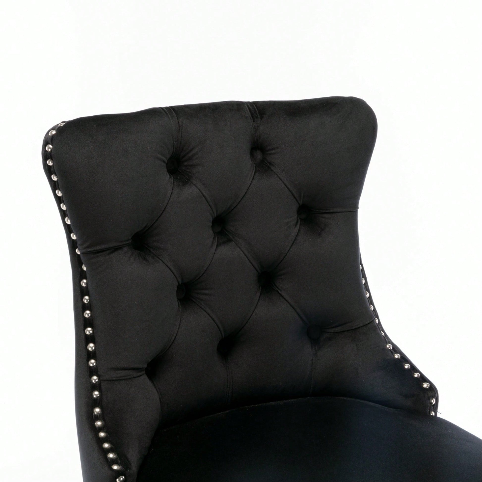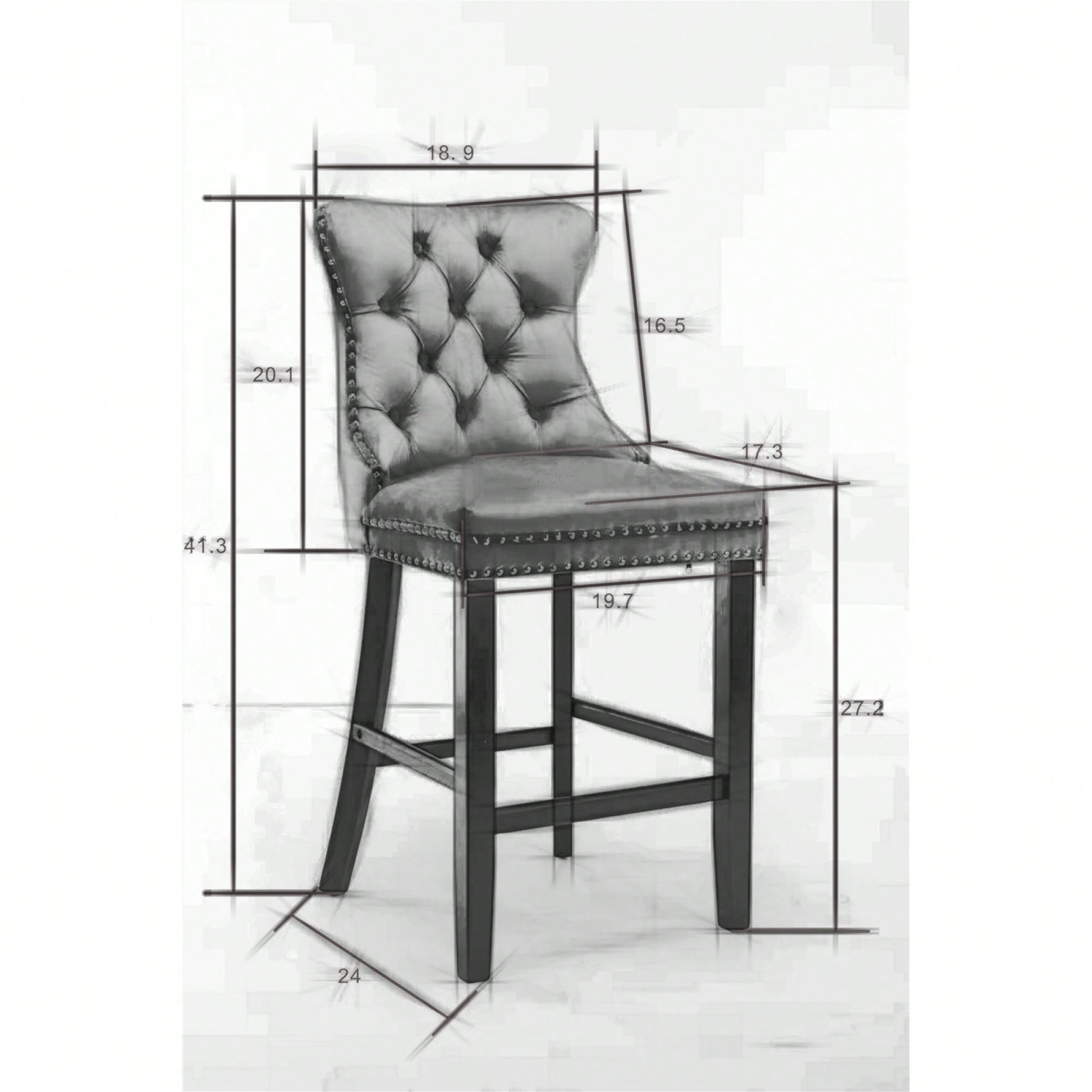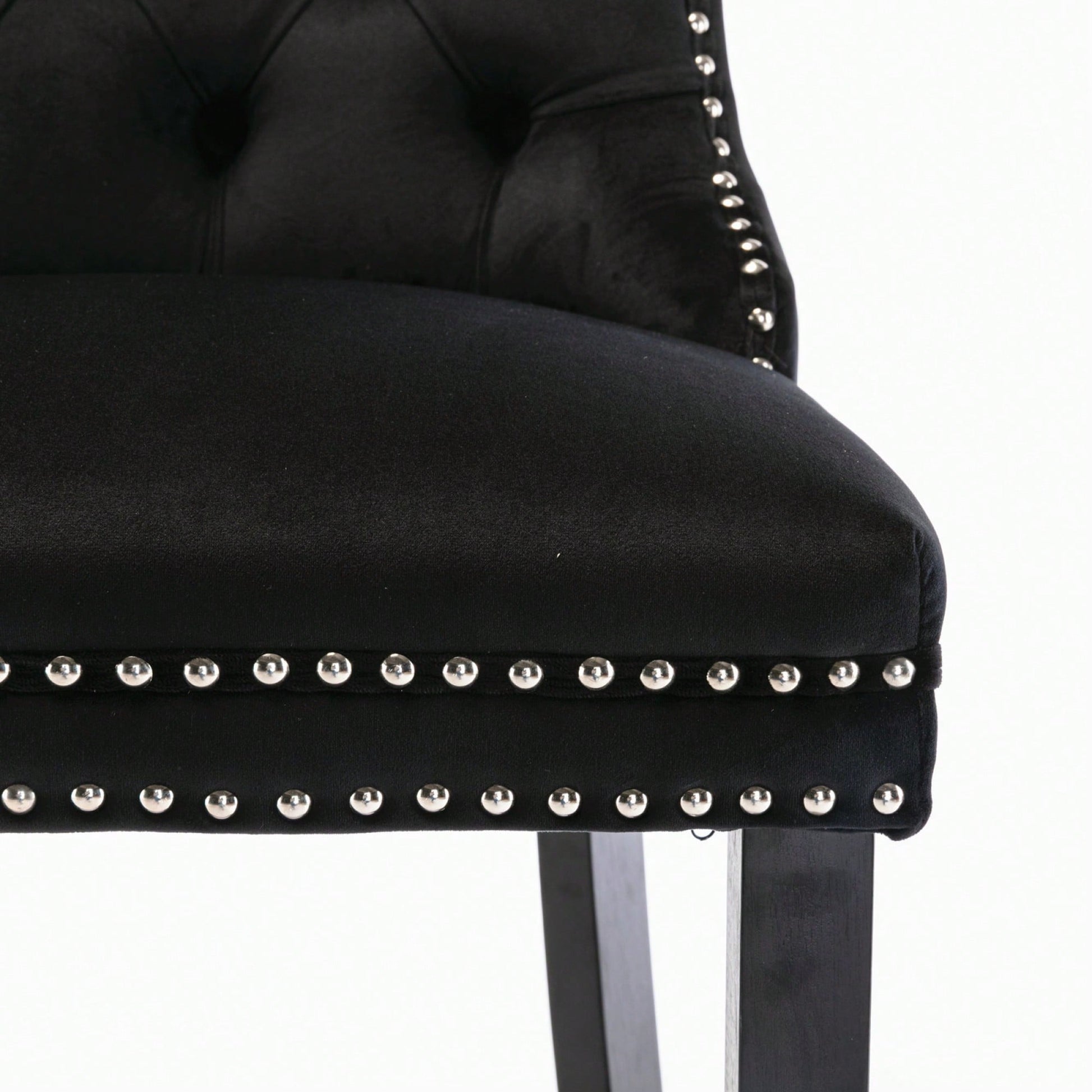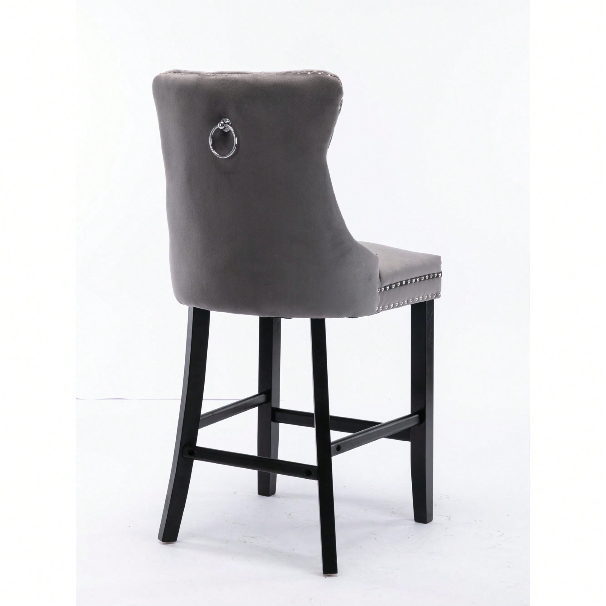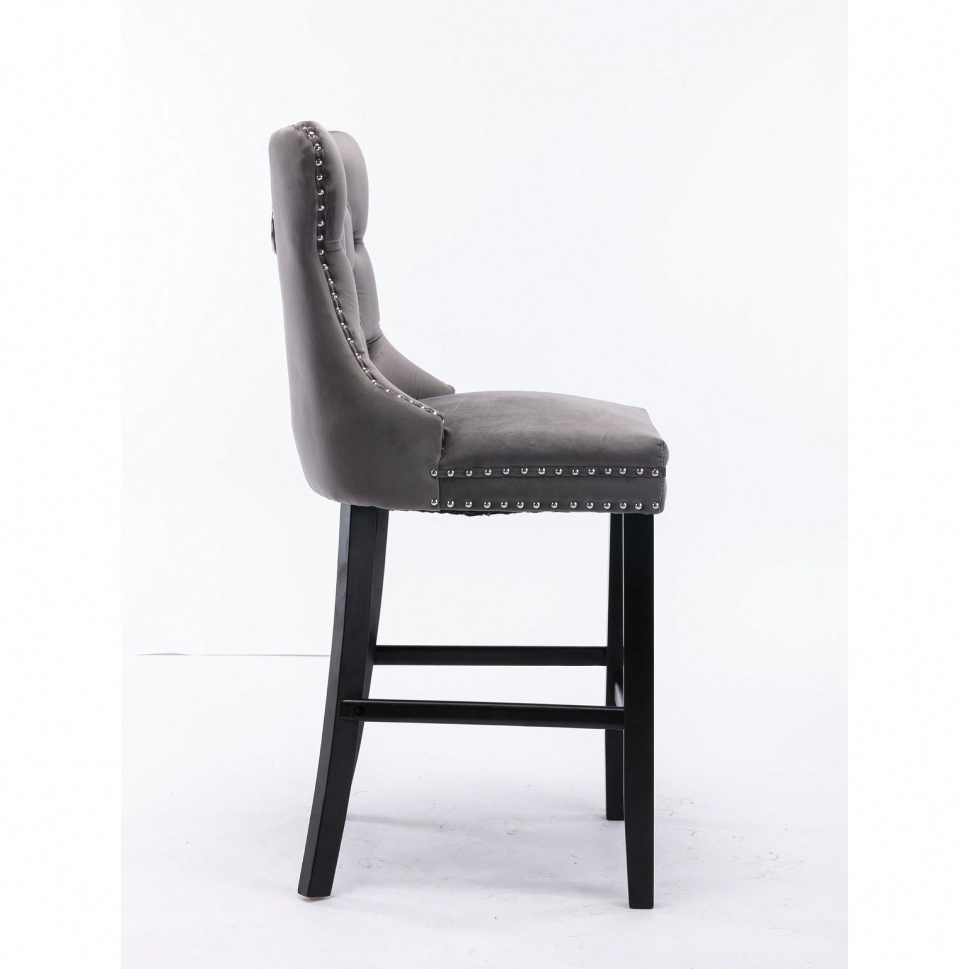 These contemporary velvet upholstered barstools bring a touch of elegance to any space. The luxurious velvet fabric is soft to the touch, while the button tufted design and chrome nailhead trim add a sophisticated flair. The high backrest provides excellent support, making these barstools perfect for long gatherings. With a double elastic structure and high rebound sponge, the cushions ensure a comfortable seating experience. The solid wood frame and legs provide stability and security, accommodating users up to 300 pounds. Adjustable pegs on the legs allow for customization of height, making these barstools versatile for various settings. Ideal for dining rooms, sitting rooms, or apartments, they create a warm and inviting atmosphere.
