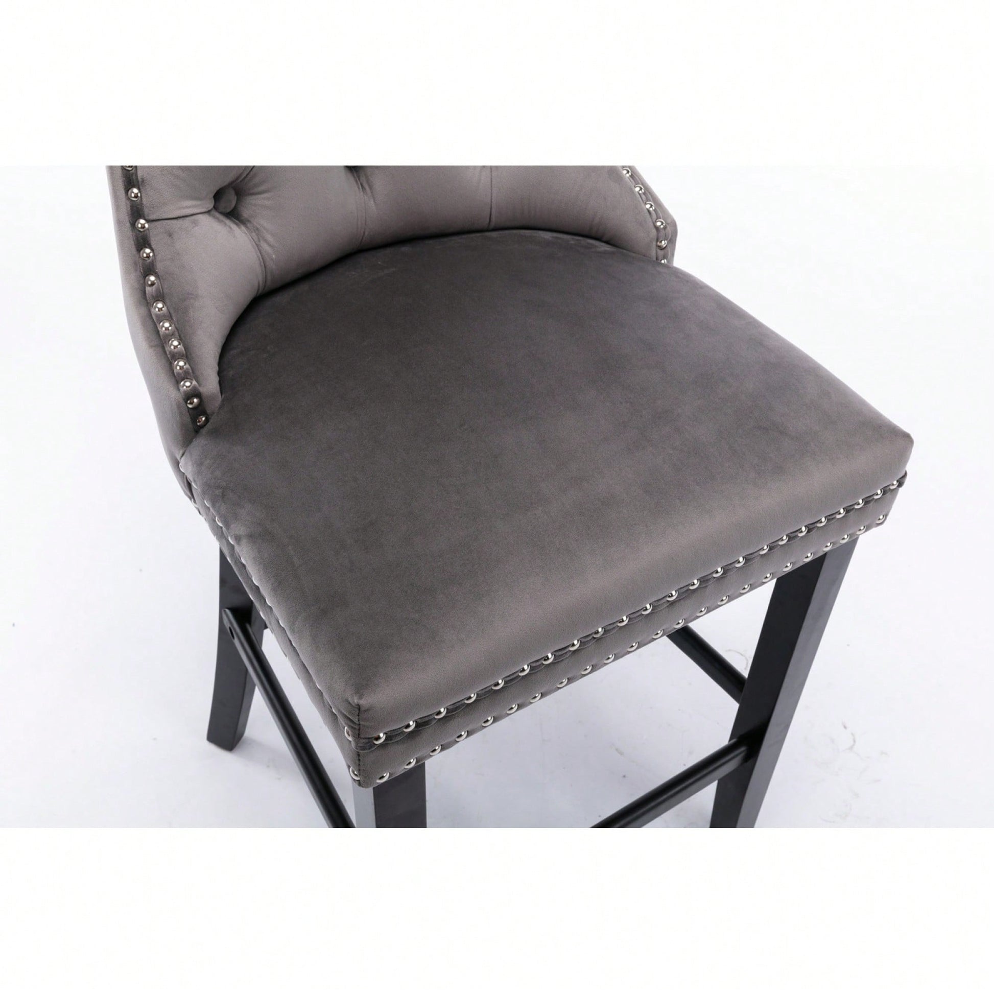 Contemporary Gray Velvet Barstools With Tufted Design And Wooden Legs, Set Of 2, Stylish Leisure Seating With Chrome Nailhead Trim