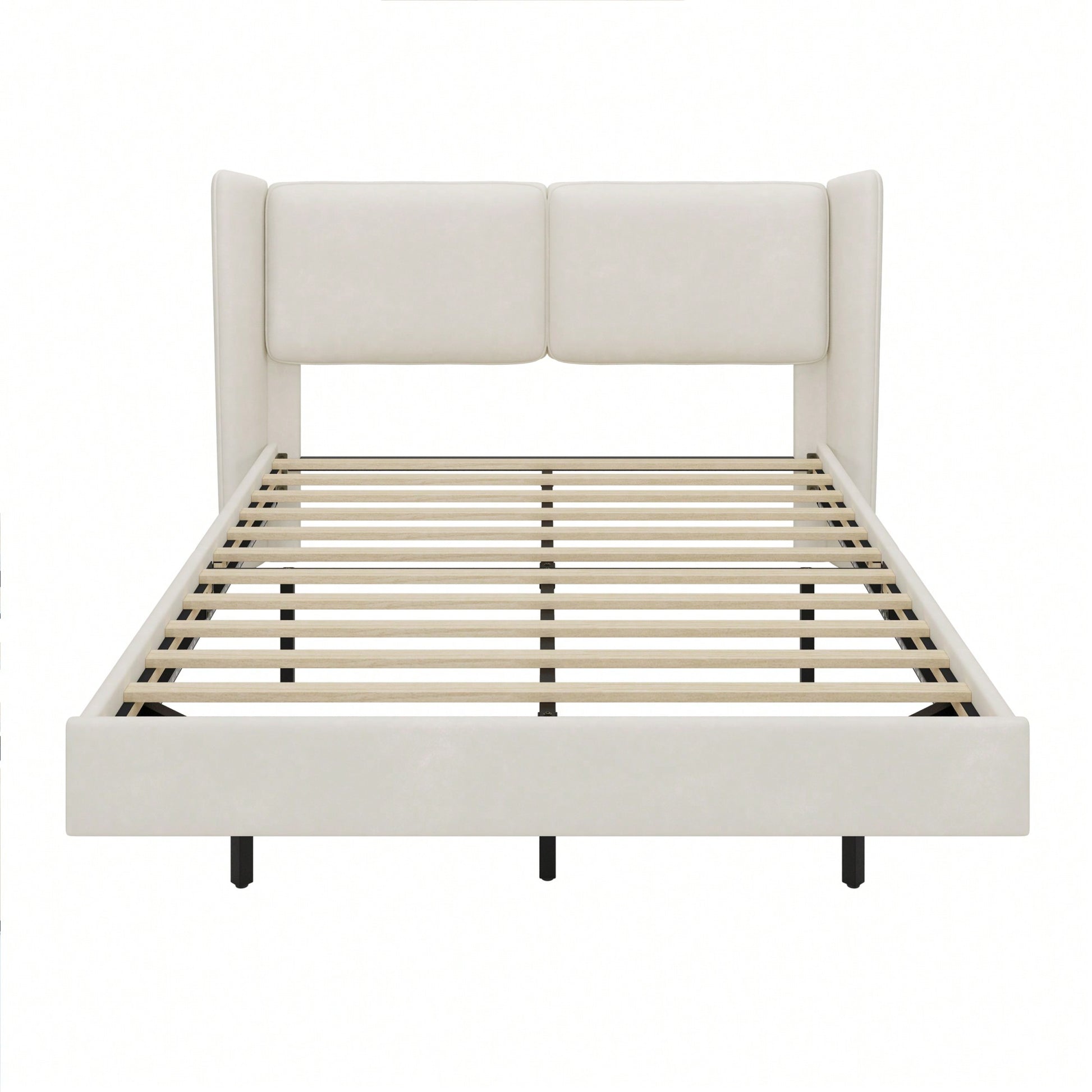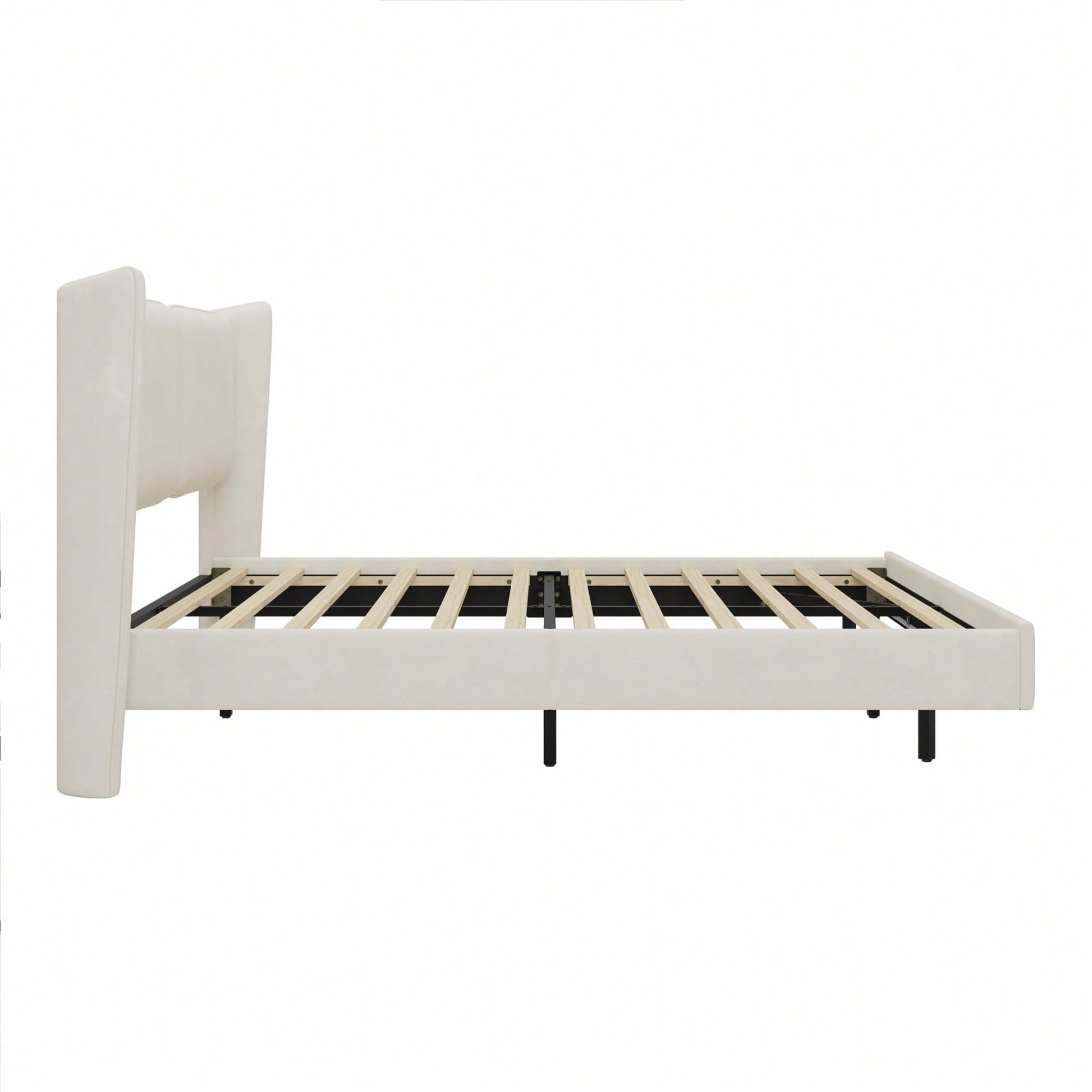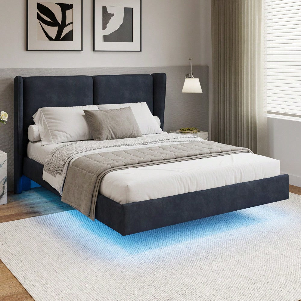 Contemporary Velvet Floating Bed Frame With LED Lights - Wingback Upholstered Full Size No Box Spring Needed In Beige