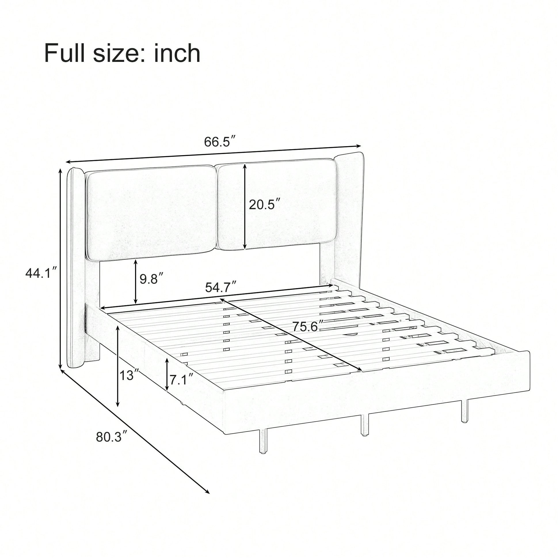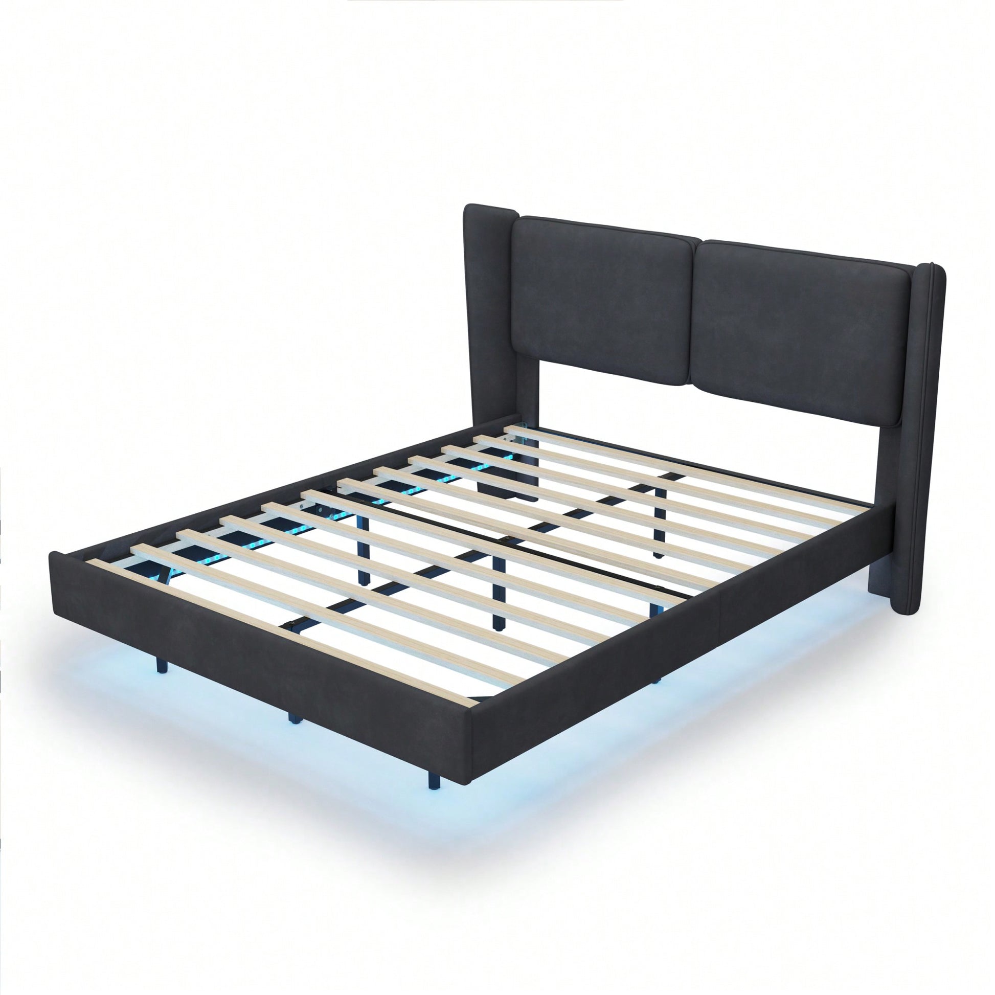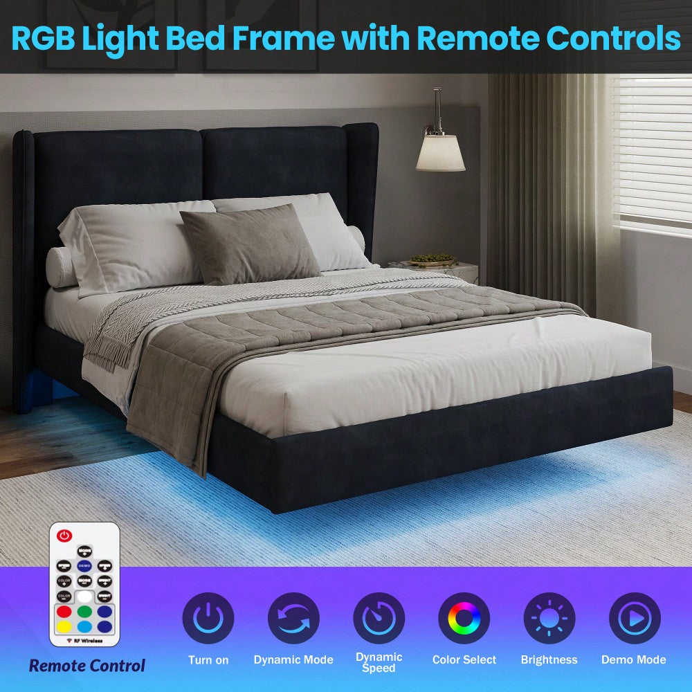 1. Key Features - Floating design supported by seven internal legs for enhanced stability. - Customizable under-bed LED lights with multiple colors and patterns. - Sturdy metal frame and solid wood slats for durability and support. - 6-inch under-bed for convenient storage options. - Soft velvet fabric upholstery for added comfort and a crash-resistant design. 2. Product Description This innovative floating bed frame offers a unique aesthetic with its suspended design, providing a modern touch to any bedroom. Crafted with a strong metal frame and solid wooden slats, it delivers both durability and stability. The under-bed LED lights enhance the sleeping experience by offering a variety of colors and patterns, allowing for a personalized ambiance. With a generous under-bed , you can easily store items and maintain a clean space. Wrapped in soft velvet fabric, this bed frame ensures comfort while providing a safe, crash-resistant surface for a restful night's sleep. Assembly is straightforward with numbered components and detailed instructions included in the package. Specifications - Bed Frame Type: Floating bed frame - Material: Metal frame, solid wood slats, velvet fabric - Under-Bed : 6 inches - Dimensions: Full size - LED Lights: Smart, customizable with key control