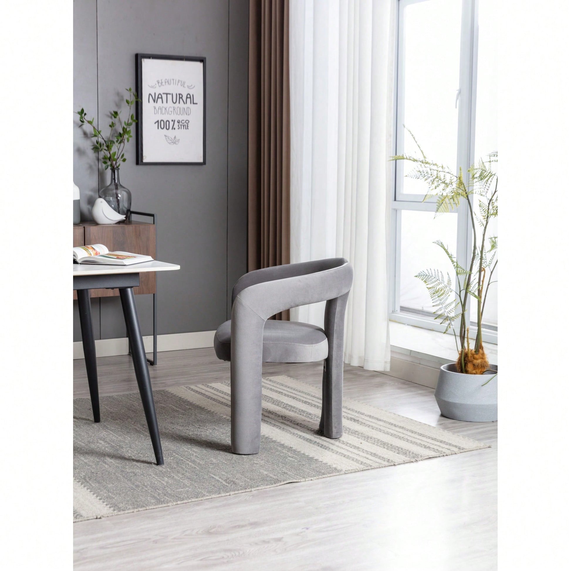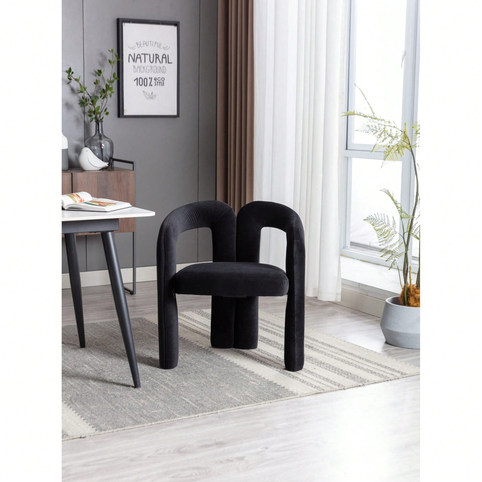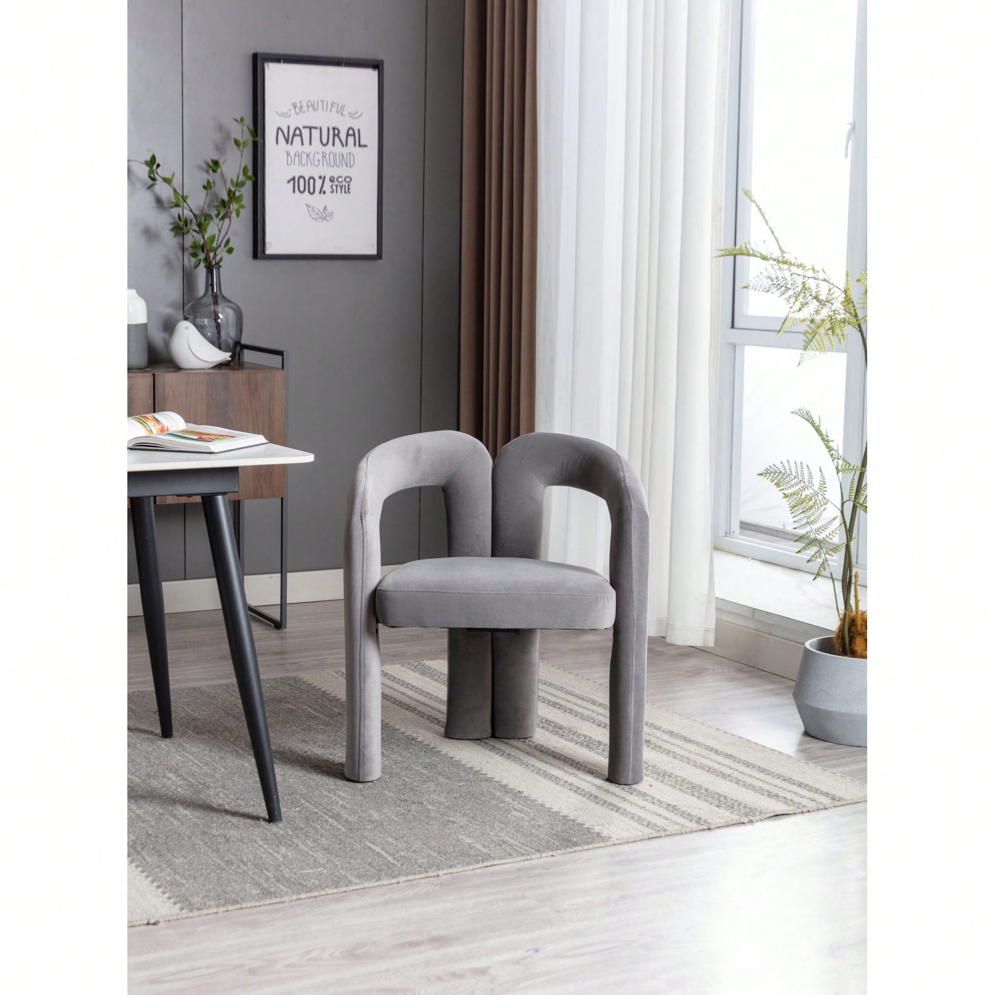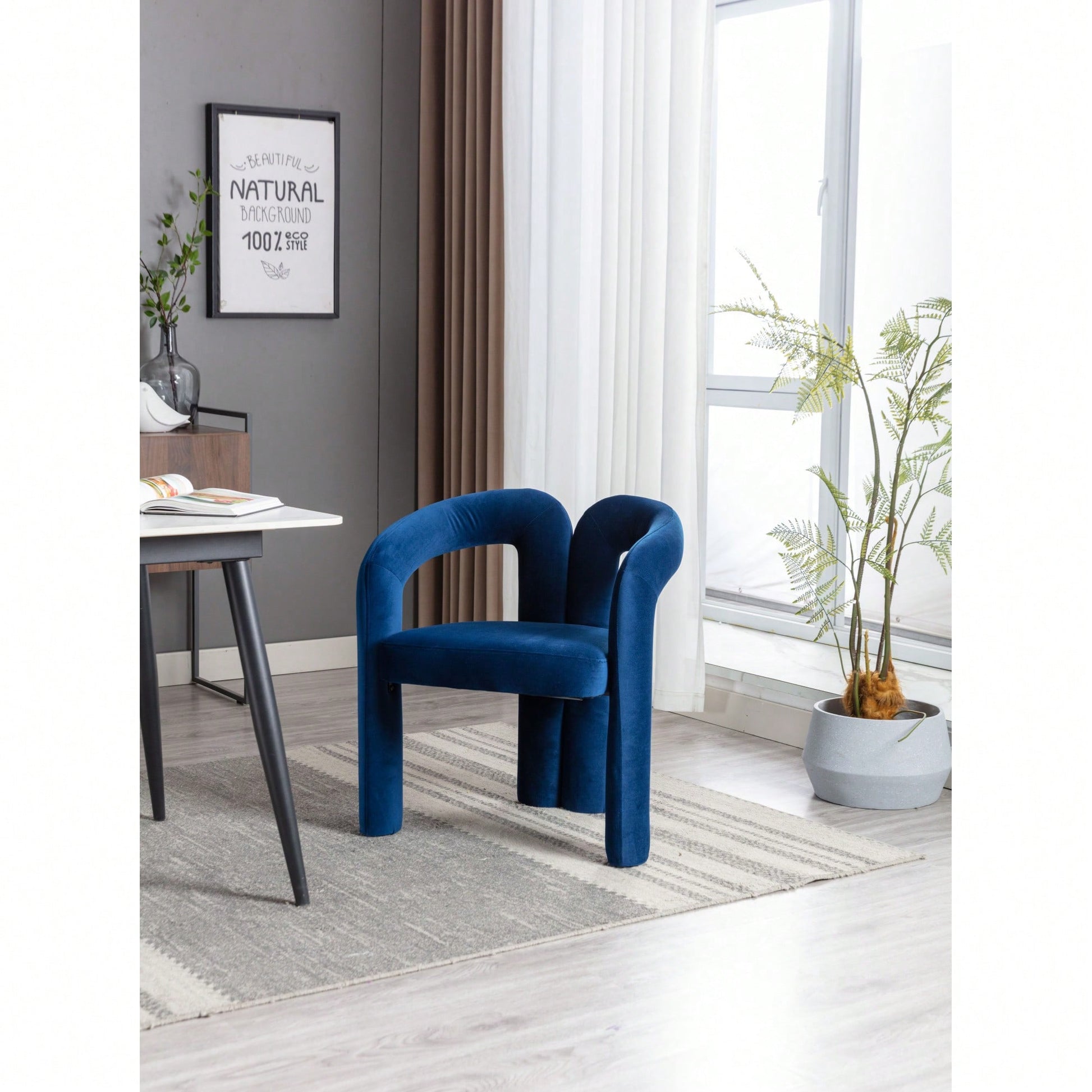 This contemporary velvet upholstered accent chair features a sleek design with a curved circular backrest, making it a perfect addition to any living room, dining room, or home office. The soft velvet fabric wraps around a round, full seat, providing exceptional comfort for dinner parties or family gatherings. The chair is filled with high-density foam for added support and comes with wooden leg warmers for stability. Assembly is straightforward, allowing anyone to set it up easily.