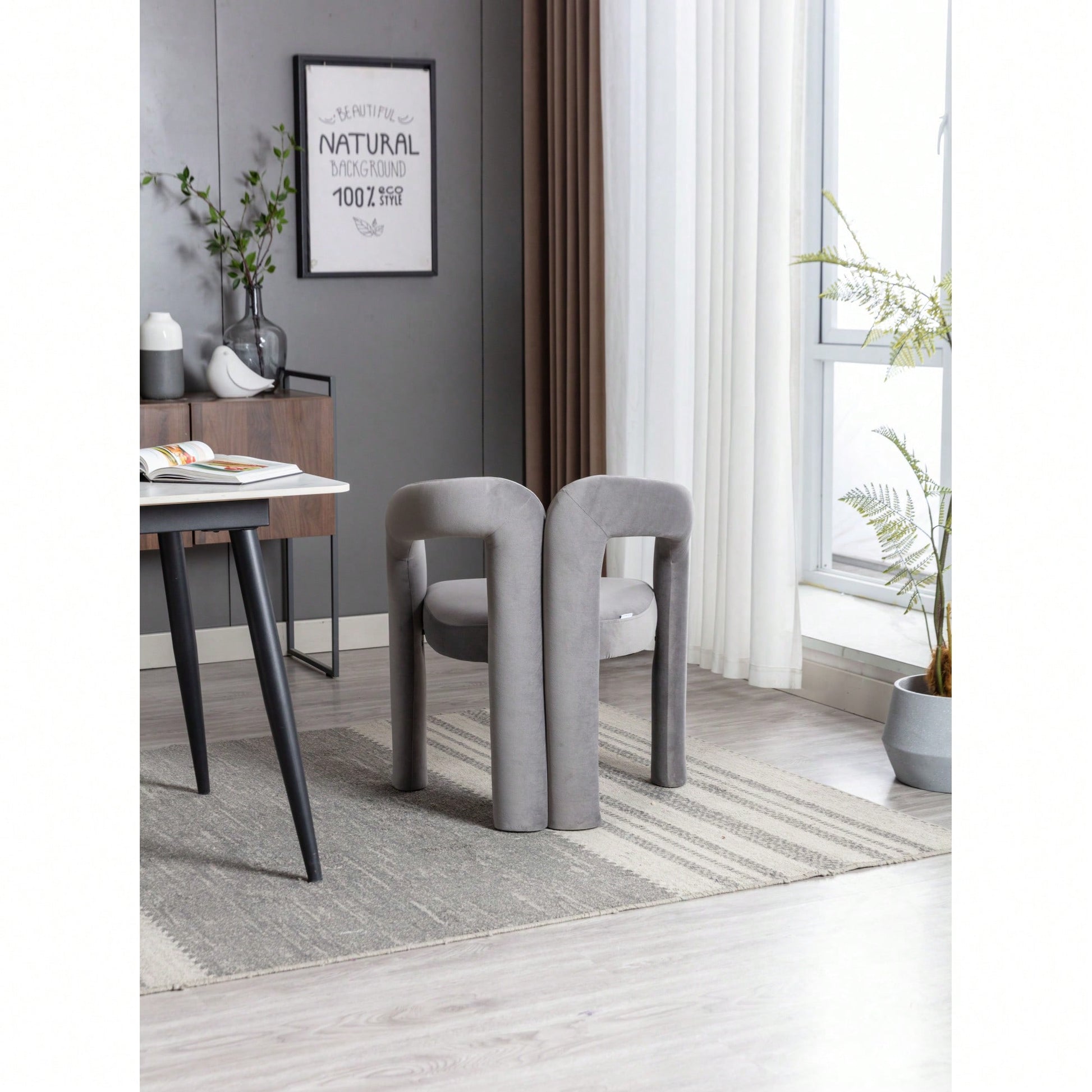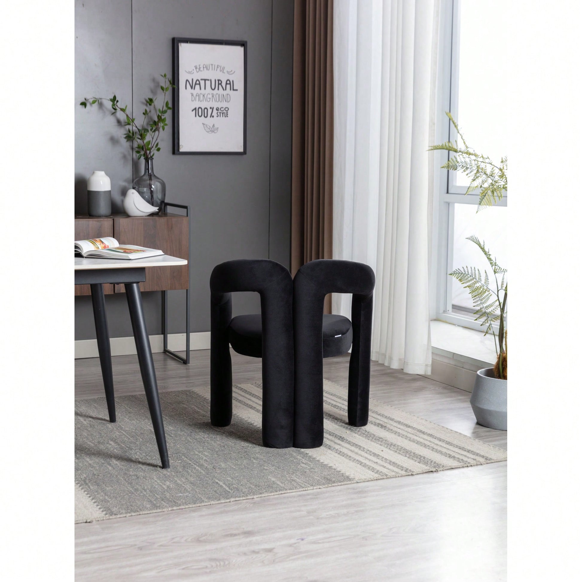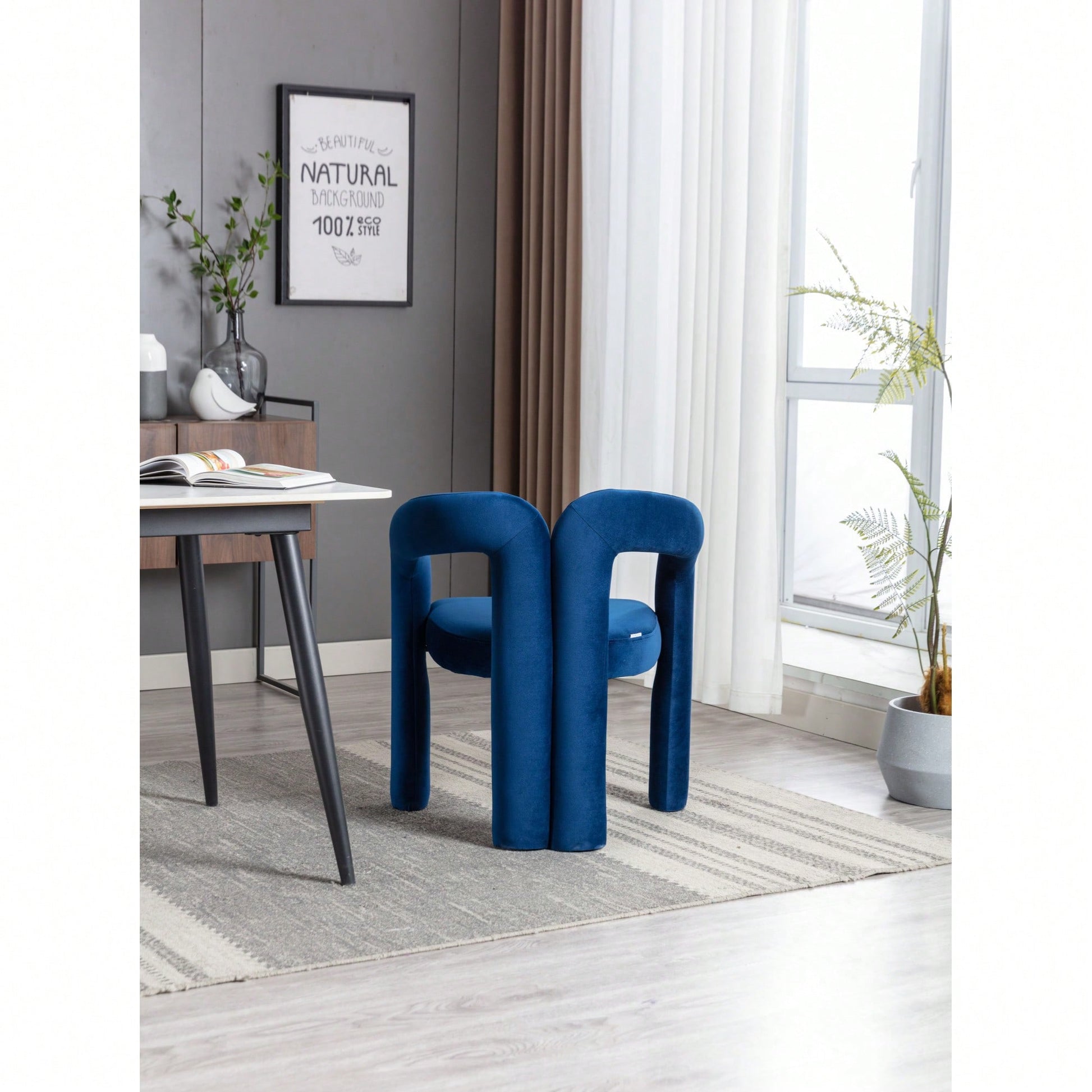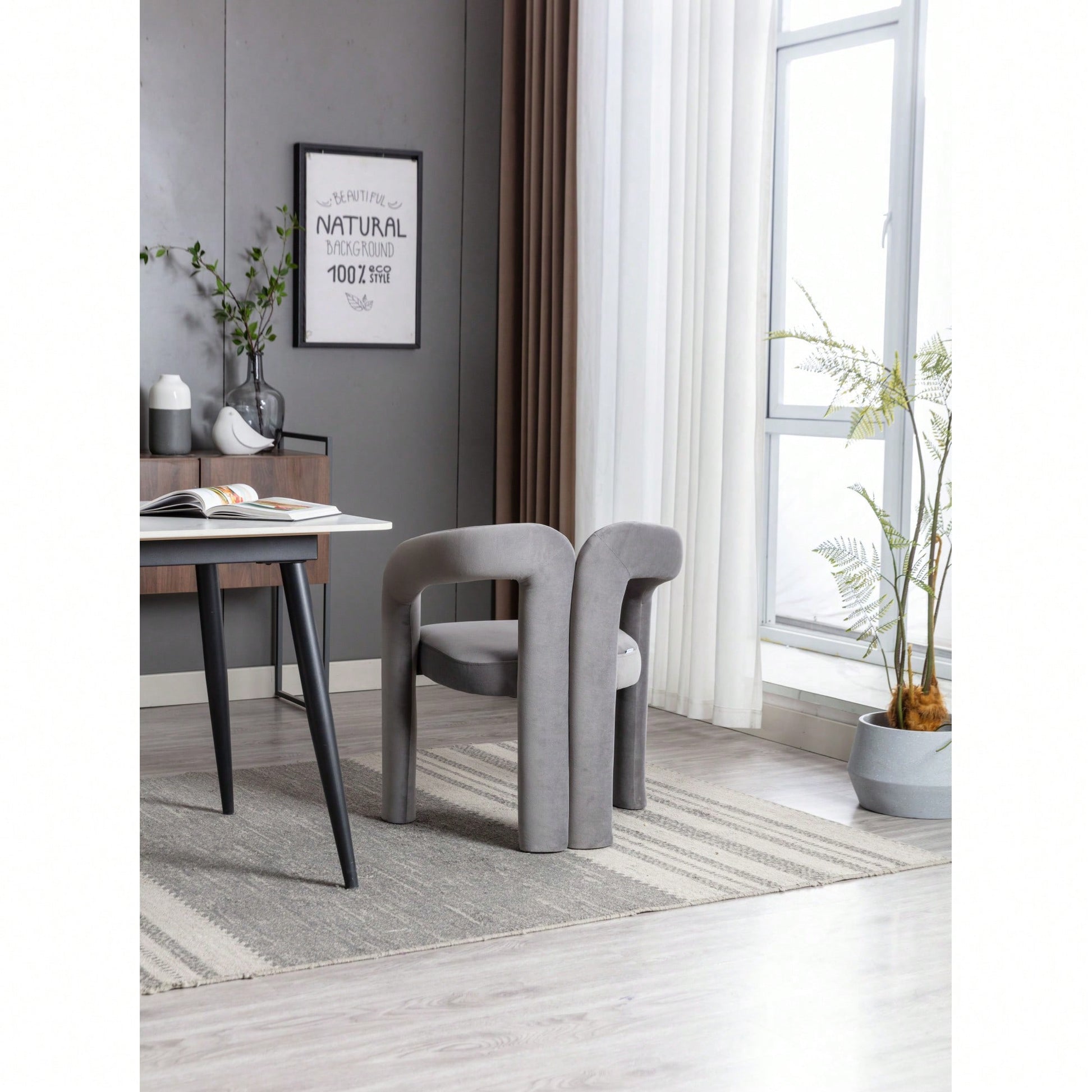 This contemporary velvet upholstered accent chair features a sleek design with a curved circular backrest, making it a perfect addition to any living room, dining room, or home office. The soft velvet fabric wraps around a round, full seat, providing exceptional comfort for dinner parties or family gatherings. The chair is filled with high-density foam for added support and comes with wooden leg warmers for stability. Assembly is straightforward, allowing anyone to set it up easily.