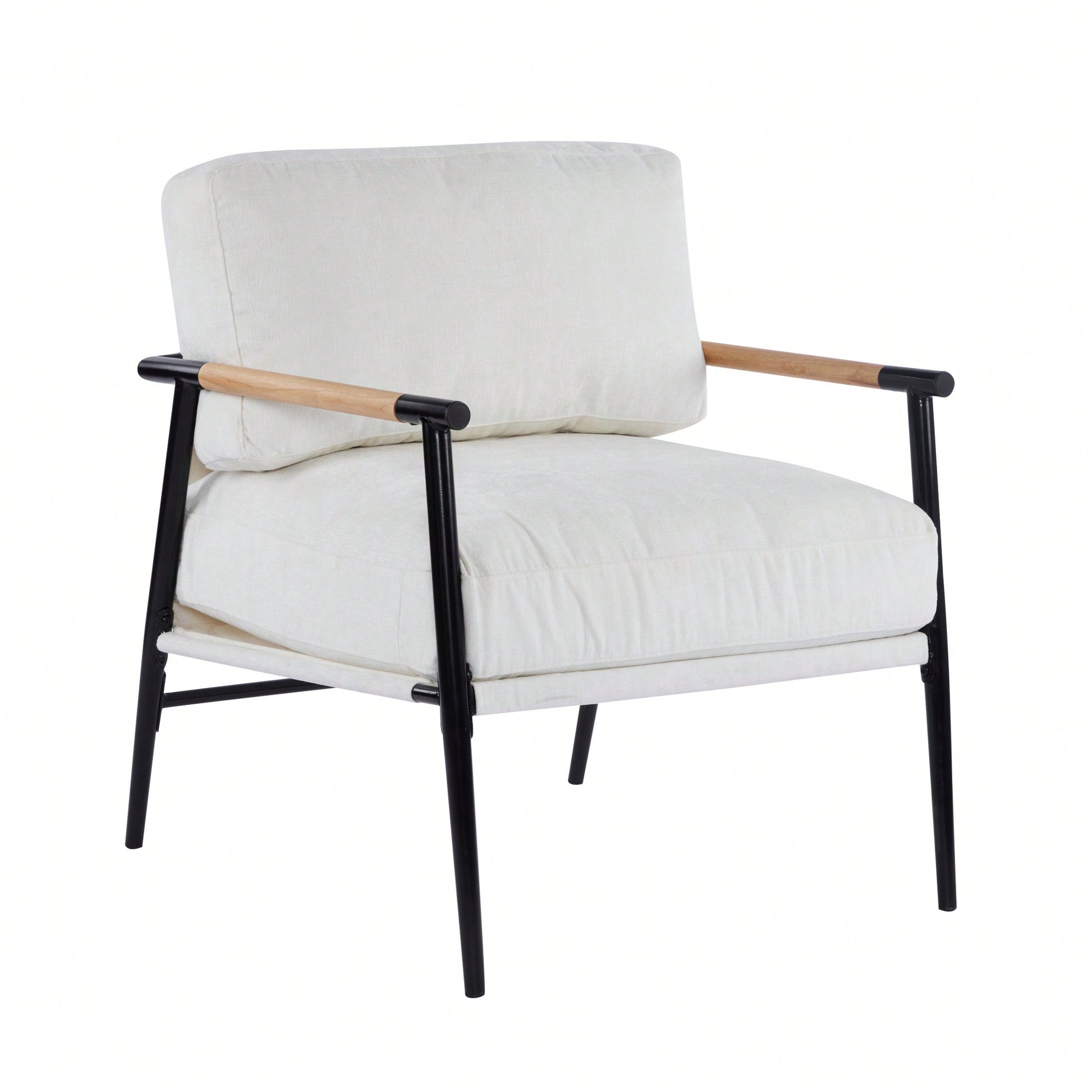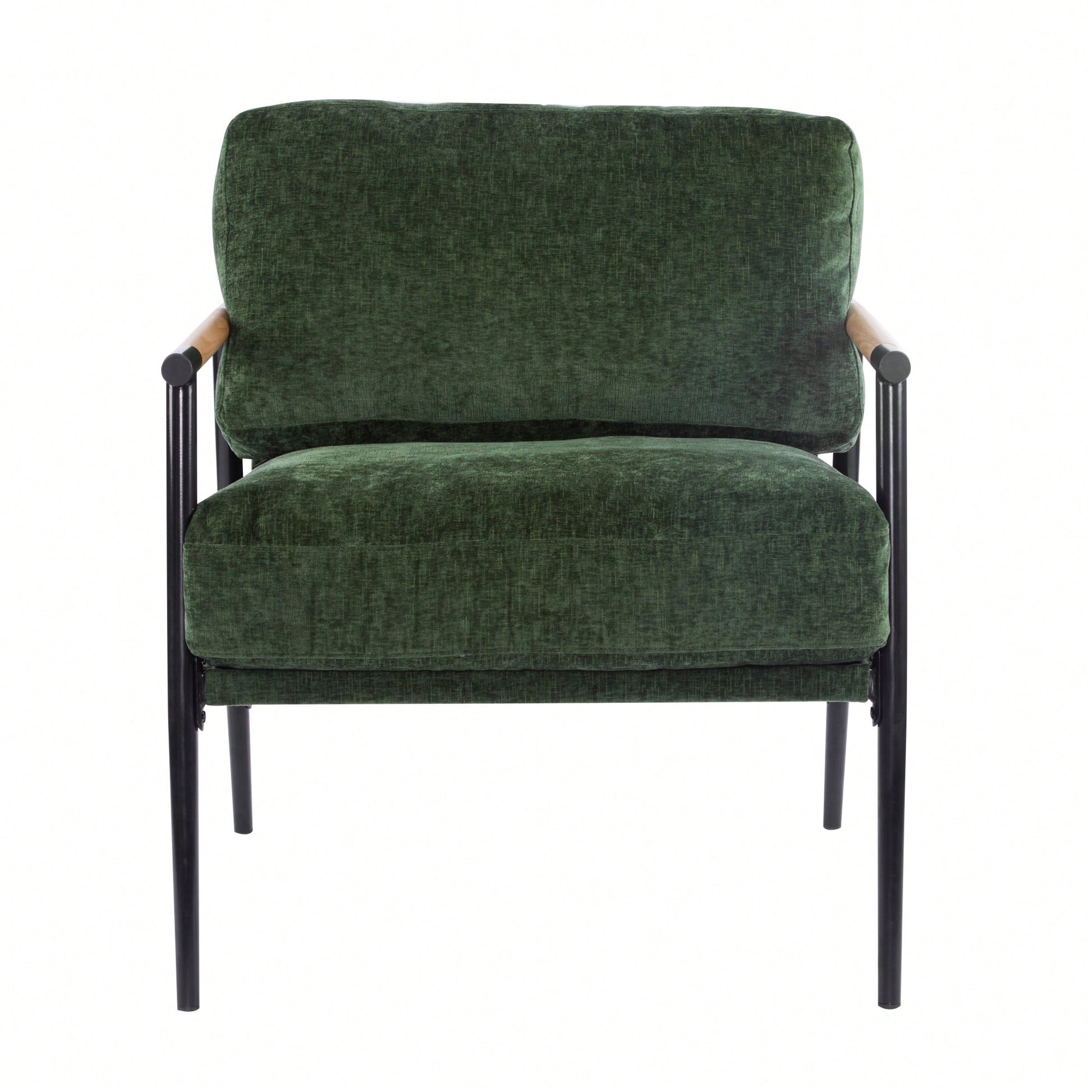 This modern accent chair is the perfect addition to any living room, bedroom, or office. Its contemporary elegance is showcased through a minimalist design that features a black metal frame complemented by natural wood armrests. The plush cushions provide exceptional comfort while maintaining their shape over time. Built with a robust metal frame and high-quality wood accents, this chair is designed for durability. Its versatile style allows it to fit seamlessly into any setting, making it an ideal choice for enhancing your décor.