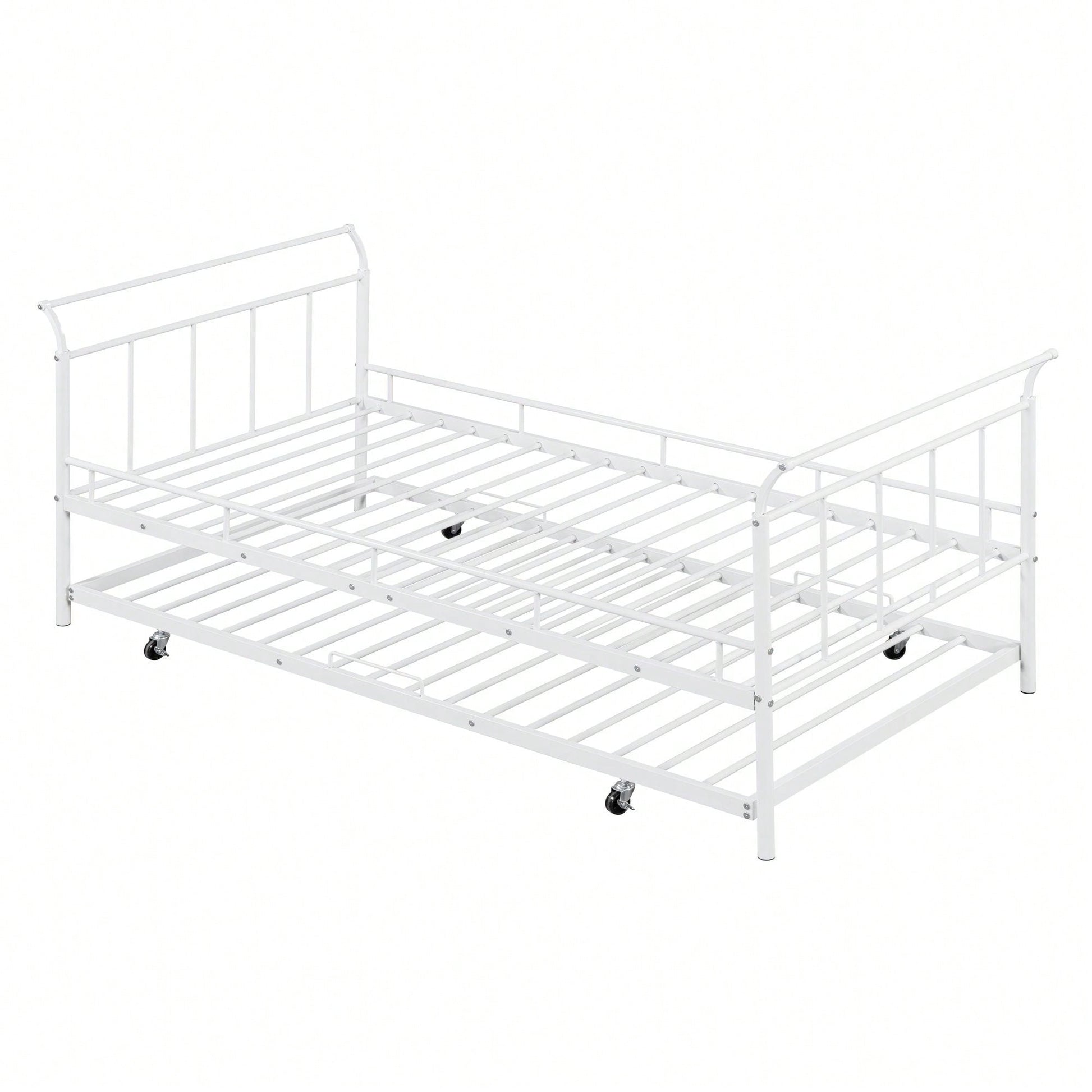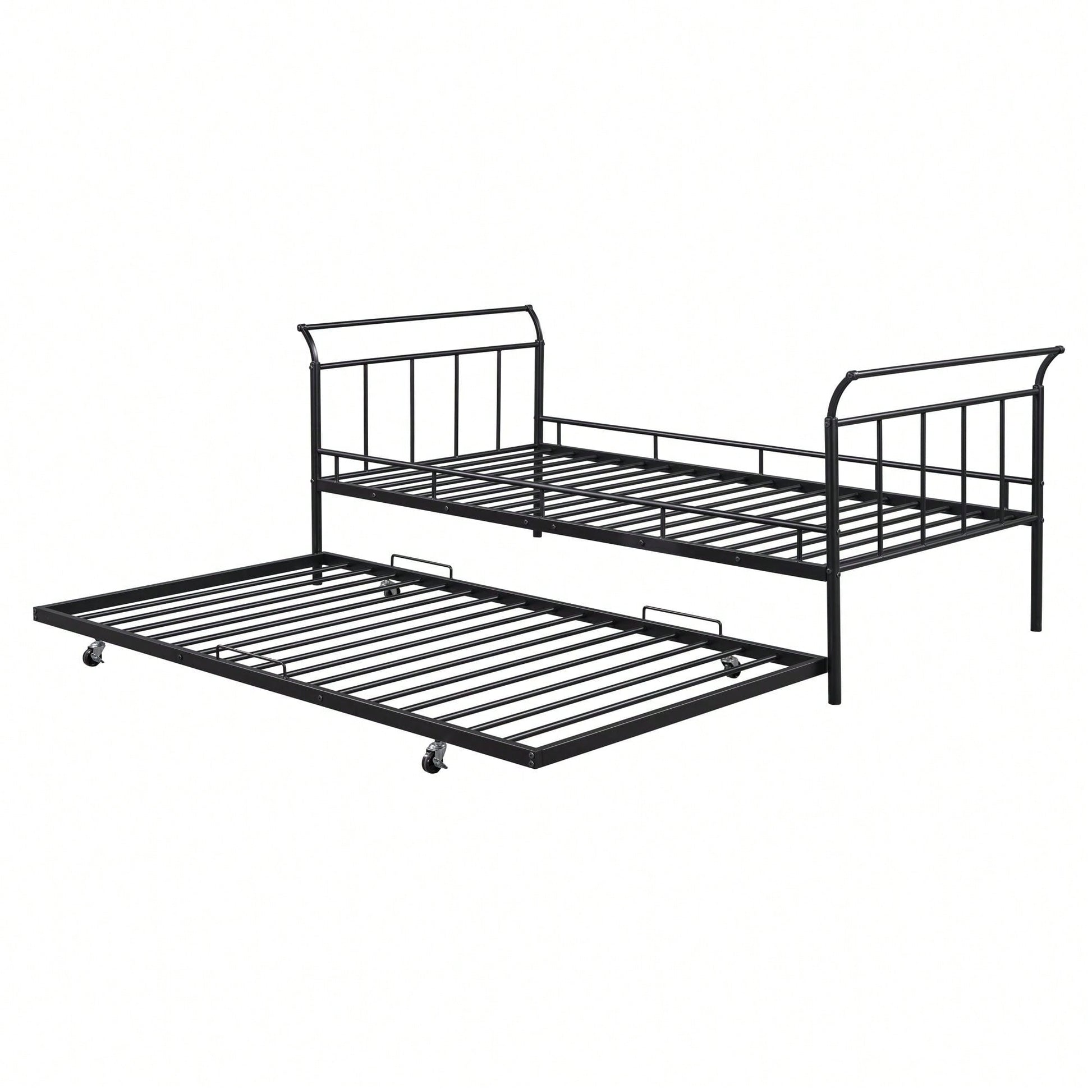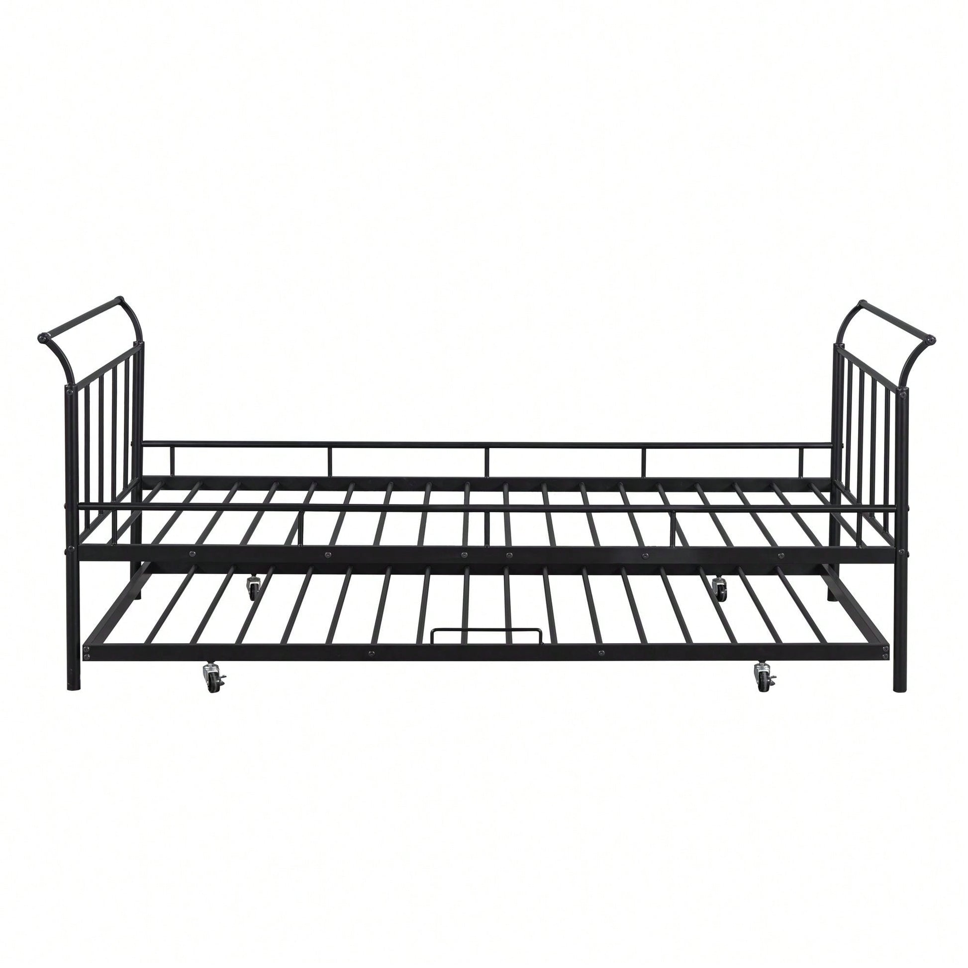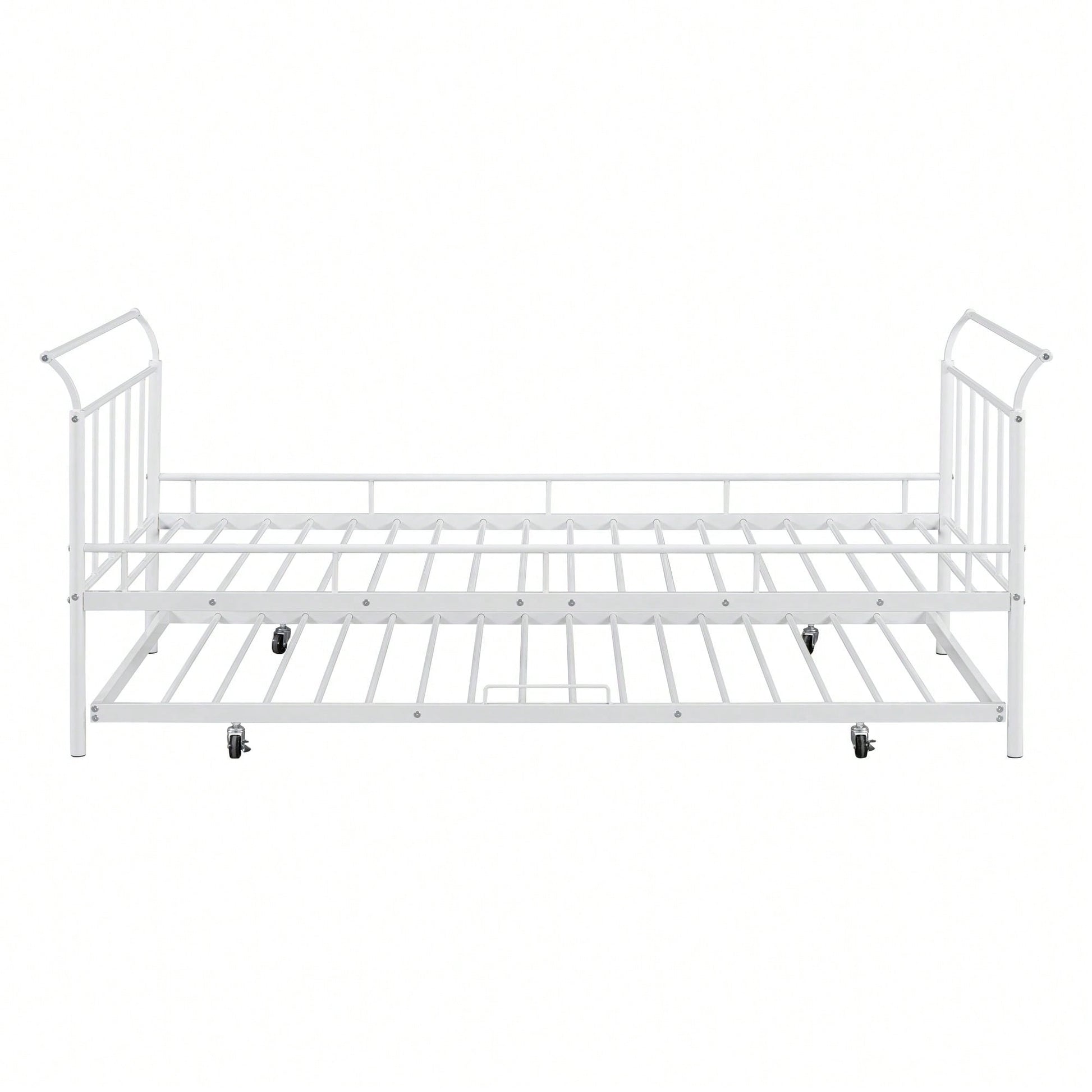 Curved Handle Design, Twin Size Trundle Bed, Durable Iron Construction, No Box Spring Needed