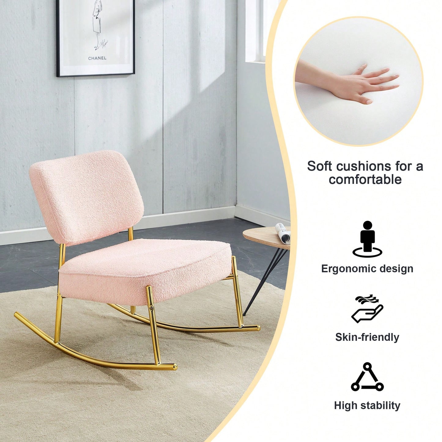 1. velvet material cushioned rocking chair, unique rocking chair, cushioned seat, pink backrest rocking chair, and golden metal legs.