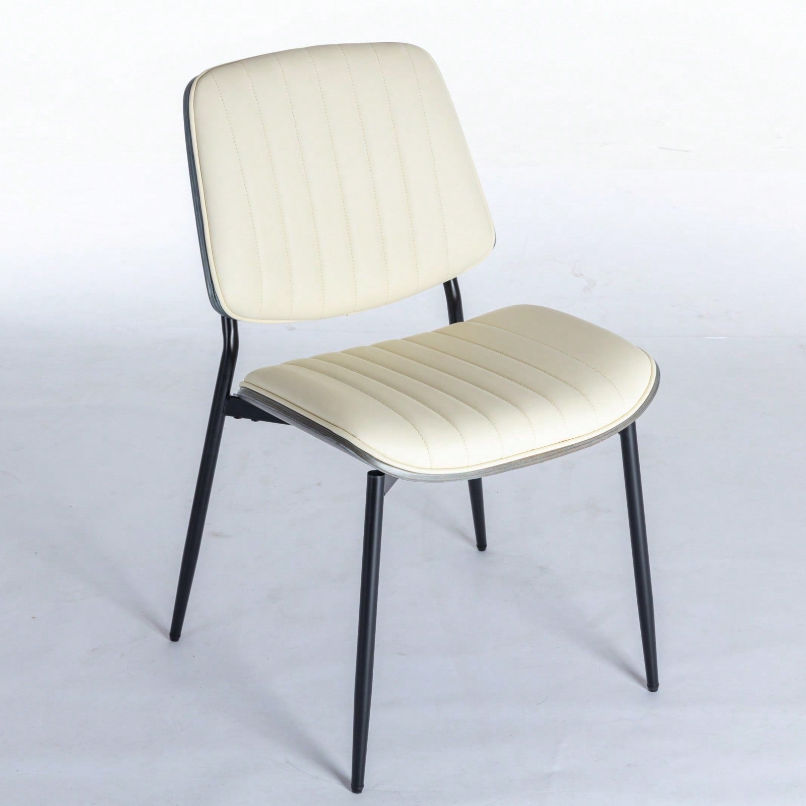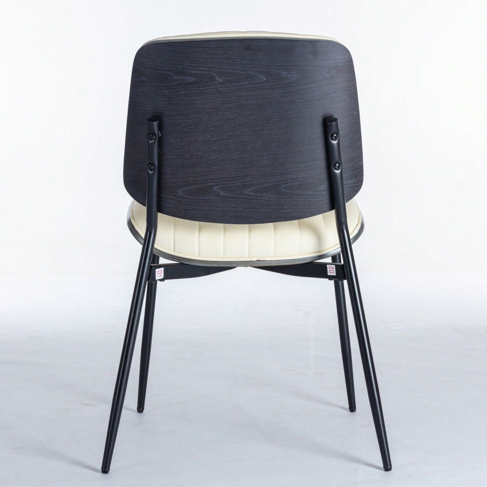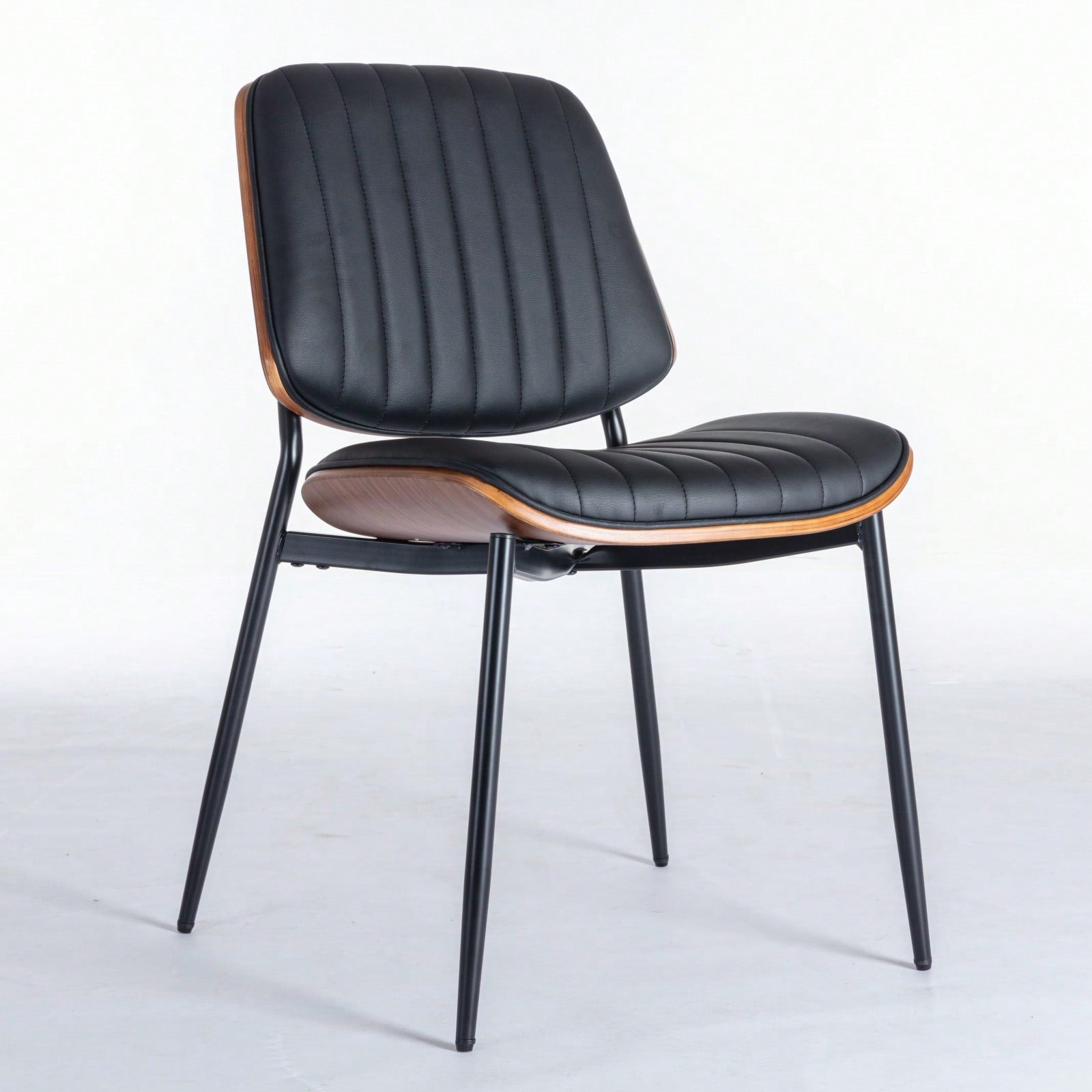 This mid-century style dining chair exudes an elegant and generous appearance that adds a touch of sophistication to any home or office. With a walnut bentwood and faux leather back and seat, this chair combines durability with style. The metal tapered legs ensure longevity and stability. The soft backrest, with its curved wrap and ergonomic design, provides both comfort and support. The wider and deeper leg spacing further enhances the stability of the chair, making it a practical and stylish addition to any dining room or kitchen.