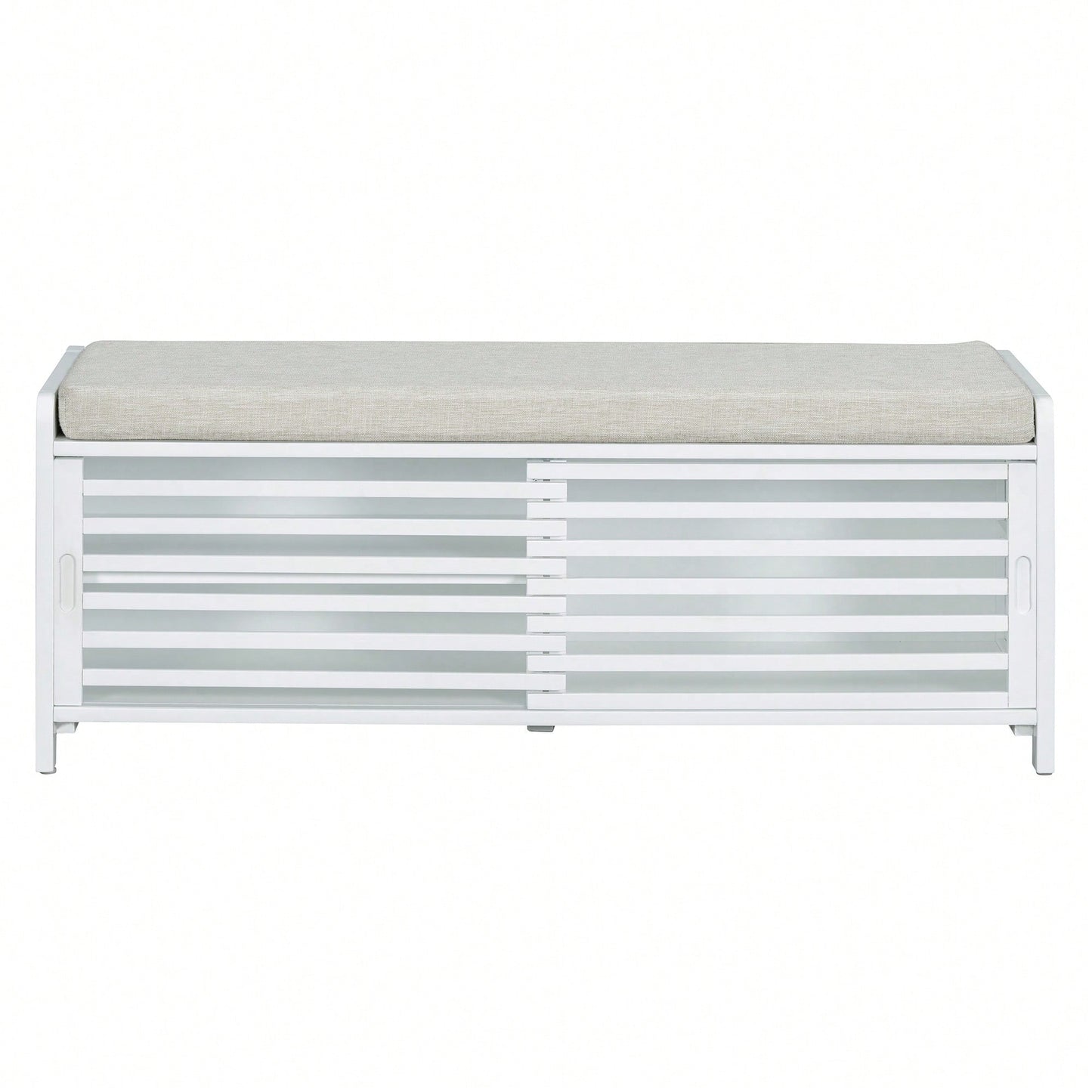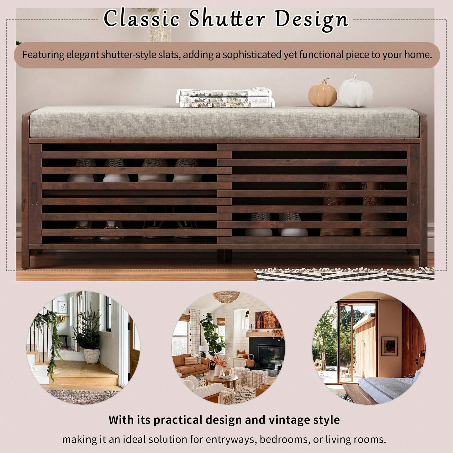 **Key Features:** - Classic shutter-style design adds retro charm to any space - Made from high-quality MDF with an acacia veneer surface for durability - Supports up to 220 LBS on the seat, 15 LBS on the shelf, and 50 LBS on the bottom shelf - Ample storage space for shoes, toys, and household items beneath the seat - Versatile use in entryways, bedrooms, or living rooms **Product Description:** This distressed shutter storage bench combines elegance with practicality, featuring a timeless shutter design that enhances both rustic and vintage-inspired interiors. Crafted from a premium blend of MDF and acacia veneer, this bench ensures long-lasting durability while showcasing the natural beauty of wood grain. The dual-purpose design not only provides a comfortable seating area but also ample storage for various items, making it an ideal addition to any home. Its versatile style allows it to seamlessly fit into different spaces, whether in a hallway, bedroom, or living room. **Specifications:** - Seat Capacity: 220 LBS - Shelf Capacity: 15 LBS - Bottom Shelf Capacity: 50 LBS - Available Colors: White, Grey, Espresso, Navy, White Washed - Assembly: Full assembly required with detailed instructions provided