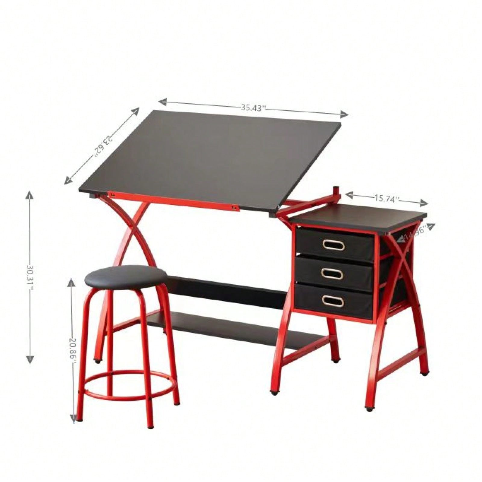 This drafting table in red comes with a stool for added comfort and convenience. Its adjustable desktop allows for easy customization, while the three storage drawers provide ample space for stationery and other items. The large desktop provides plenty of room for working on various projects. The crossed legs design ensures stability, making it a reliable option for artists and drafters alike.