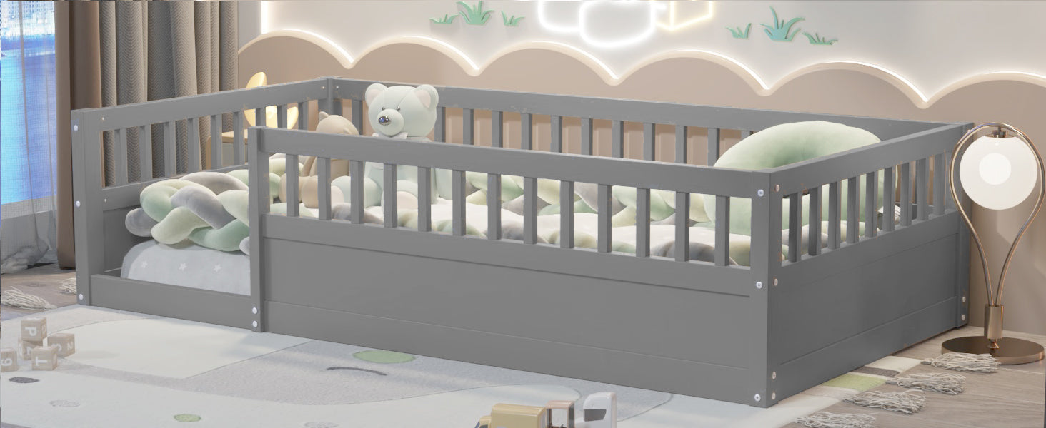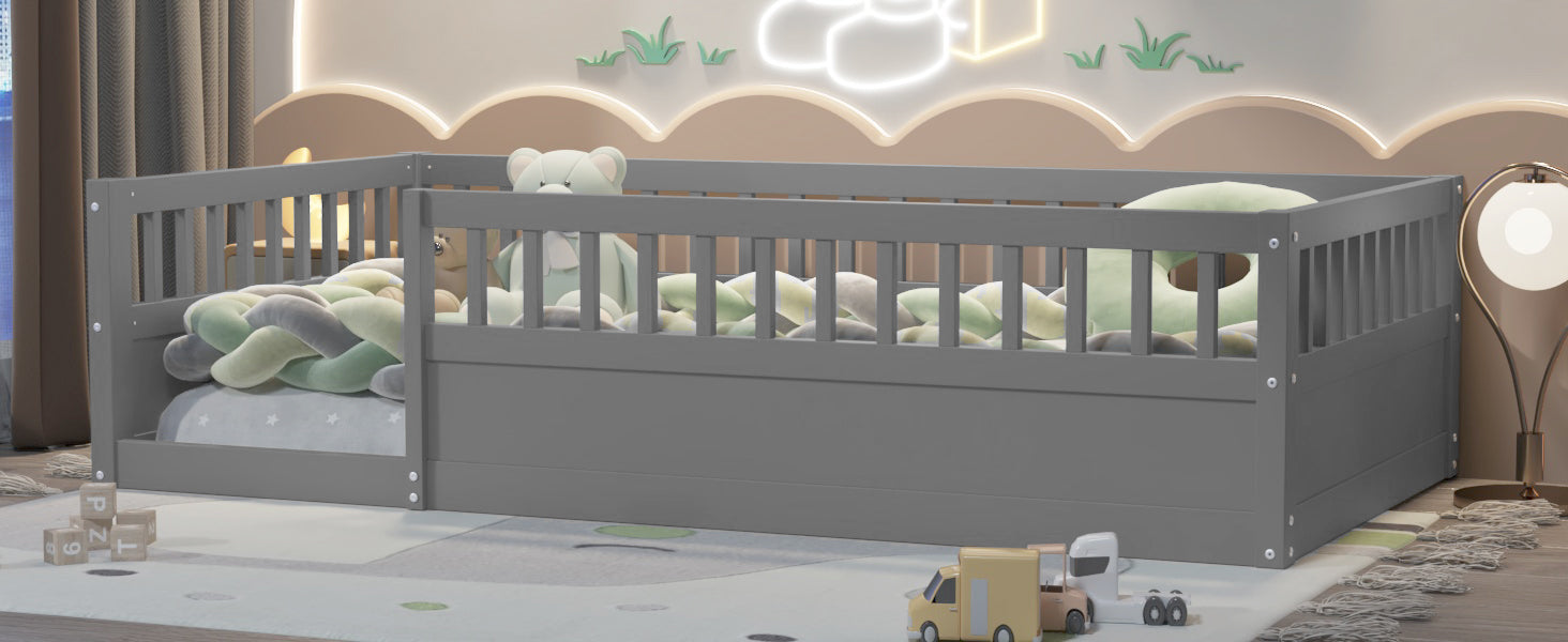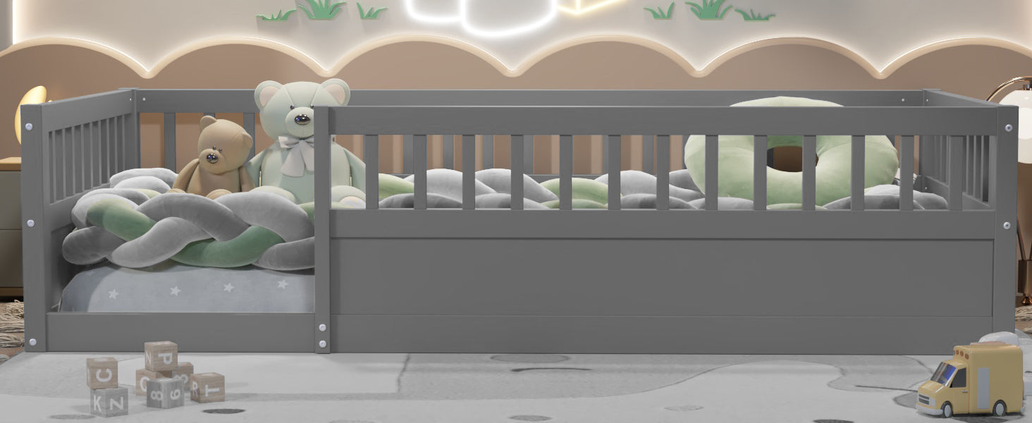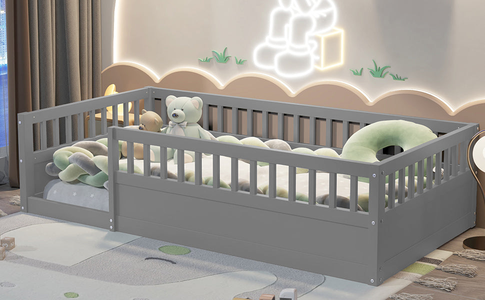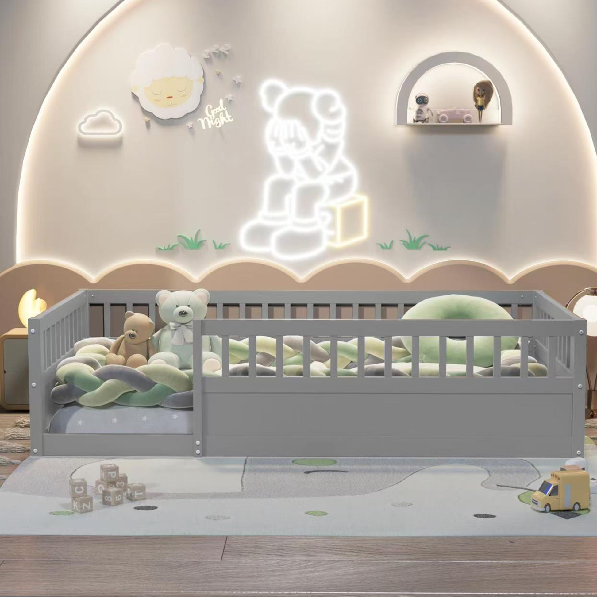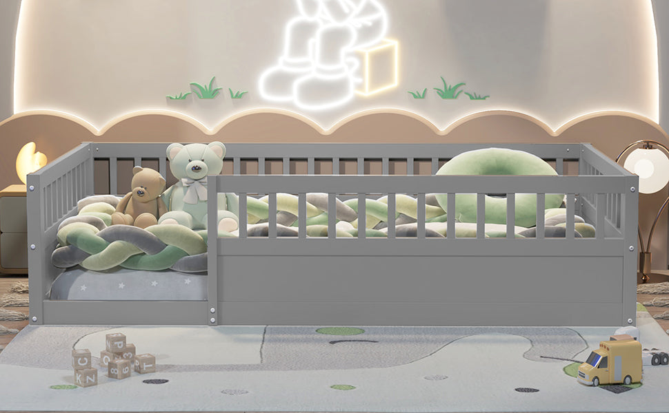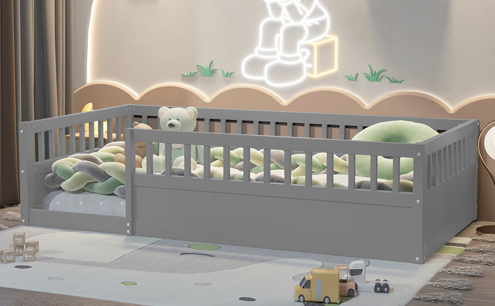 Twin Floor Bed Frame with Fence, Wood Kids Floor Beds Frame for Bedroom Playroom,Gray(Expect arrive date Jun. 21st)