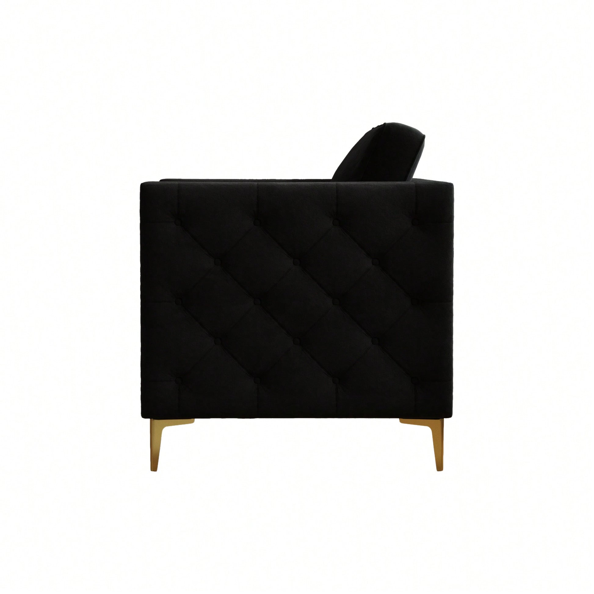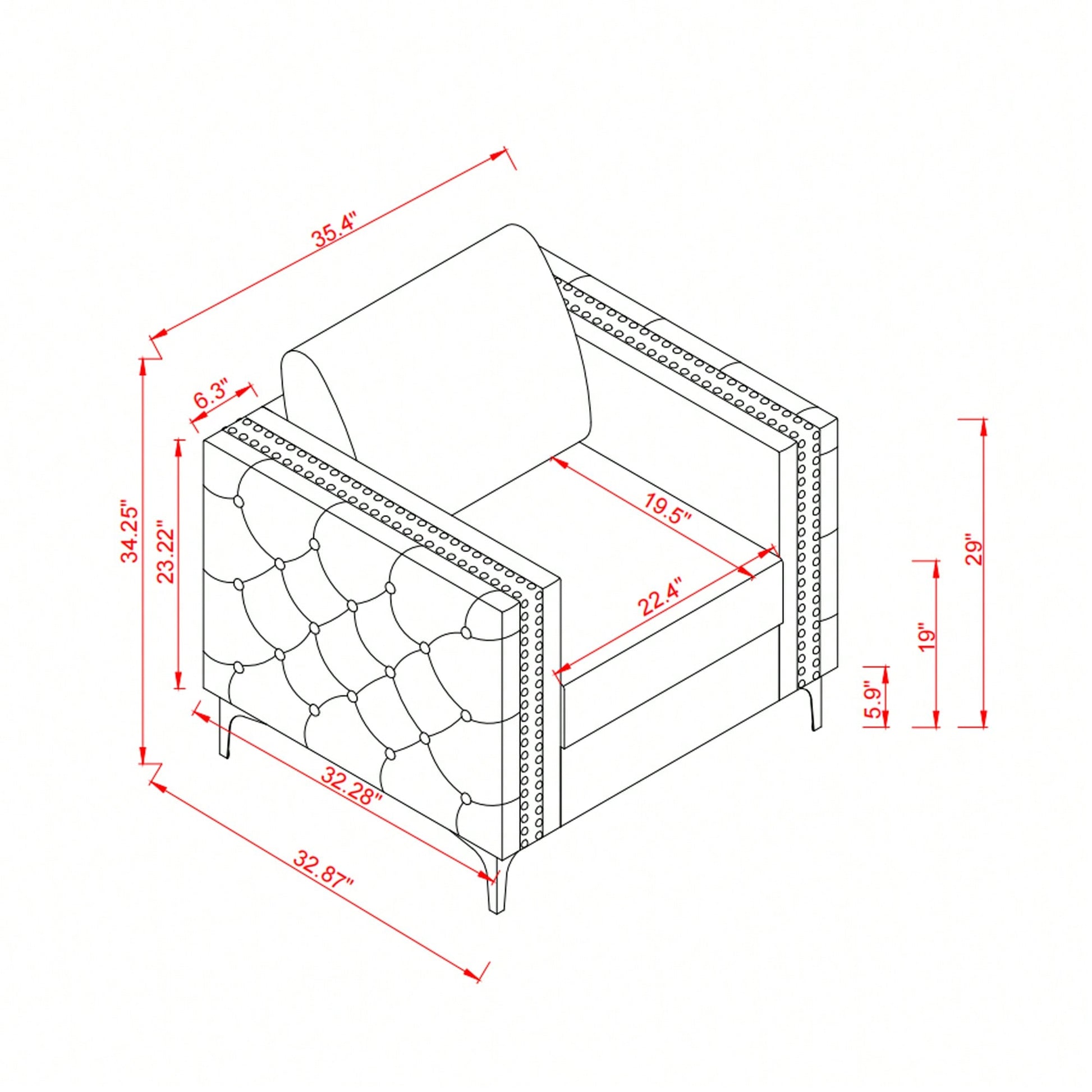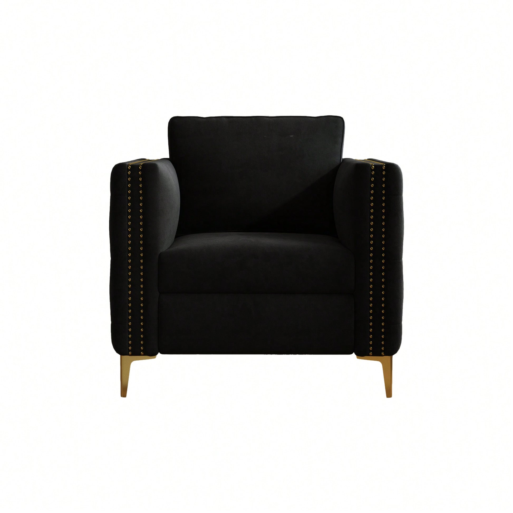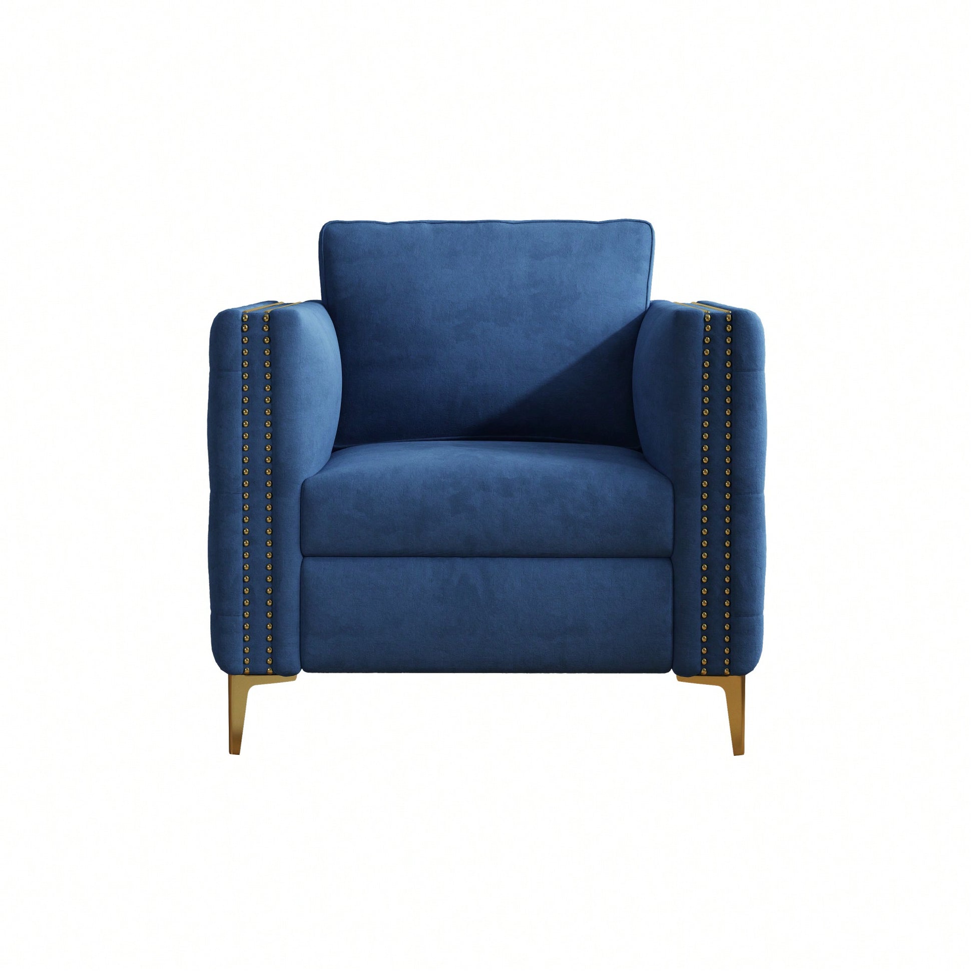 This accent chair combines classic and fashionable elements, making it a perfect addition to any home decor. The chair features a stylish design with rivets and button-tufted armrests, enhancing its aesthetic appeal. Upholstered in soft velvet, it provides a luxurious feel while ensuring durability. The seat cushion is designed with a spring pocket coil filling and high-density sponge, offering excellent support and comfort for extended use. Assembly is straightforward, taking approximately 30 minutes for one person to complete. This versatile chair fits seamlessly into living rooms, bedrooms, or any leisure spaces, adding a touch of warmth and elegance to your home.