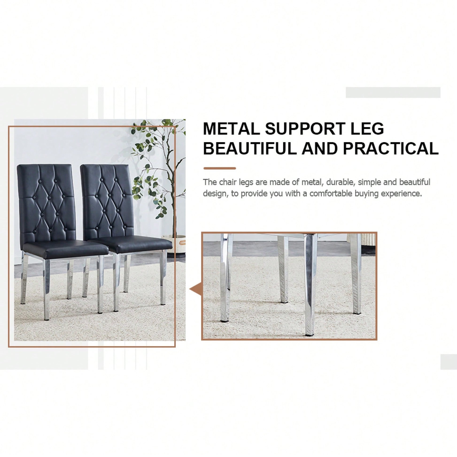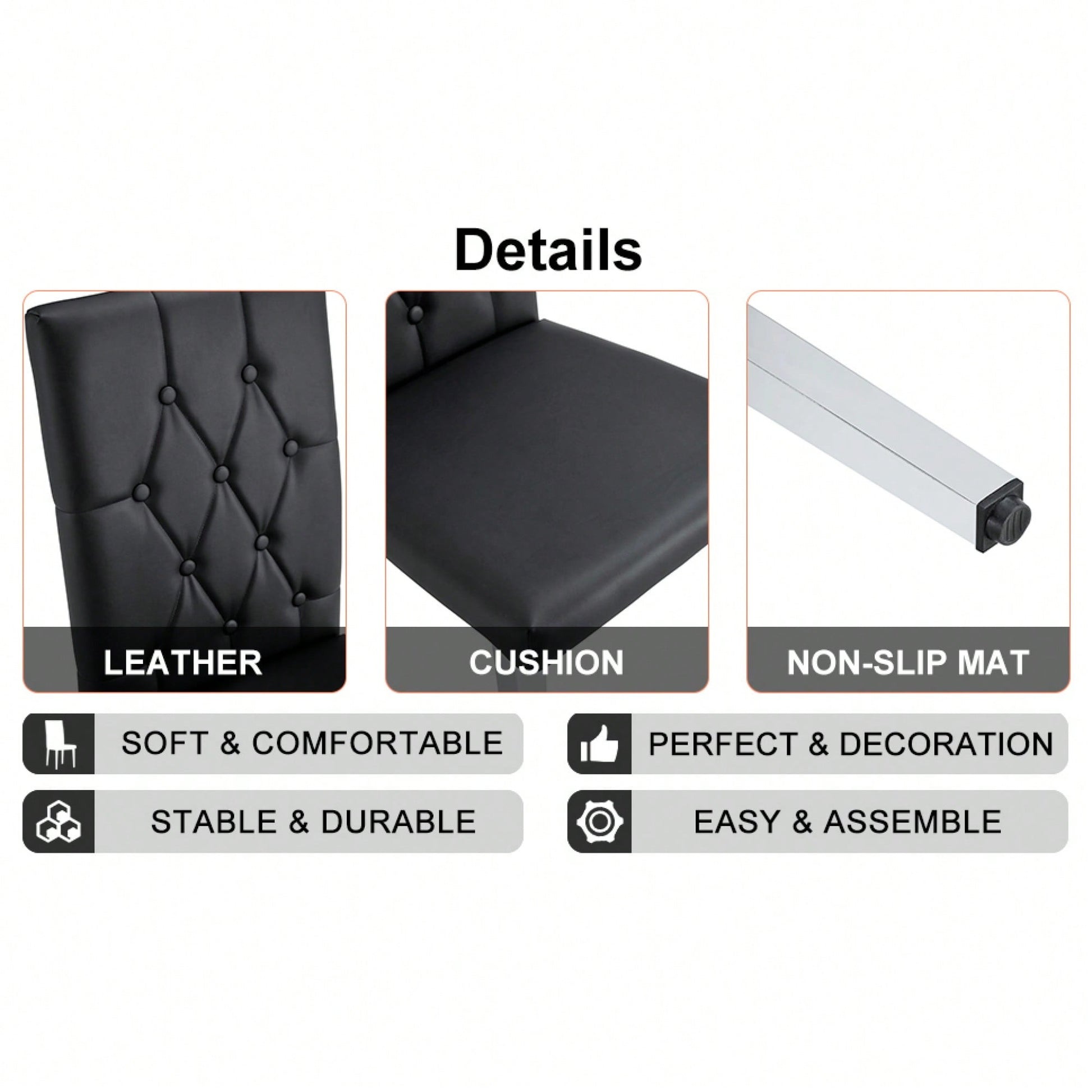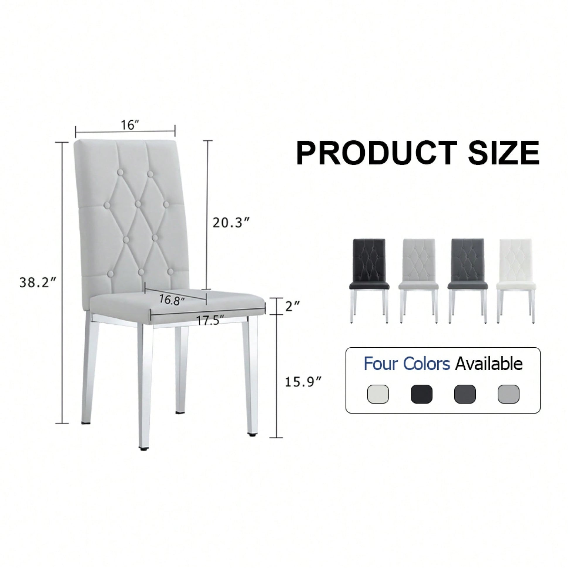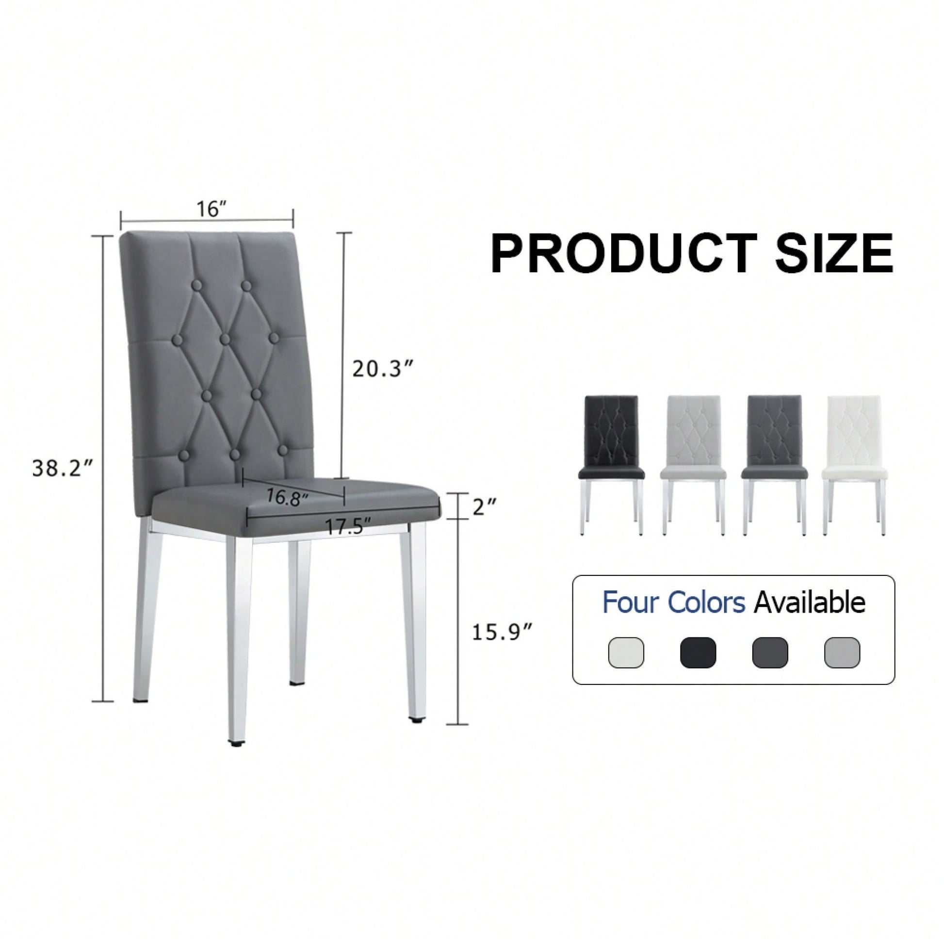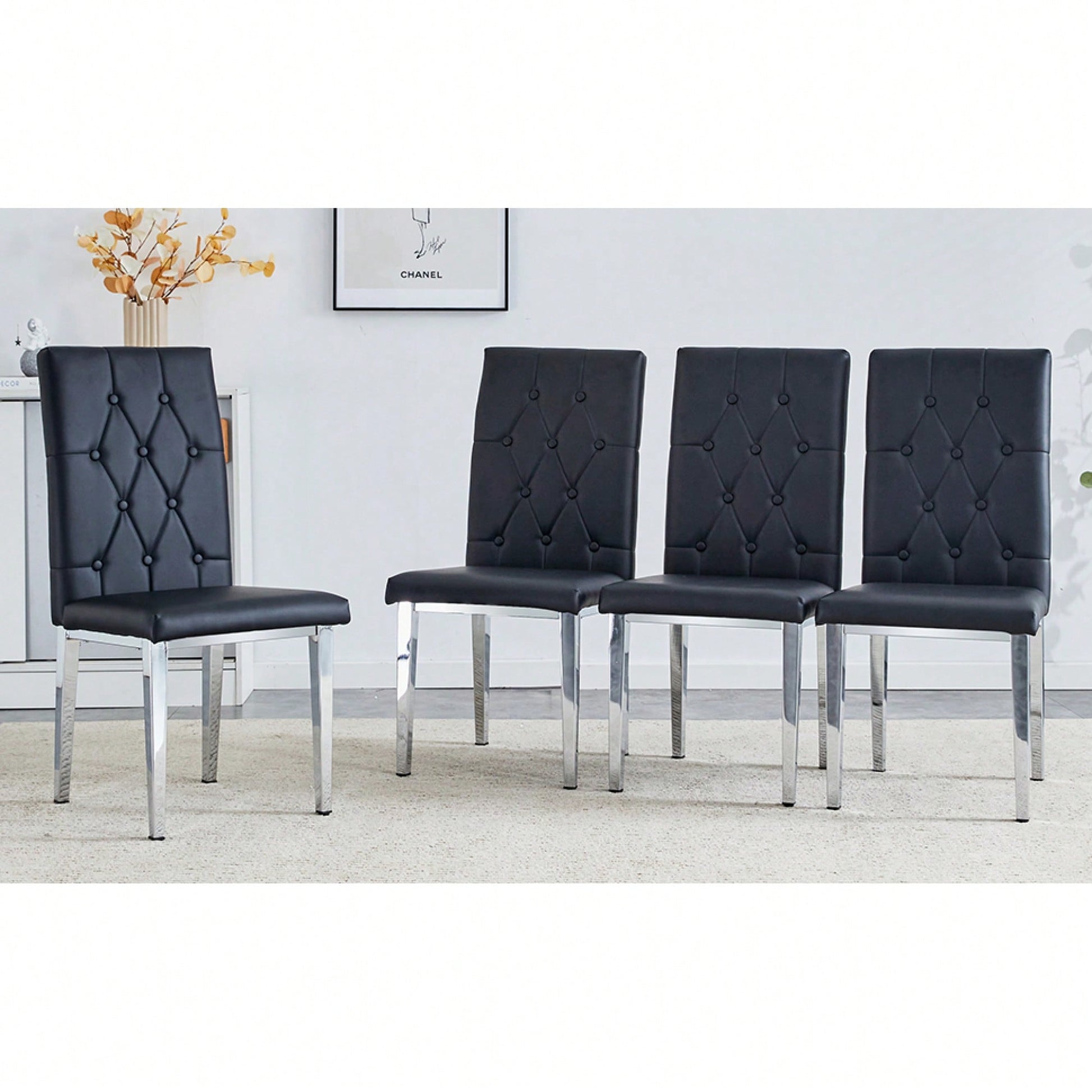 This four-piece set of black armless dining chairs adds elegance and a hint of mystery to your dining space with its deep black tone. The grid quilting and stud detailing create a vintage yet contemporary look, making these chairs a stylish addition to any dining area. Each chair is crafted with meticulous attention to detail, ensuring high-quality workmanship that is evident in both the fabric and metal components. The silver-gray metal legs not only enhance the modern aesthetic but also provide robust support for everyday use. This versatile set is ideal for family meals or gatherings, offering ample seating while maintaining a cohesive and elegant style. Assembly is straightforward, with all necessary tools and instructions included.