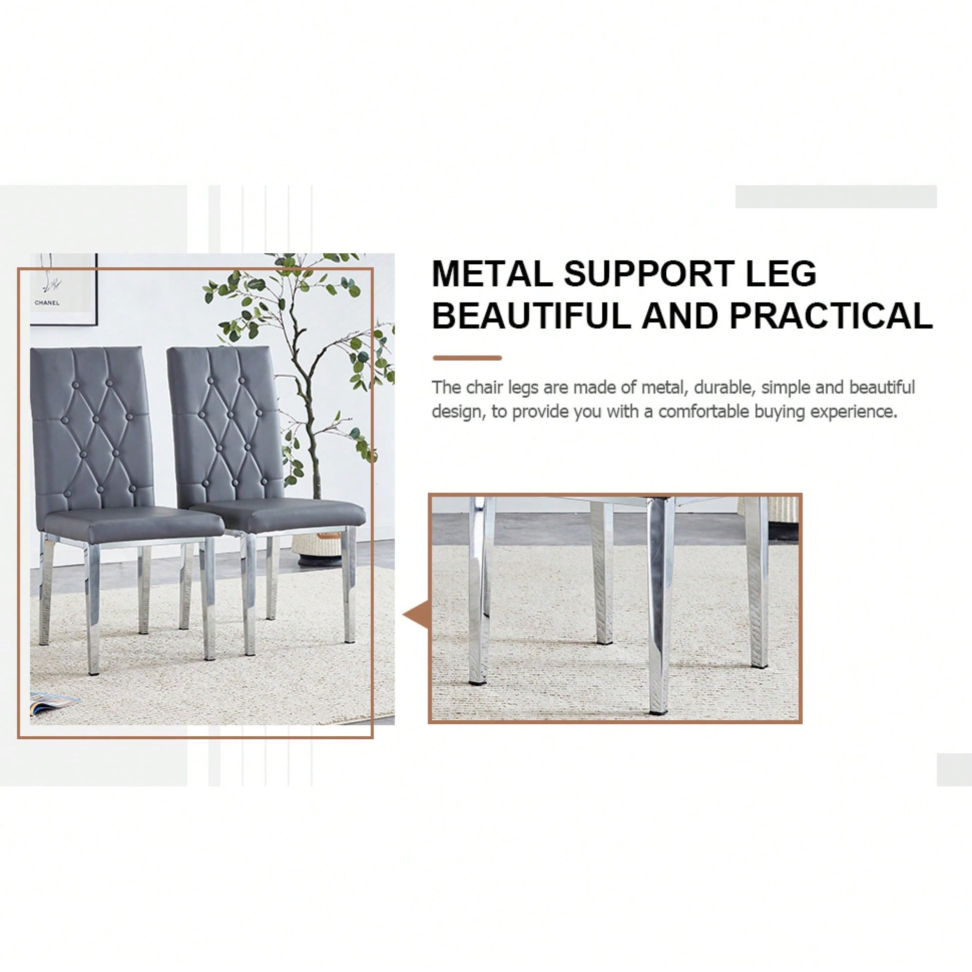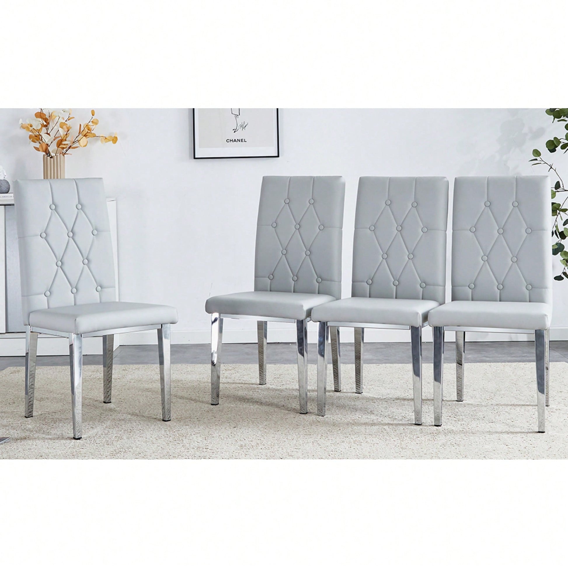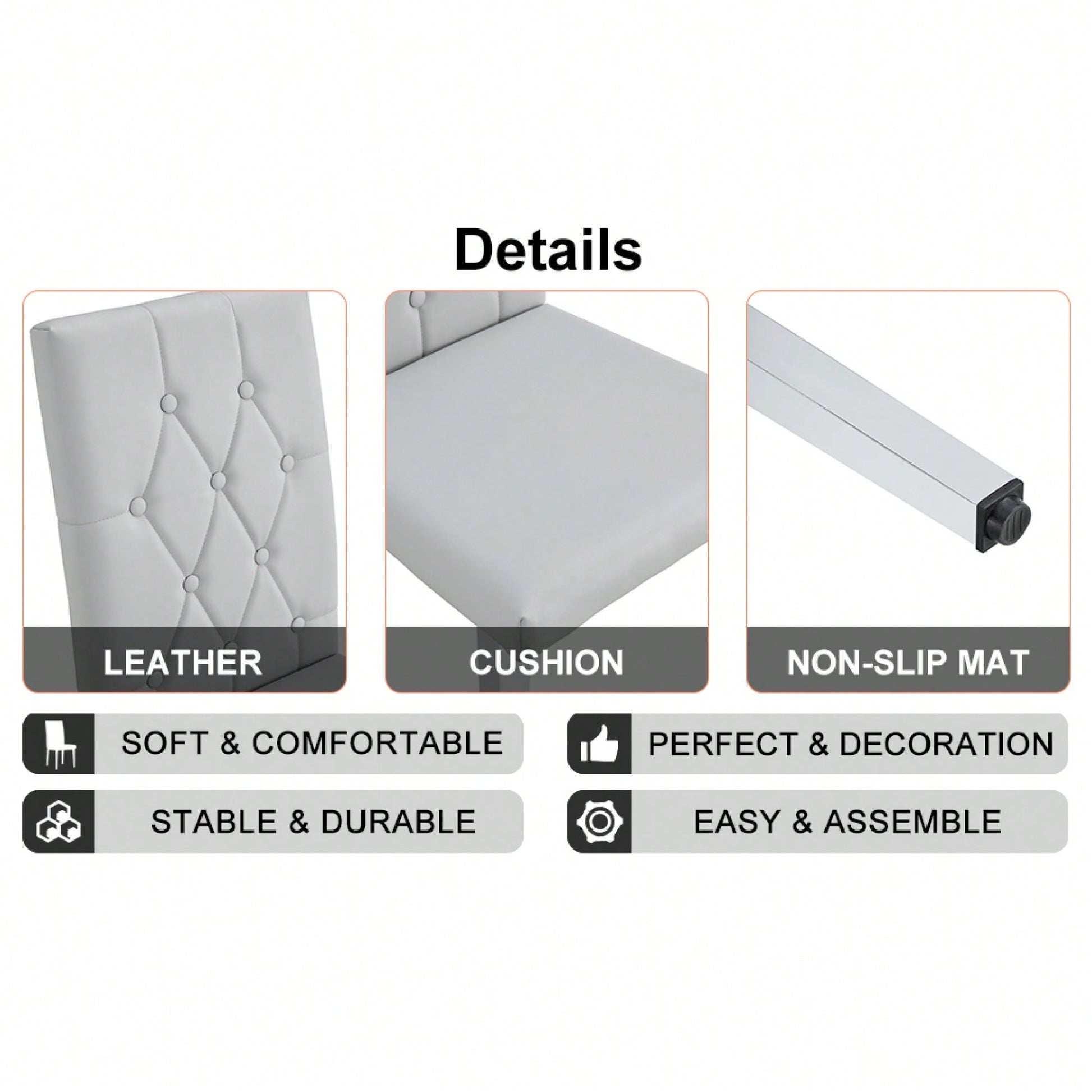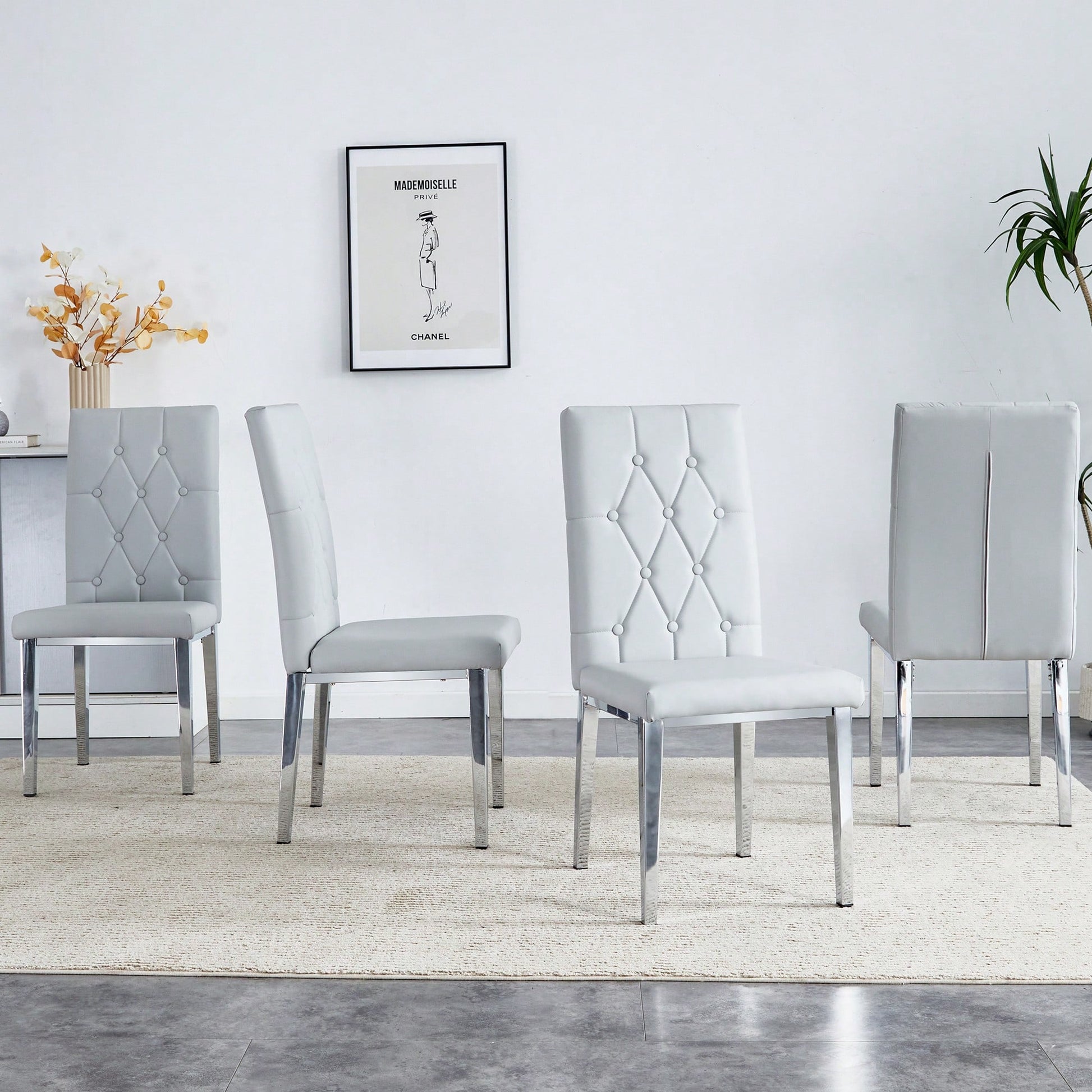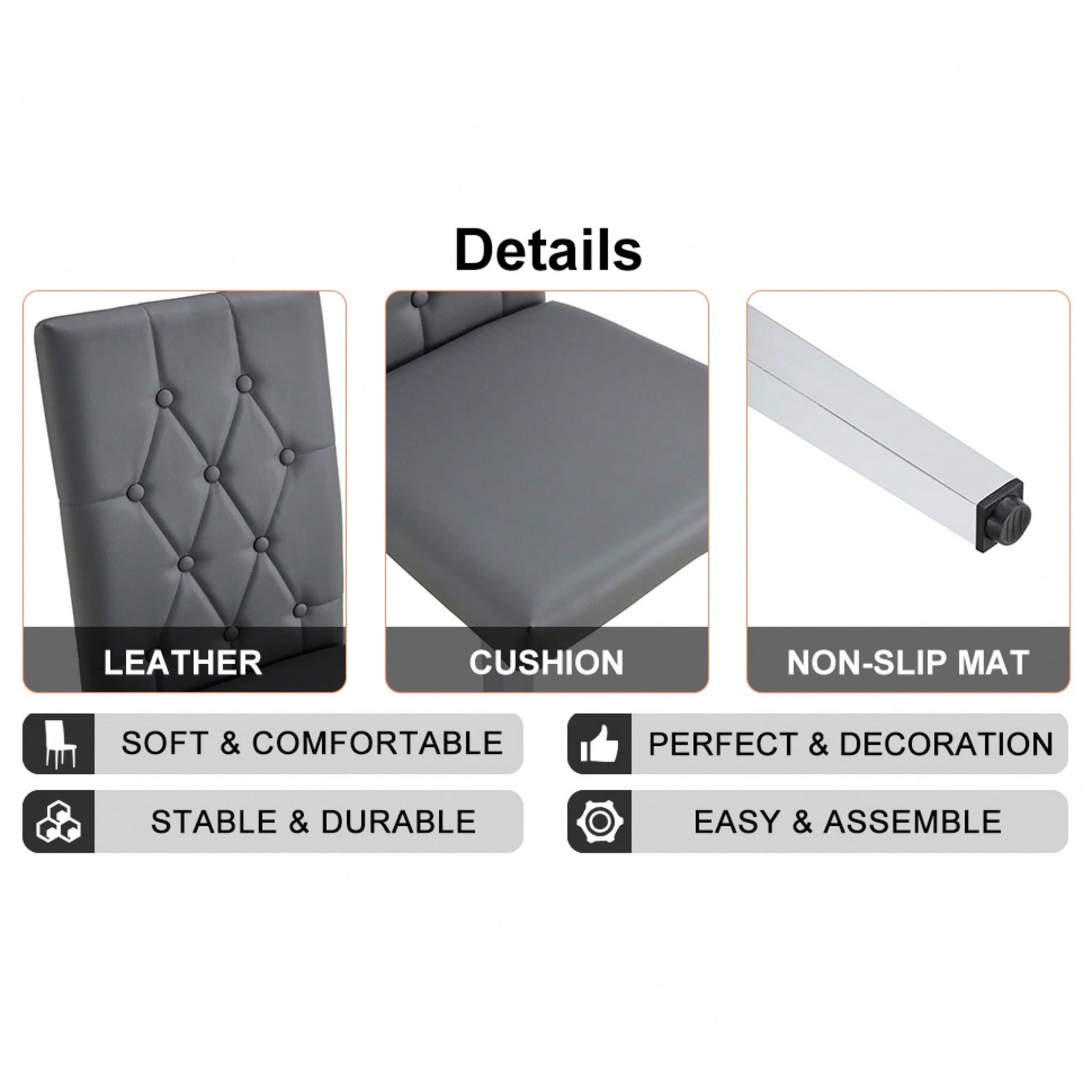This four-piece set of black armless dining chairs adds elegance and a hint of mystery to your dining space with its deep black tone. The grid quilting and stud detailing create a vintage yet contemporary look, making these chairs a stylish addition to any dining area. Each chair is crafted with meticulous attention to detail, ensuring high-quality workmanship that is evident in both the fabric and metal components. The silver-gray metal legs not only enhance the modern aesthetic but also provide robust support for everyday use. This versatile set is ideal for family meals or gatherings, offering ample seating while maintaining a cohesive and elegant style. Assembly is straightforward, with all necessary tools and instructions included.