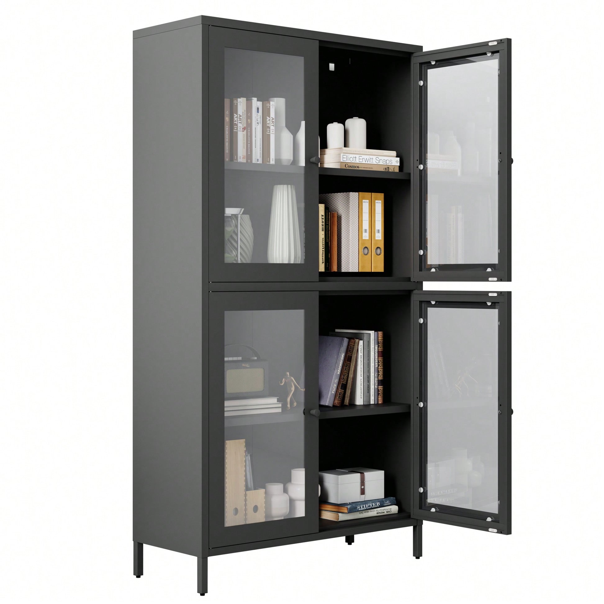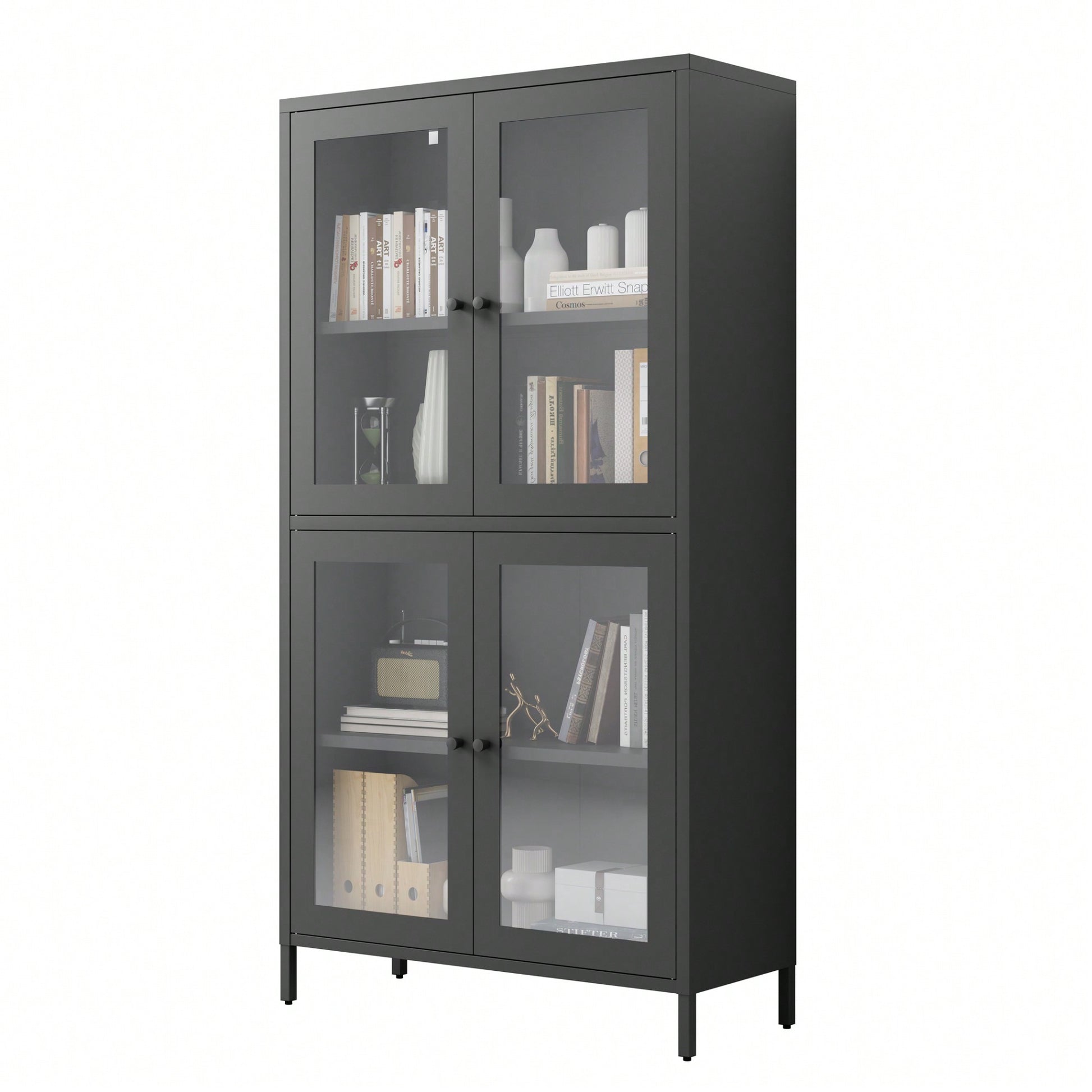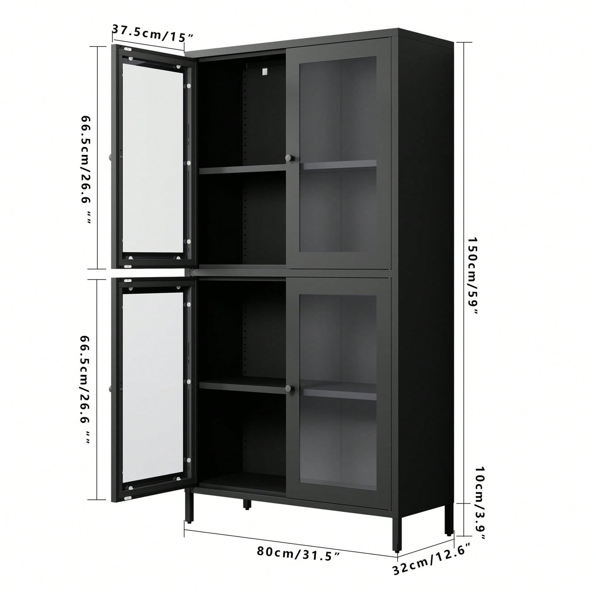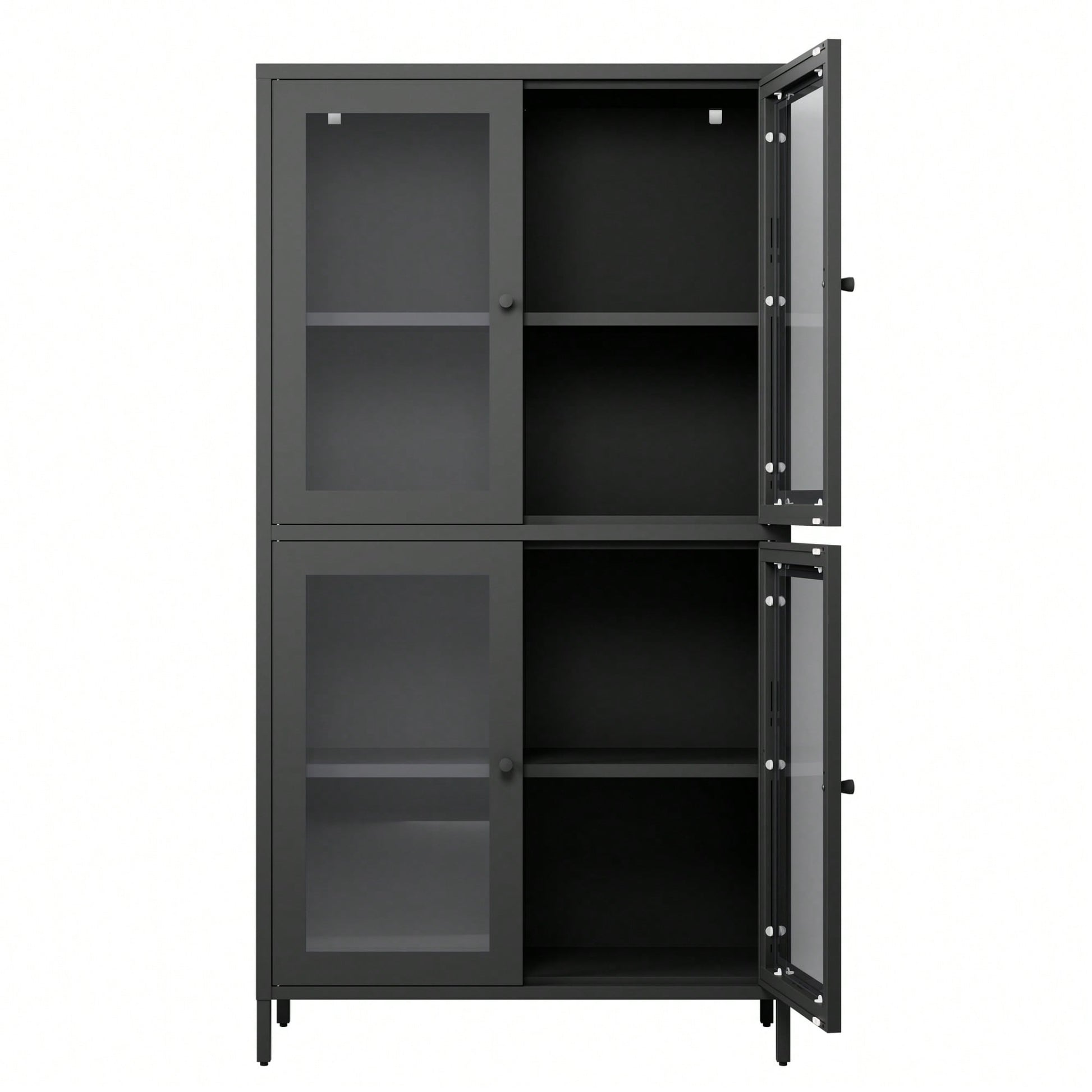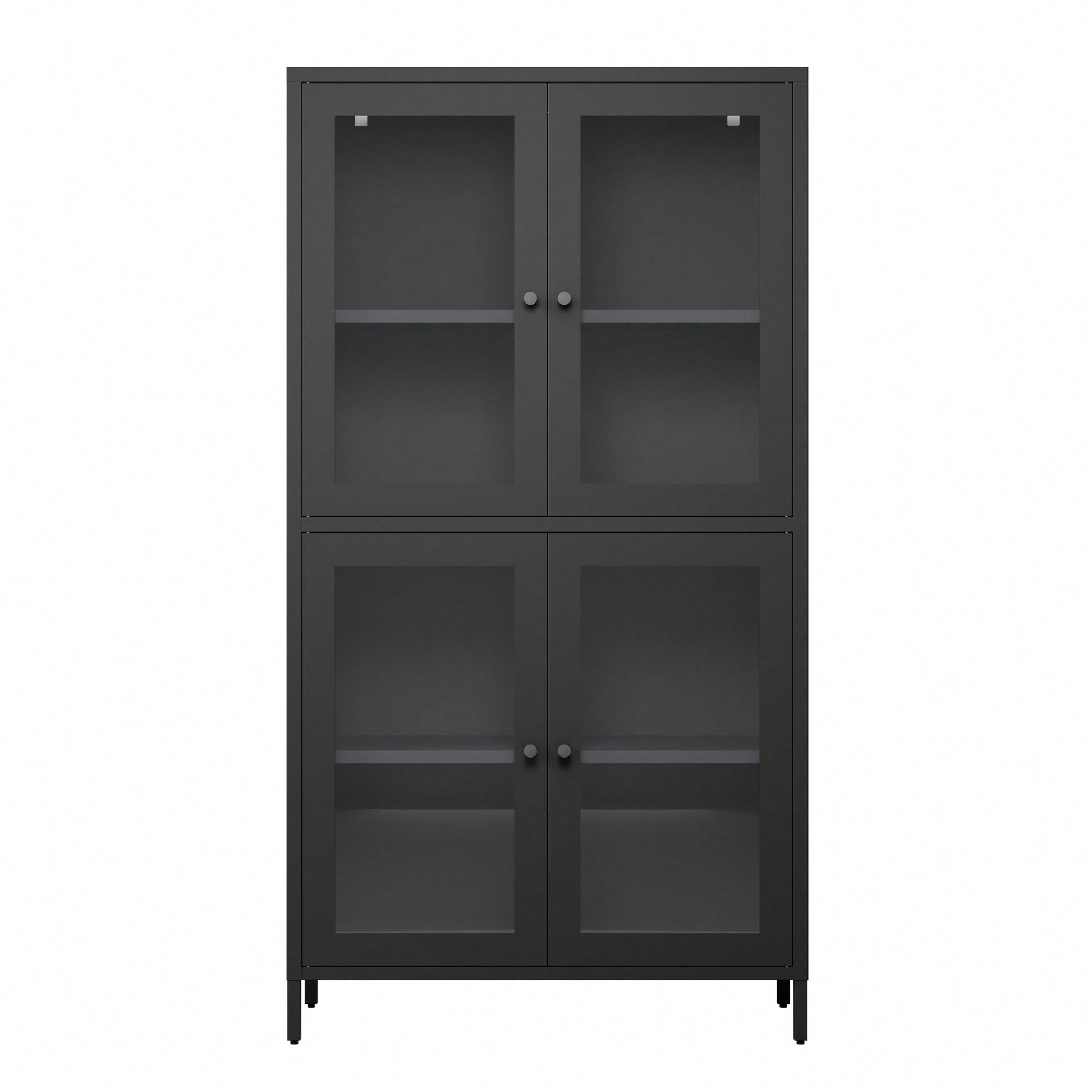 Elegant Black Metal Display Cabinet With 4 Glass Doors And Shelves For Home, Office, Or Living Spaces - Tempered Glass Design