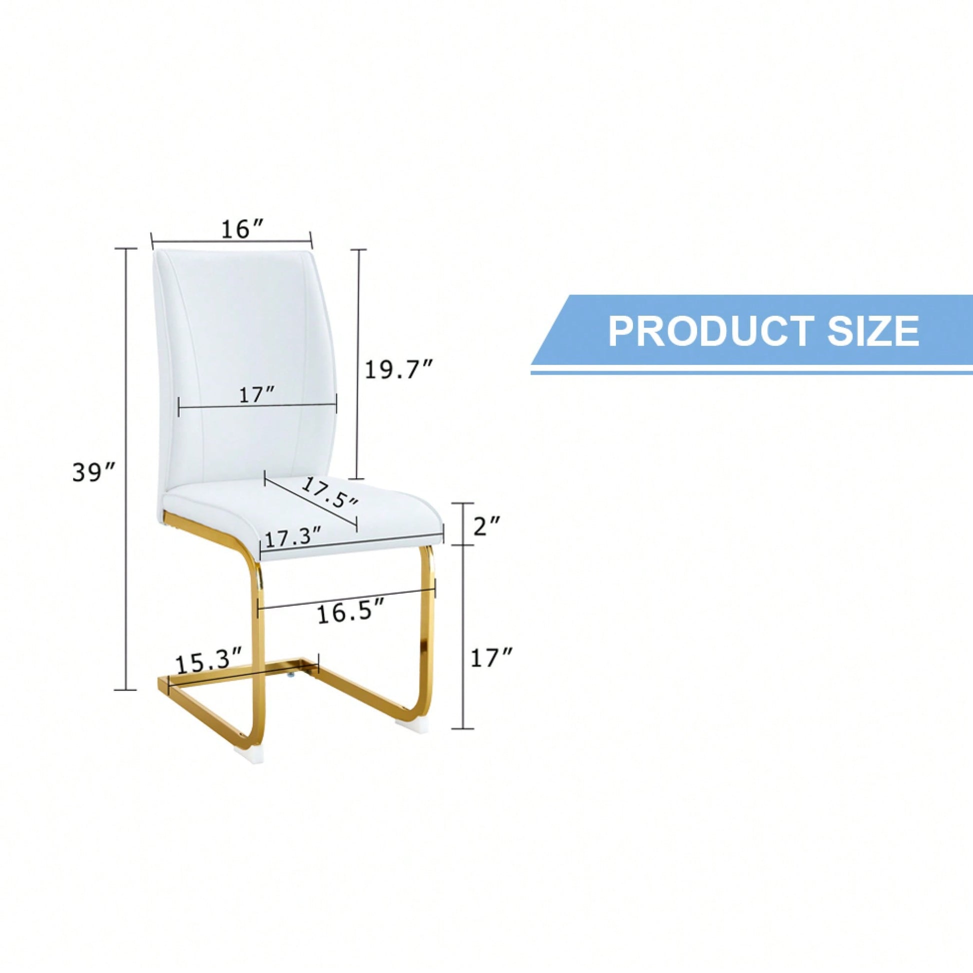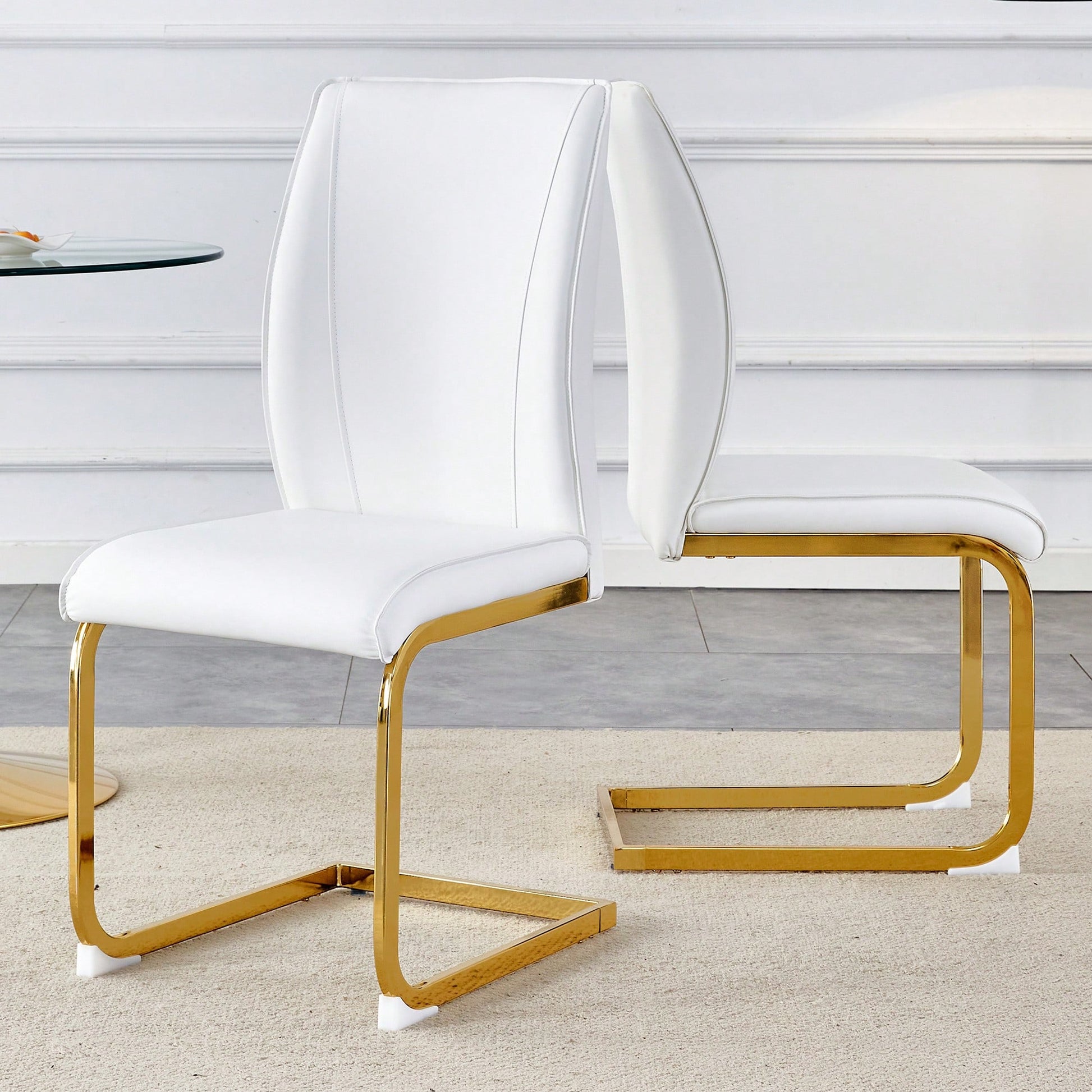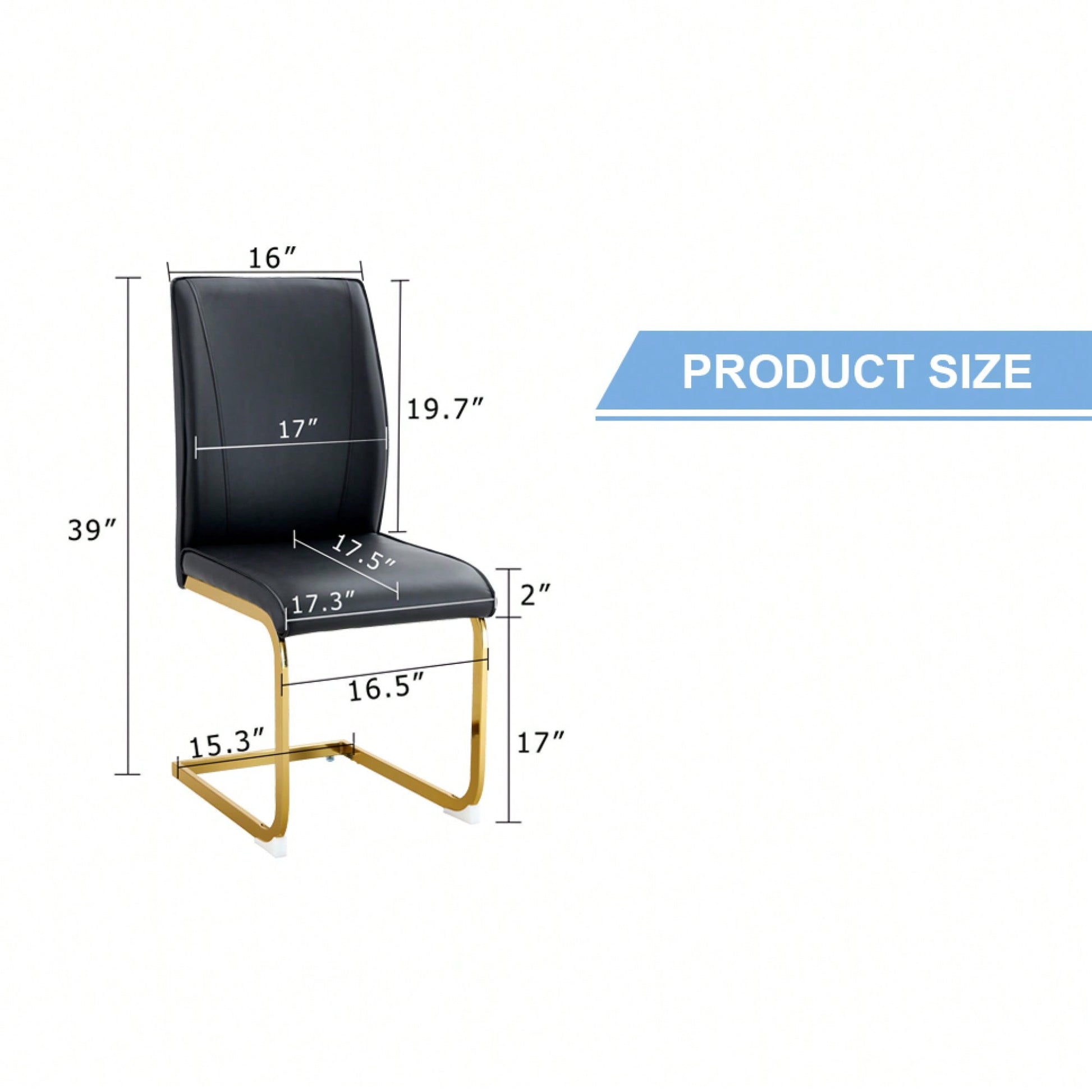 This set of two black dining chairs combines luxury and simplicity with its unique arched design and sleek lines. The arched gold metal legs not only offer stable support but also serve as a striking focal point in any dining space. Crafted from high-quality PU material, these chairs are soft to the touch, wear-resistant, and easy to clean, ensuring durability and comfort. The high-resilience sponge filling provides excellent support for extended sitting periods, while the ergonomic backrest conforms to the natural curve of the waist, helping to alleviate fatigue. With a stable and durable structure, these chairs are designed to withstand everyday use. Assembly is straightforward, with a detailed manual included for quick setup.