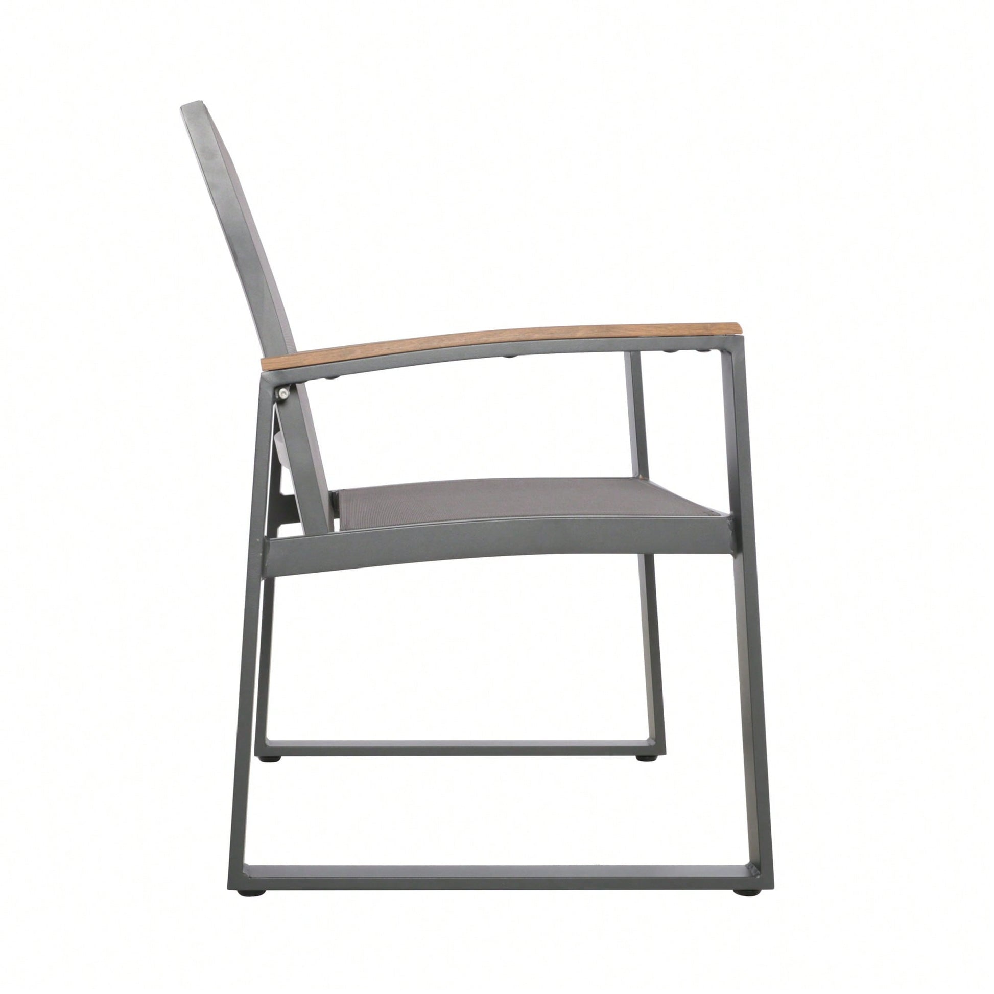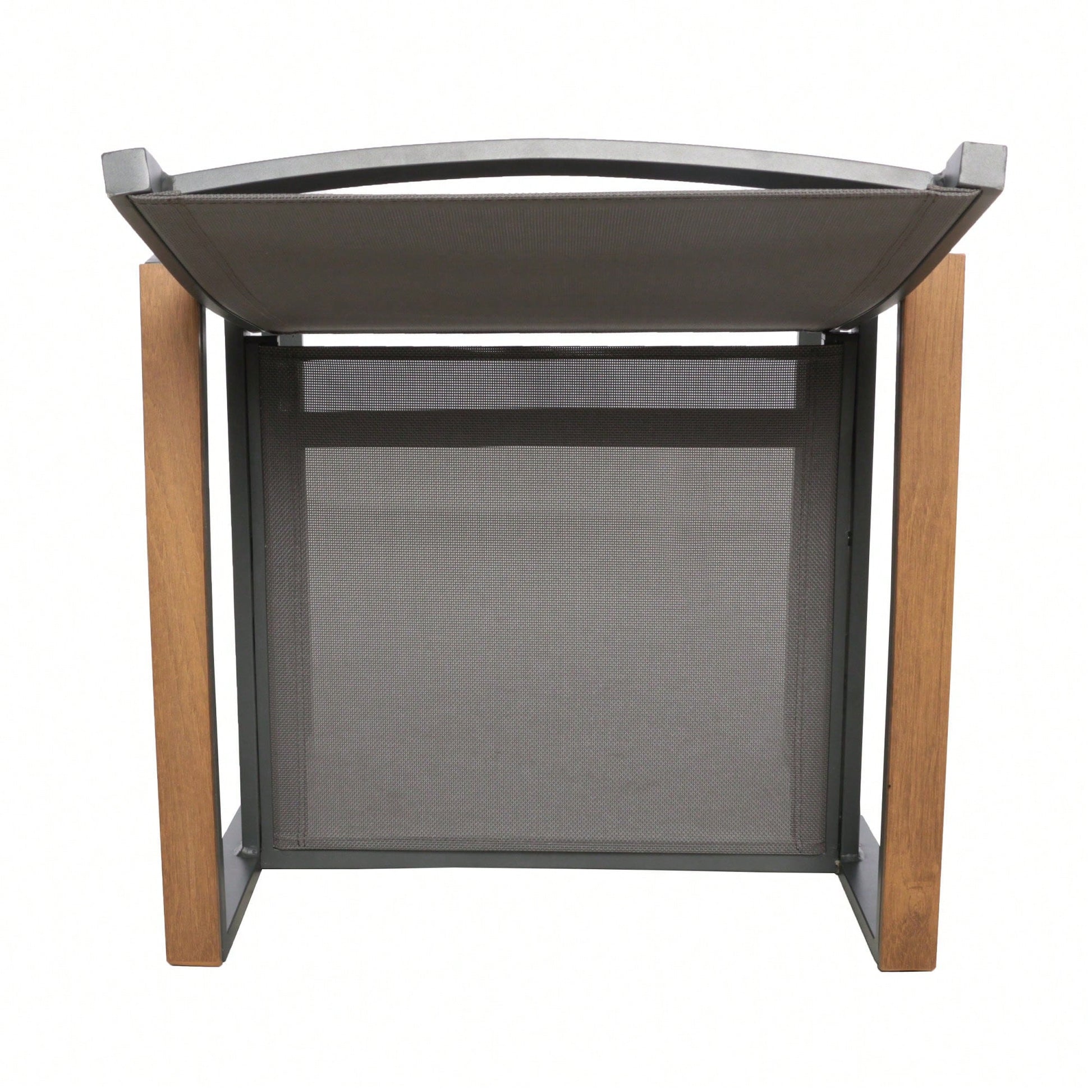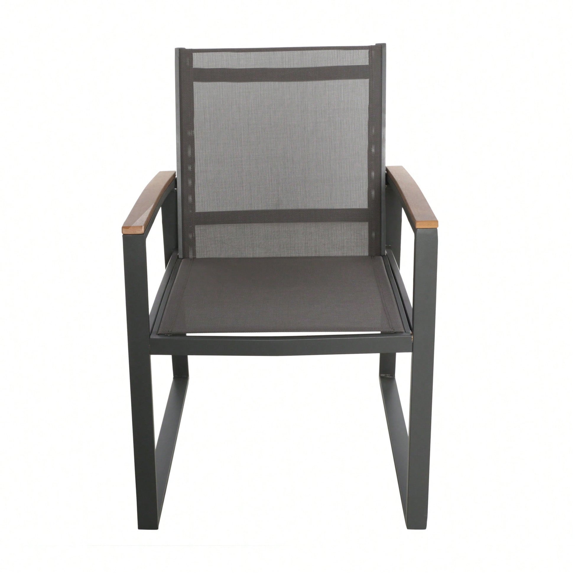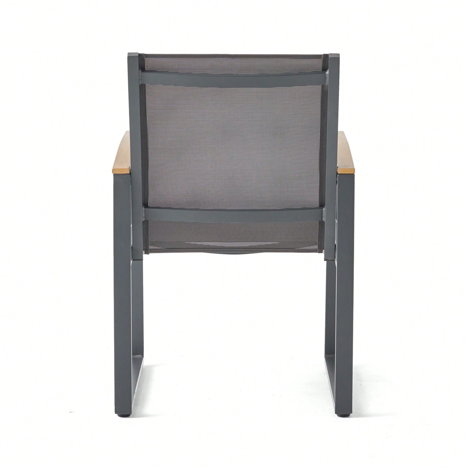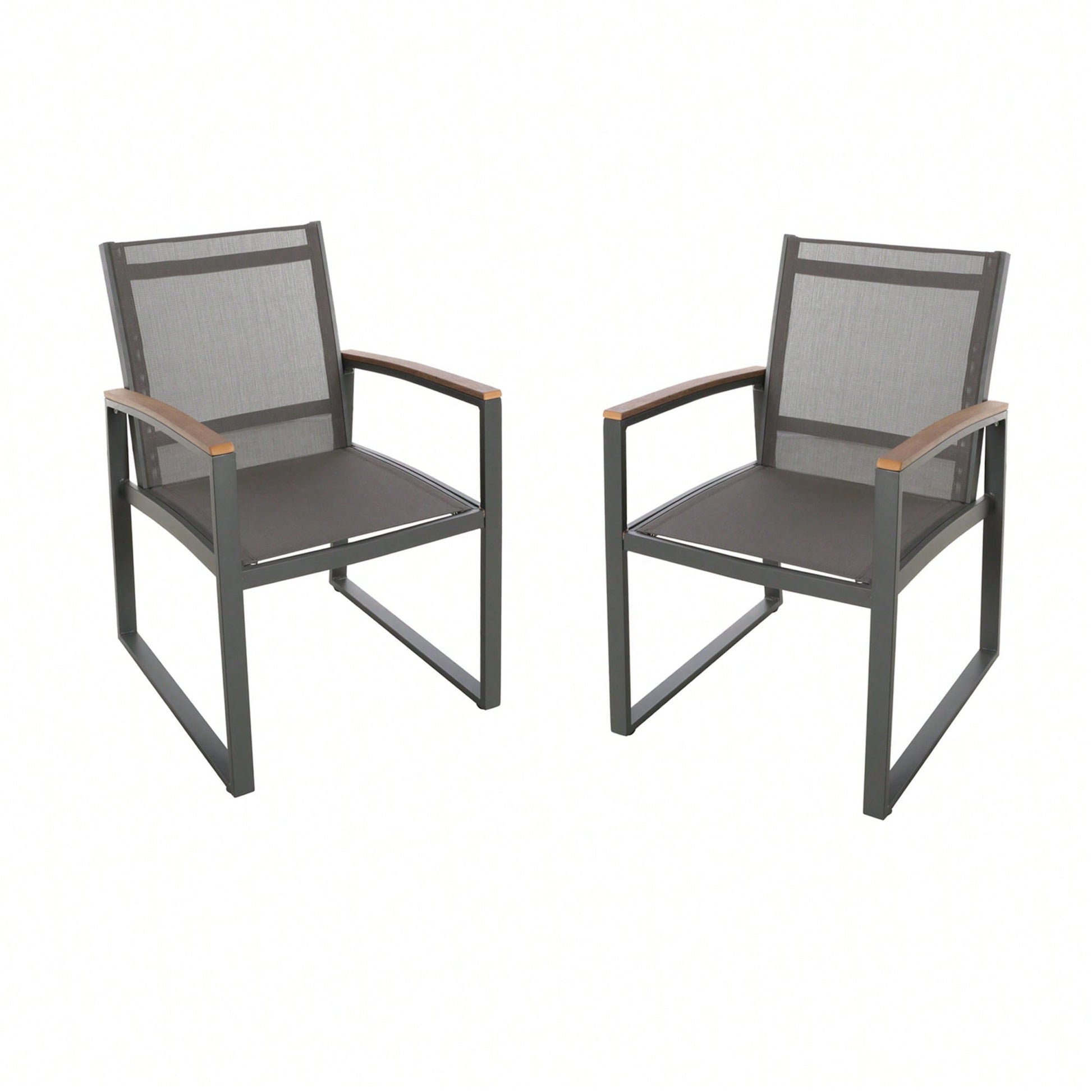 These patio dining chairs are perfect for enjoying meals in the fresh air and sunshine, providing a chic and comfortable seating option for you and your loved ones. Designed with a sleek, modern look, these chairs invite a touch of elegance into your outdoor space. The faux-wood arms beautifully contrast with the sturdy, rust-proof aluminum frames, enhancing their mid-century modern style. With a mesh seat and back, these chairs ensure water can flow through easily, making them both practical and stylish for any outdoor dining experience.
