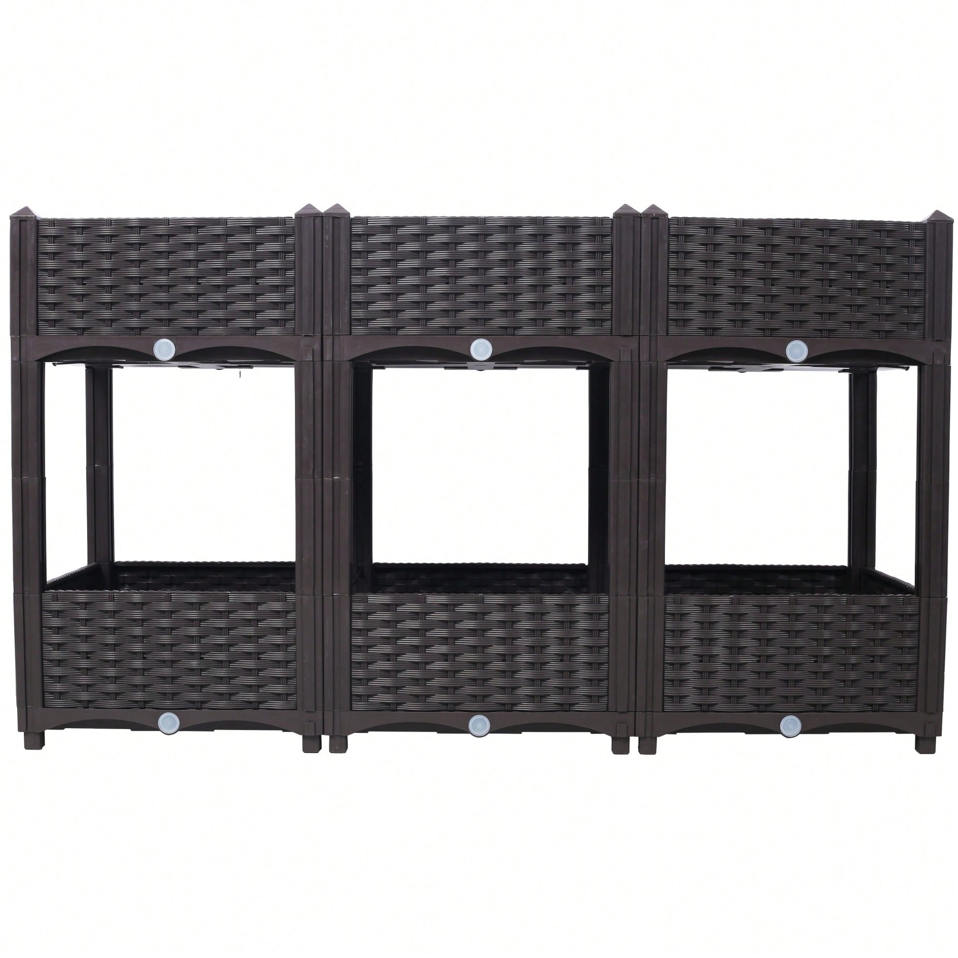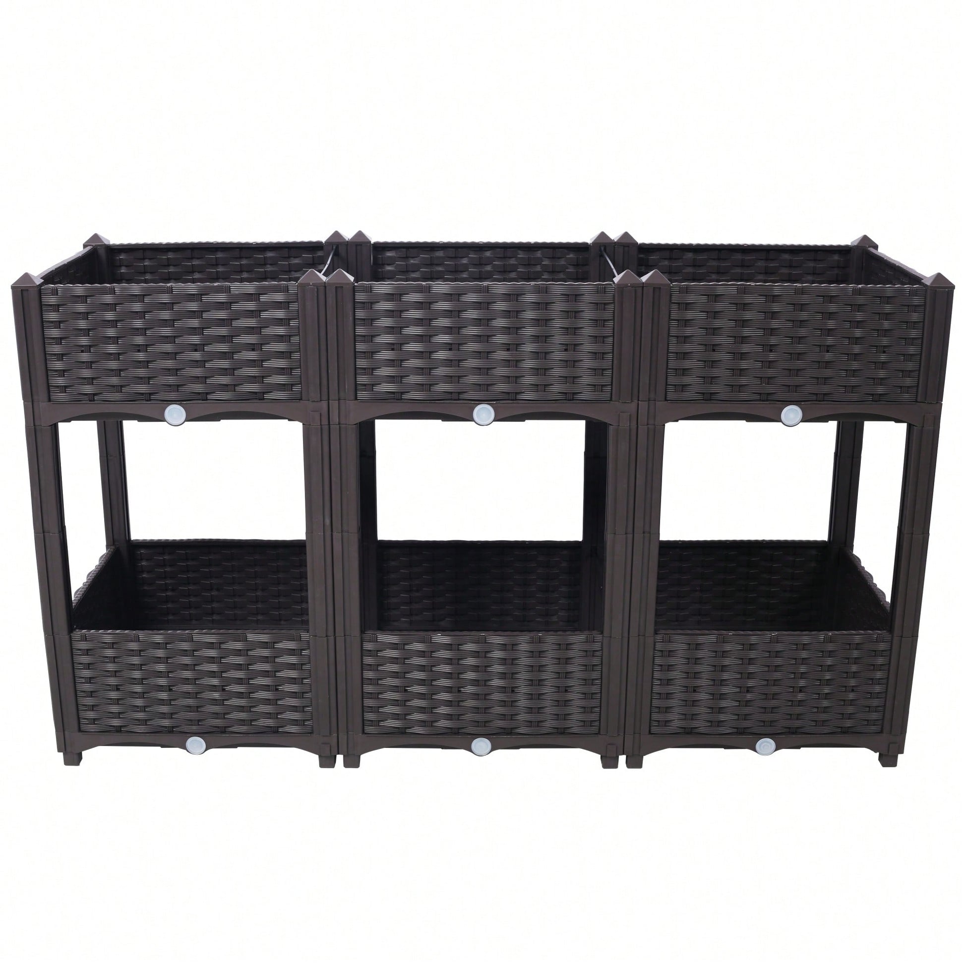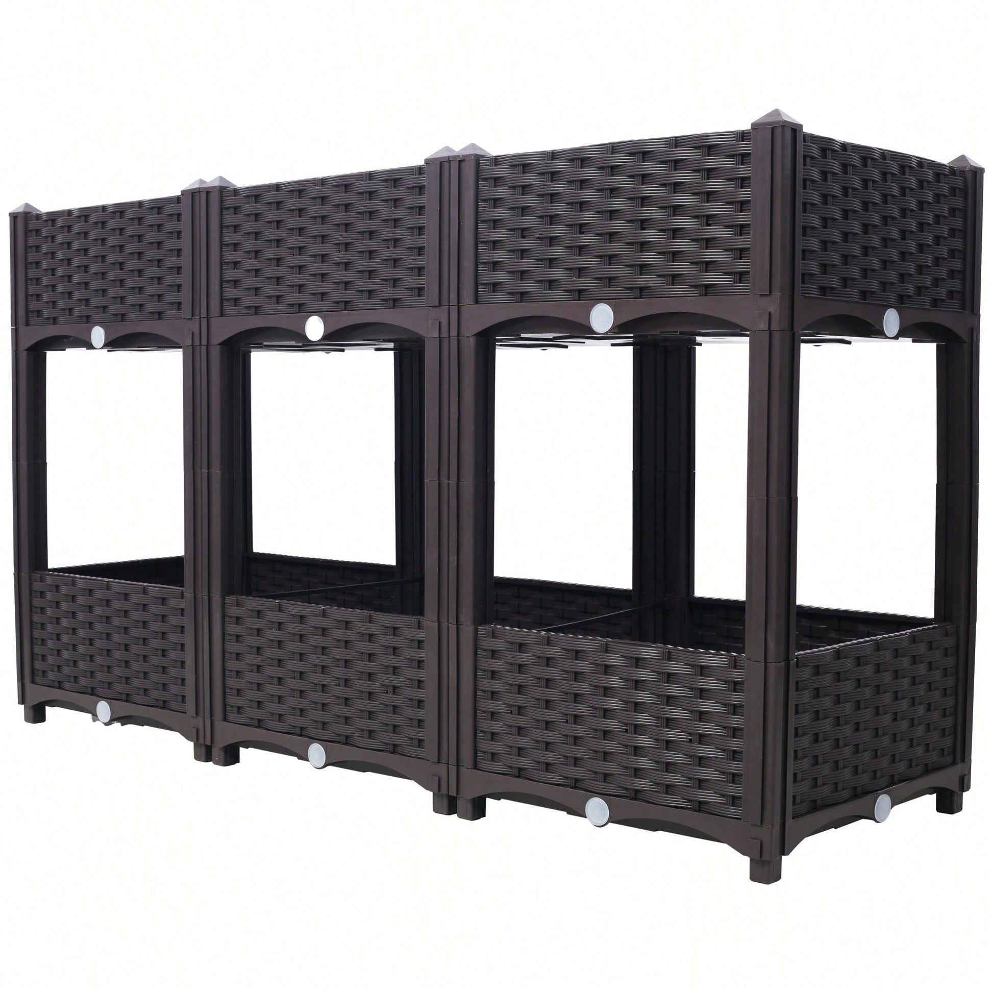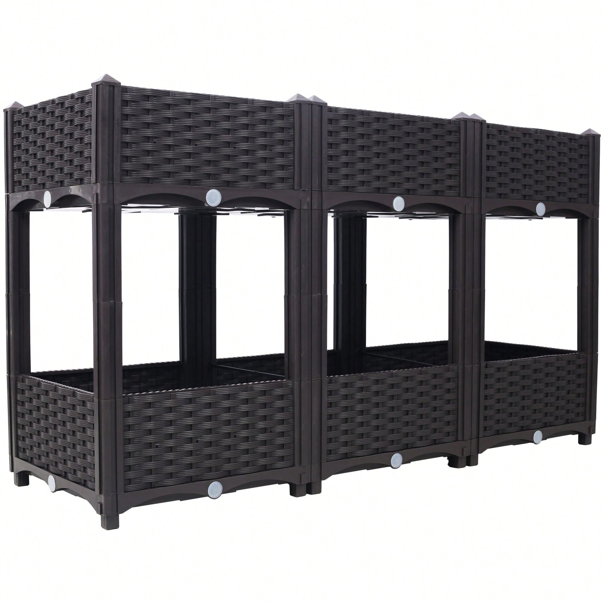 This elevated planter box combines functionality with style, making it a perfect addition to your outdoor or indoor gardening setup. Constructed from durable and lightweight material, the attractive rattan-patterned design not only adds aesthetic appeal but also ensures longevity. The self-draining system features a drainage hole at the bottom, allowing you to manage excess water easily while retaining moisture when needed. Its modular design means you can personalize your gardening space-add or remove legs and arrange them in ways that fit your space perfectly. The raised height of these planters offers numerous advantages, including protection from weeds, animals, and easier access for those with mobility challenges. Assembly is quick and simple, and the waterproof surface allows for hassle-free cleaning, making it a practical choice for patios, balconies, cafes, and more.
