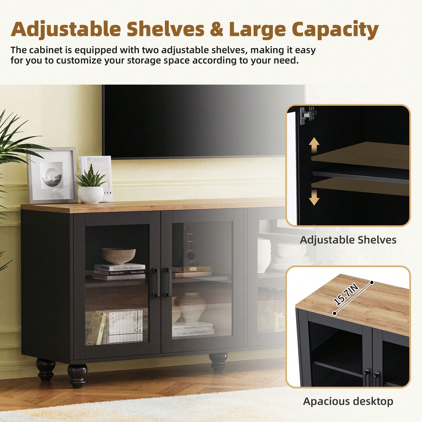 This stylish 63-inch cabinet features elegant gourd-shaped legs and black retro handles, adding a high-end charm to any room. The transparent glass doors allow for showcasing your collection, enhancing the overall aesthetic. Not limited to a TV stand, this versatile piece can seamlessly transition into a buffet cabinet, storage console, or kitchen cupboard, adapting to your specific needs. The two adjustable shelves provide flexibility in organizing your items, while the spacious desktop and large cabinets help keep your space clutter-free. Crafted from premium materials and designed for durability, this cabinet ensures long-lasting satisfaction with a 4mm thickened glass door panel and robust solid wood legs for stability on uneven floors.