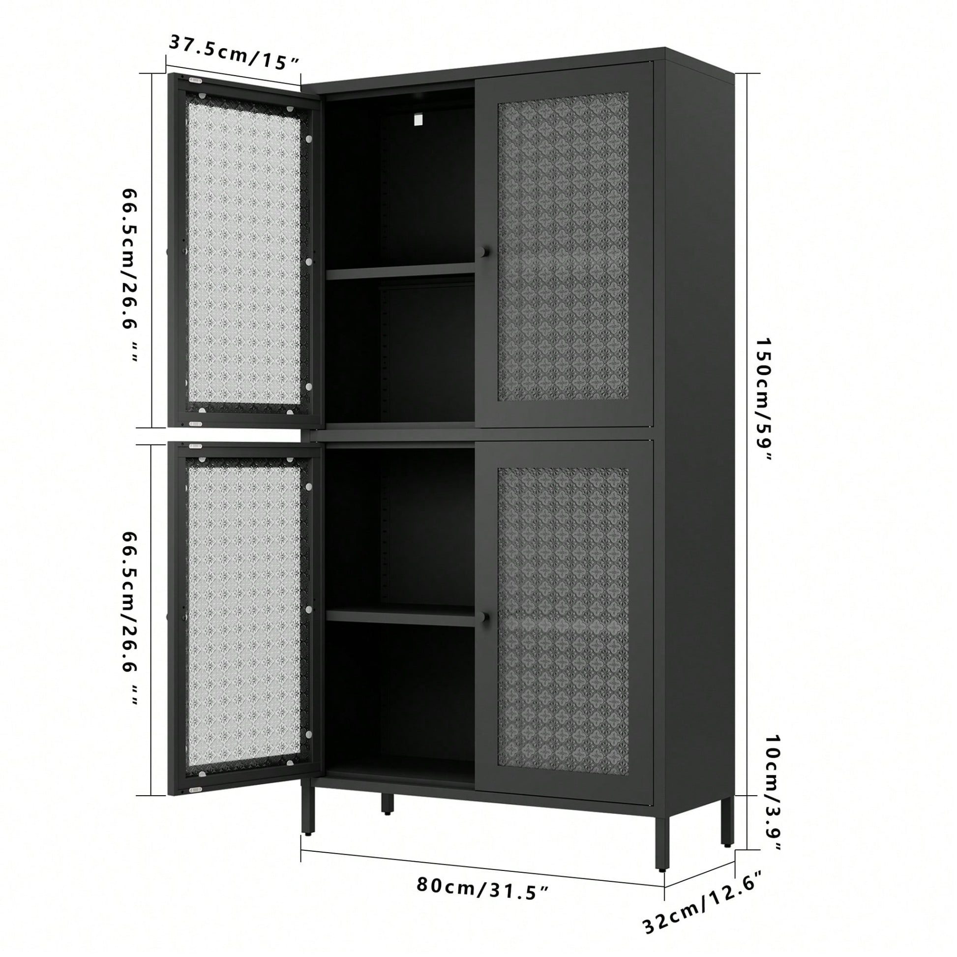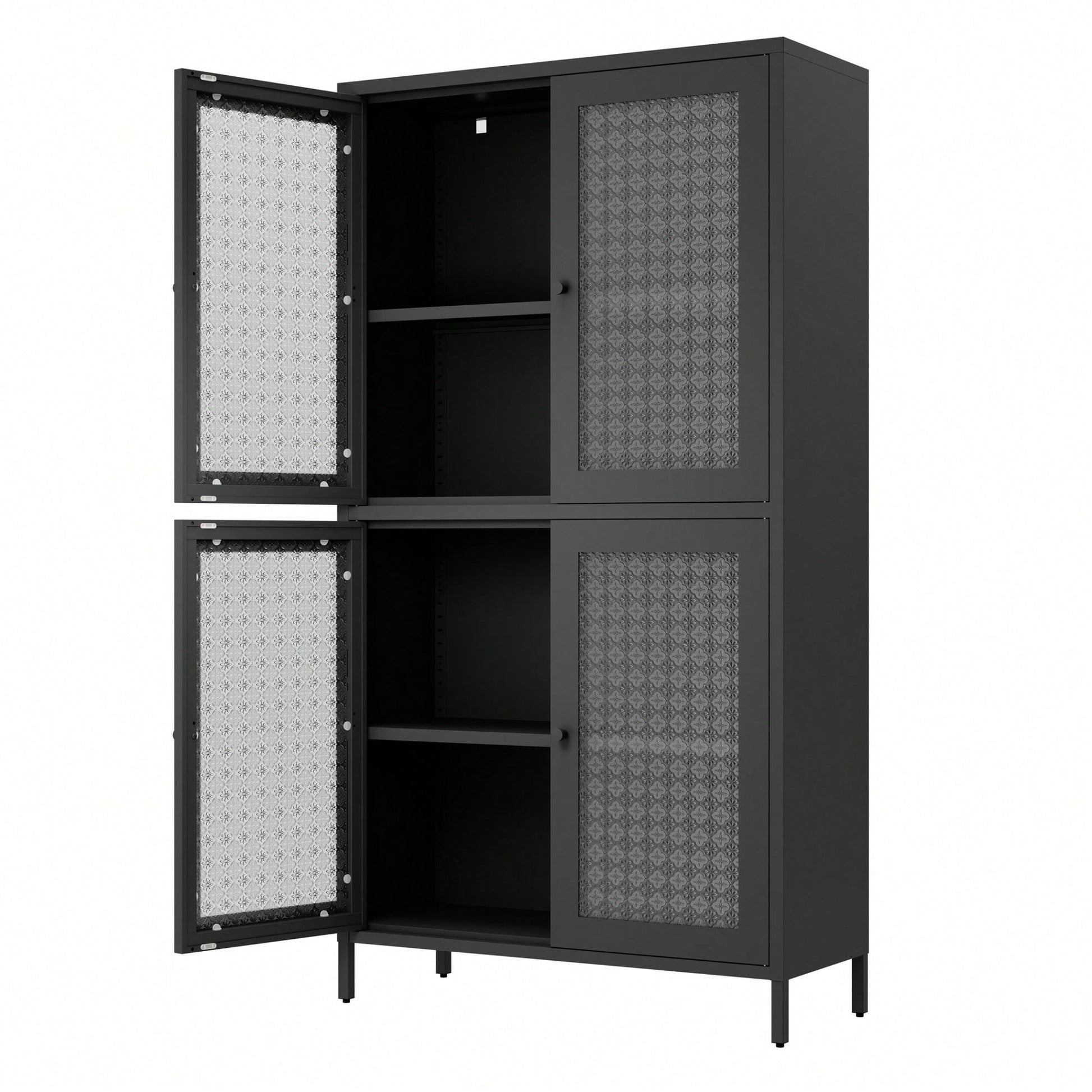 This classic metal storage cabinet features a stylish double-door design that is a nod to timeless home décor. The cabinet is constructed with a robust cold-rolled steel frame, finished with an friendly powder coating that ensures durability and resistance to wear. The doors are made from 4mm thick reinforced tempered glass with a unique begonia pattern, providing an elegant touch while ensuring safety and longevity. With adjustable shelves, this versatile cabinet can be customized to fit various storage needs. Its moderate size makes it suitable for use in a study, office, kitchen, dining room, or living room. The raised cabinet legs allow for easy cleaning, and anti-tipping accessories provide added safety.