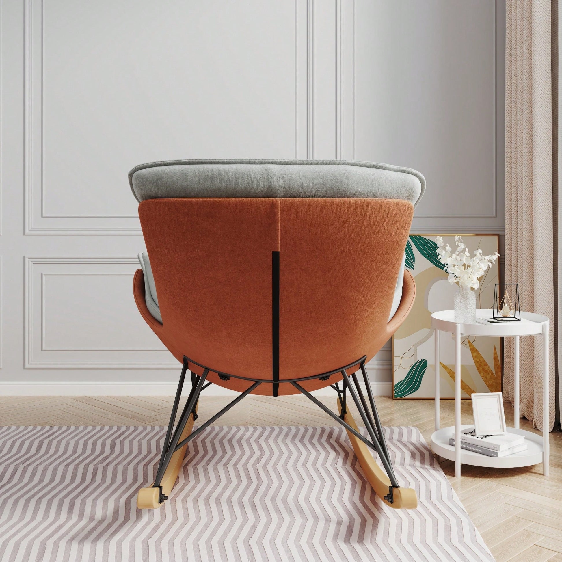 Experience ultimate comfort with this elegantly designed rocking chair. Its ergonomic biomimetic curved backrest ensures a pleasant seating experience, reducing neck pressure no matter your position. The chair's robust natural wood base is built for longevity, supporting weights up to 300 pounds while providing stability during use. The plush seat cushion, crafted from soft milk velvet fabric, offers a luxurious feel that invites you to unwind. Additionally, the chair features a safe sled design that prevents tipping, making it a family-friendly choice. The removable and washable cushion adds convenience, allowing for easy cleaning and maintaining a hygienic living space.