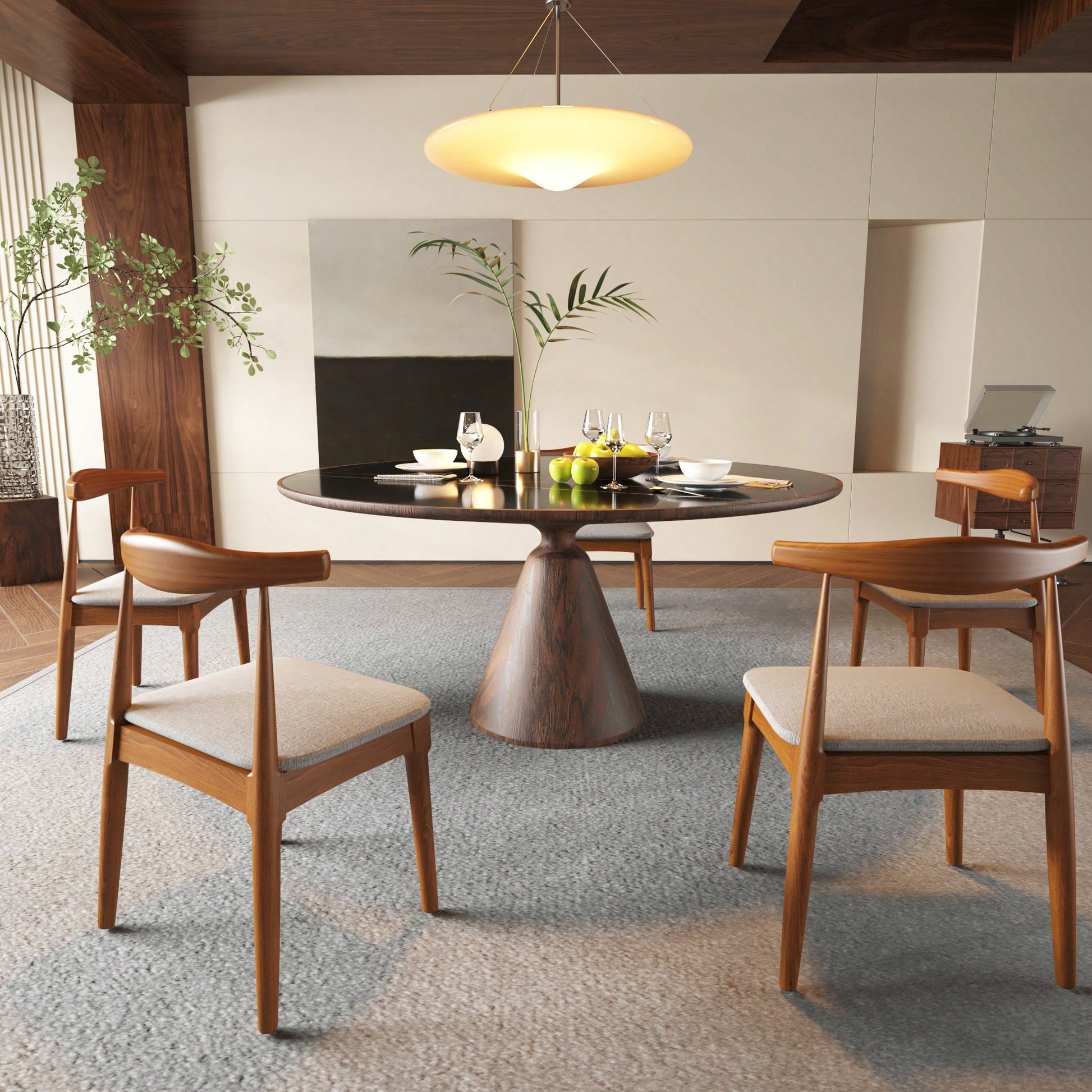 This set of dining chairs combines style and comfort with its ergonomic design, ensuring a perfect fit for the body while seated. Upholstered with premium fabric and filled with highly elastic sponge, these chairs allow for extended use without discomfort. The sturdy construction from quality solid wood guarantees long-lasting performance, while advanced thermal bending technology ensures a seamless and attractive finish.