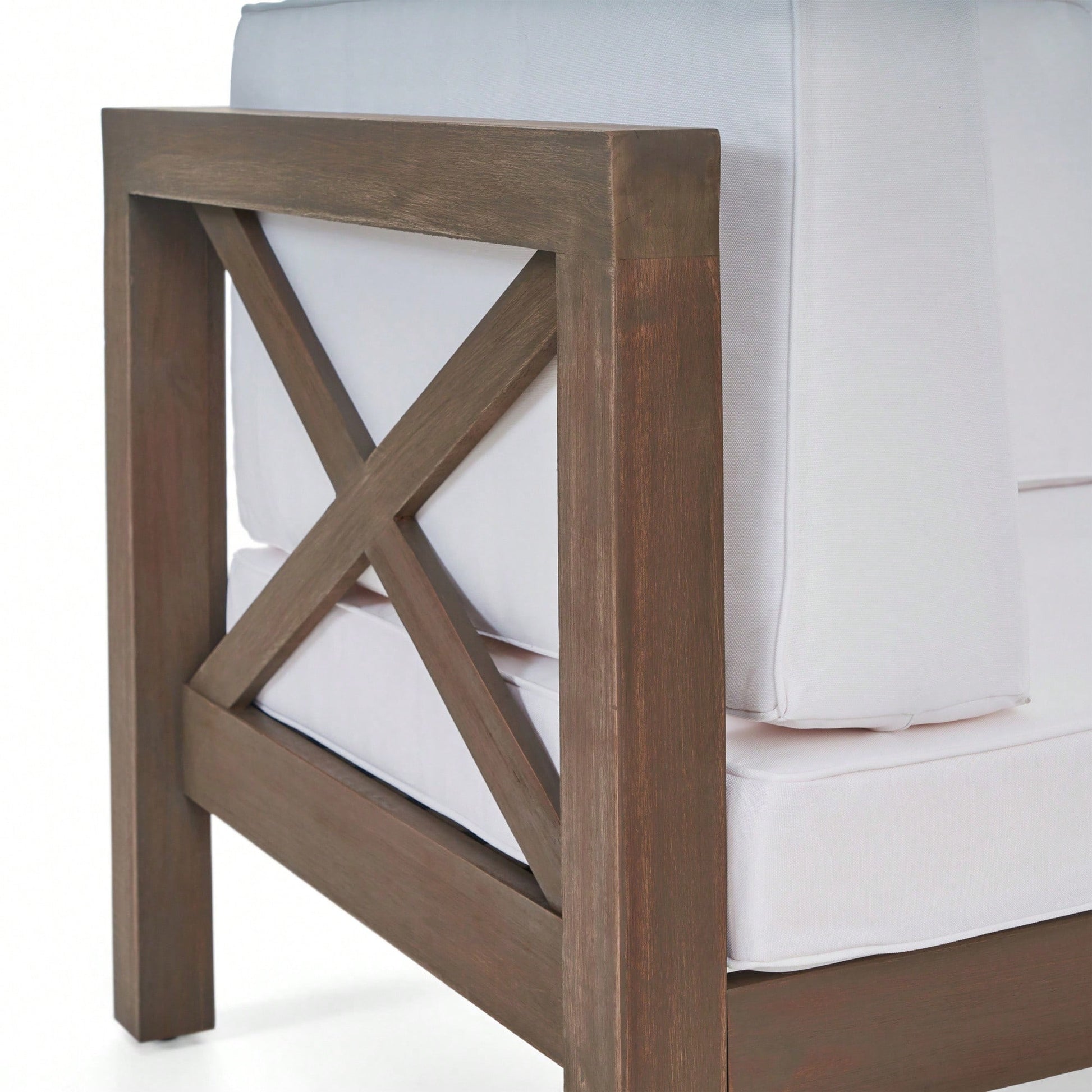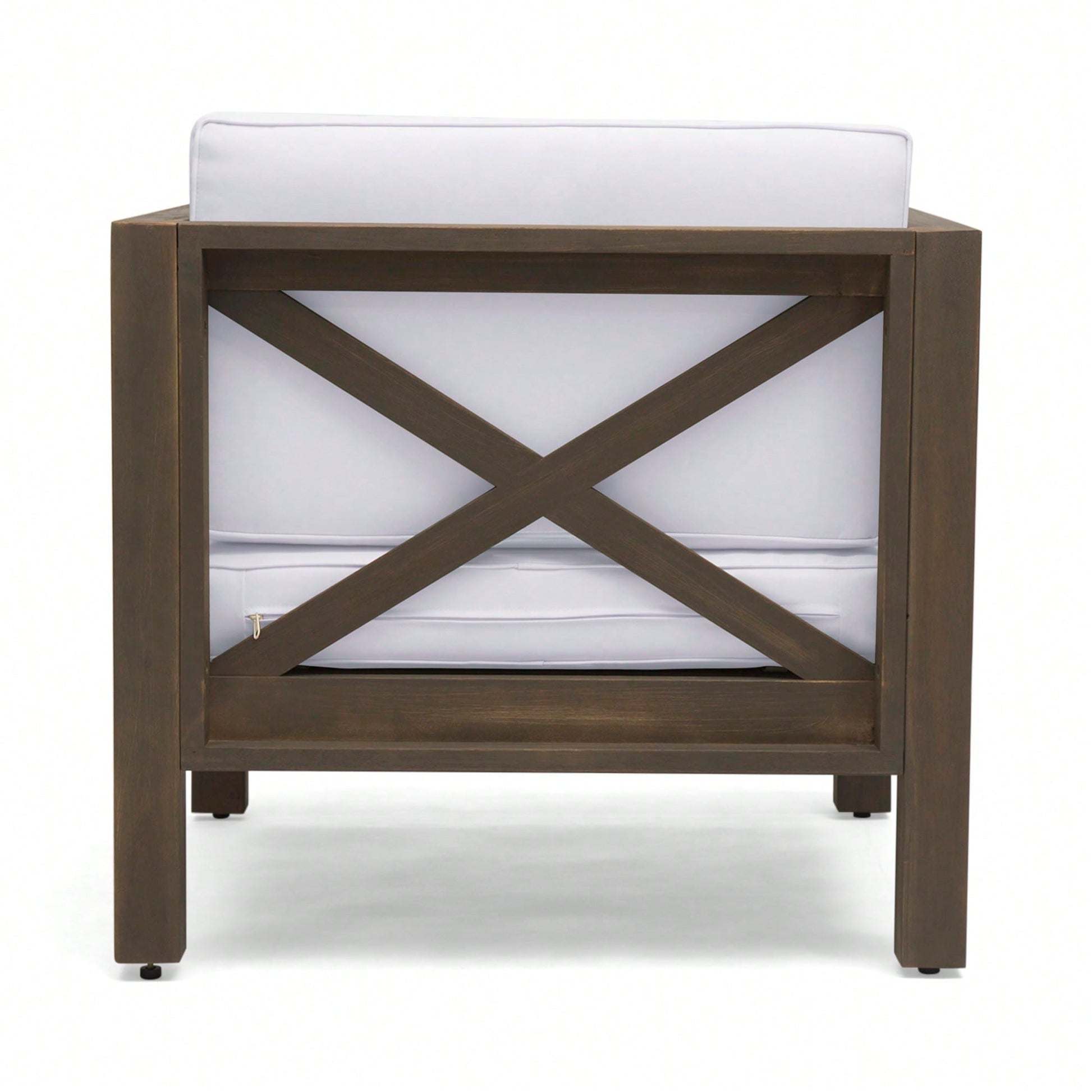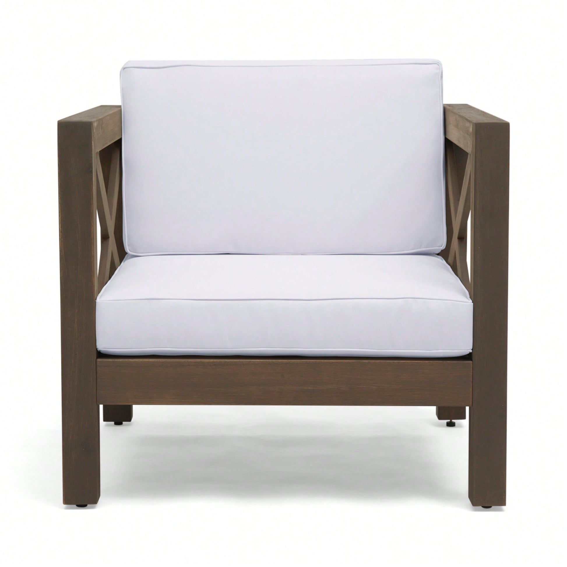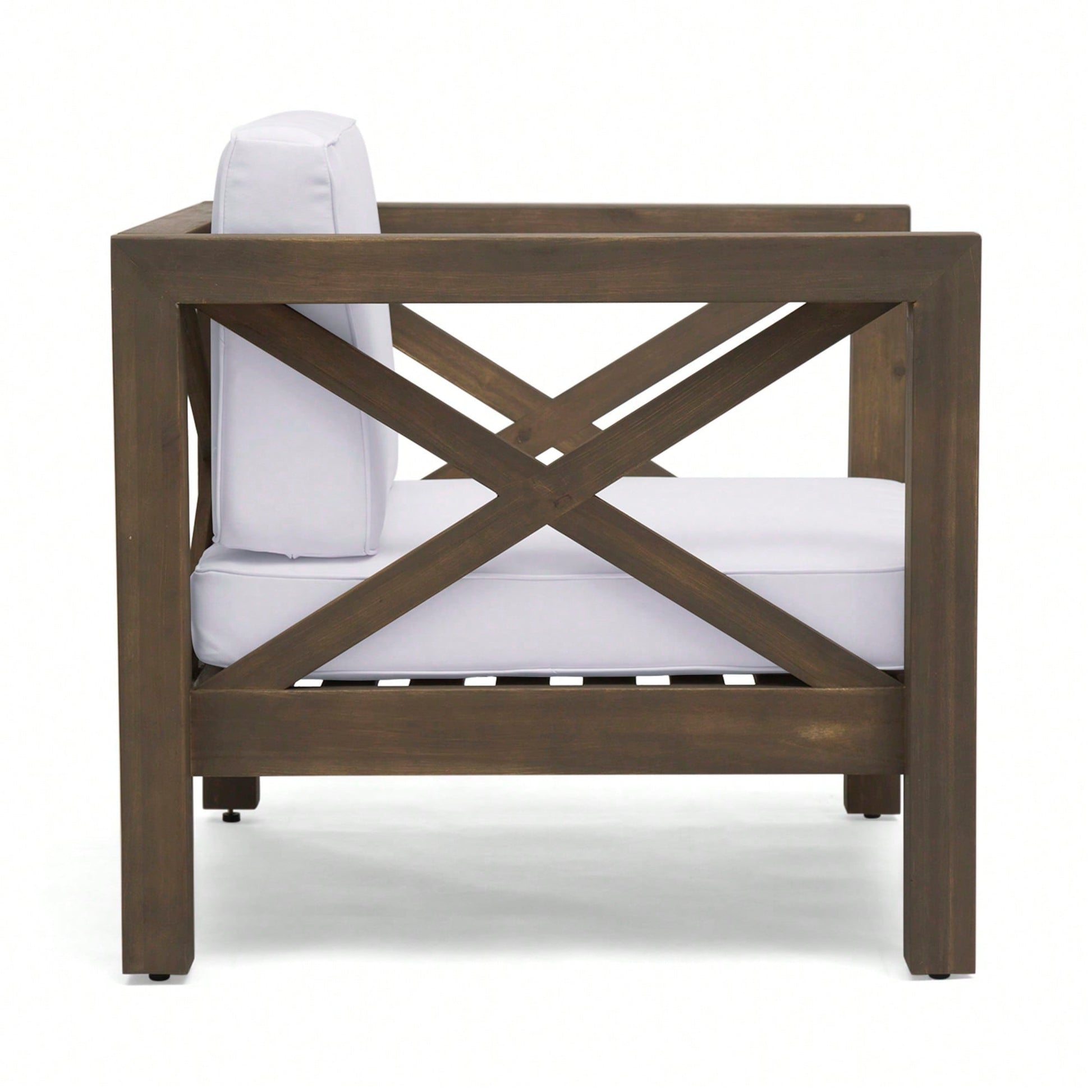 This club chair combines mid-century modern aesthetics with practical outdoor functionality. Featuring a cross-back wooden frame and slatted seating, it presents an elegant yet understated look that enhances any patio space. Made from robust acacia wood, this chair not only boasts a sleek and exotic appearance but is also built to endure various weather conditions without darkening over time. The chair's water-resistant cushions allow for hassle-free cleaning, ensuring you can enjoy outdoor lounging without worry. To maximize its lifespan, it is recommended to store or cover the cushions when not in use and apply teak oil as needed for maintenance. Assembly is required, but all necessary tools and instructions are provided for a smooth setup.