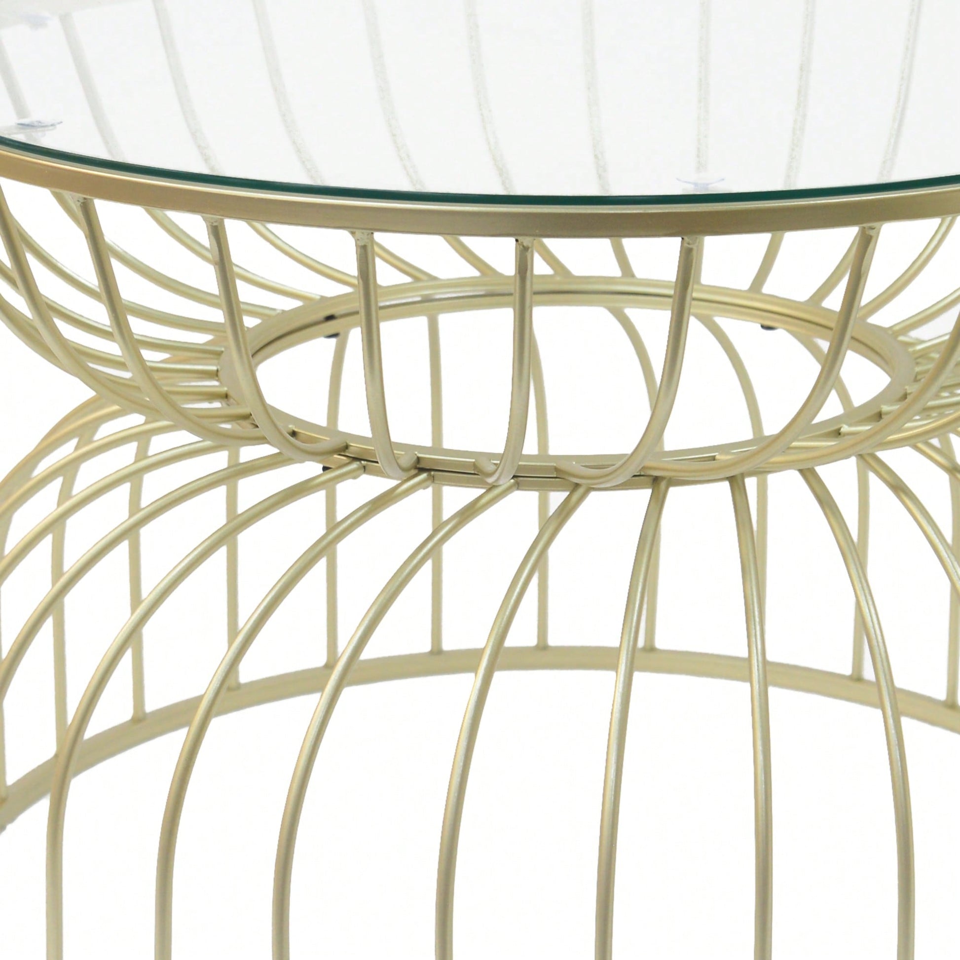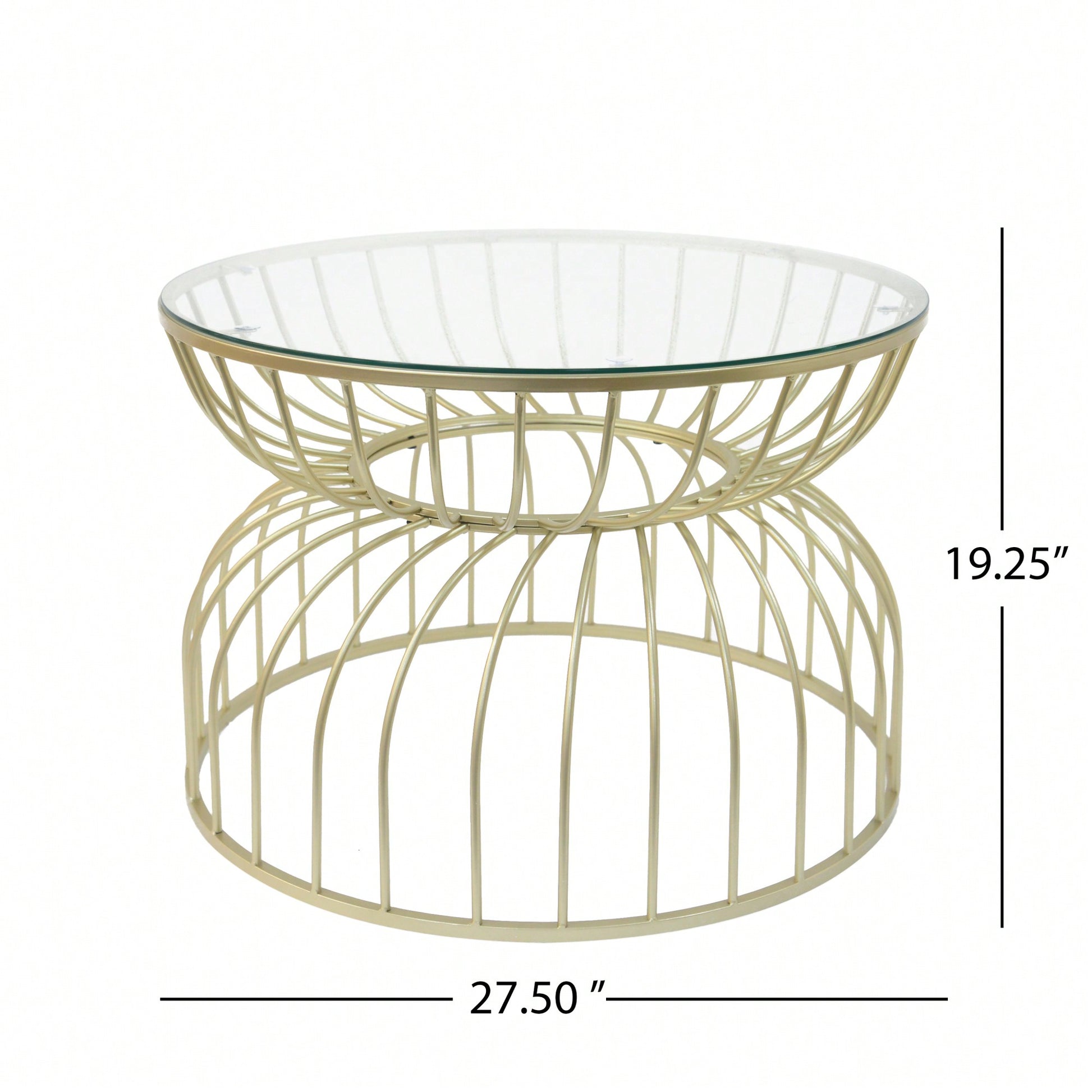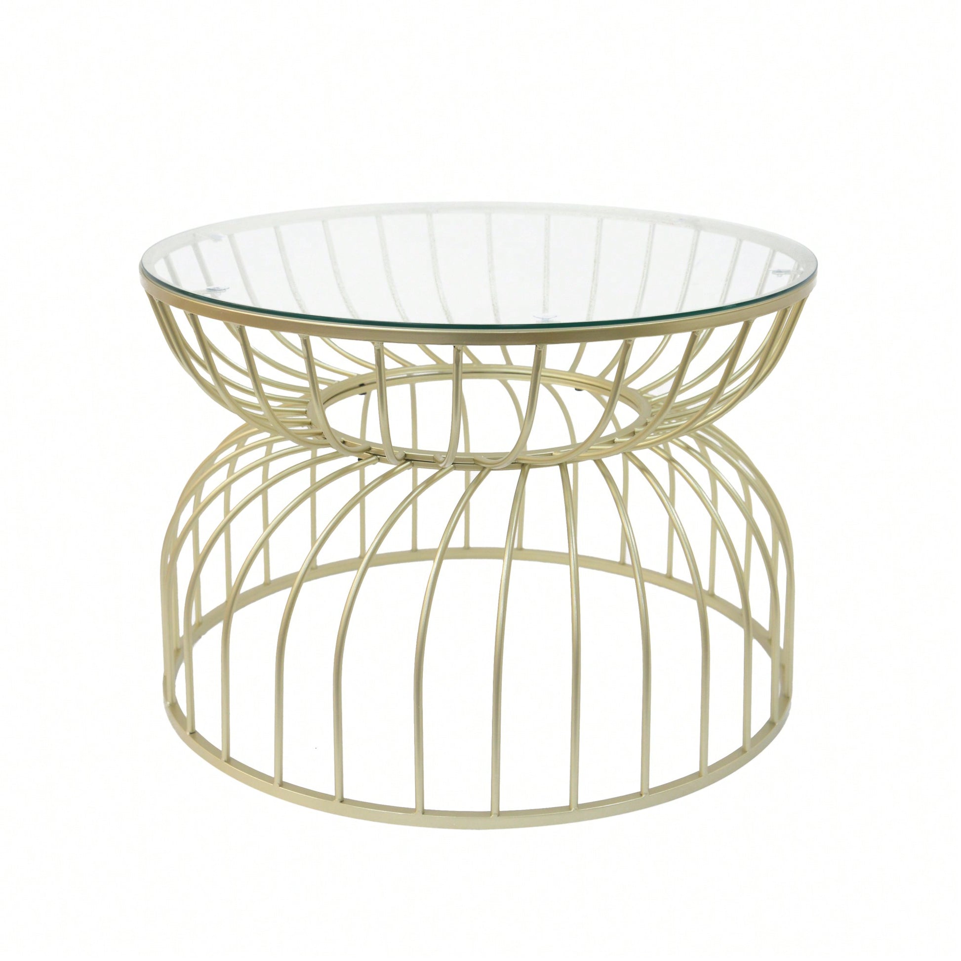 - Modern design featuring a clear tempered glass top and a gold metal base with hollowed out lines.