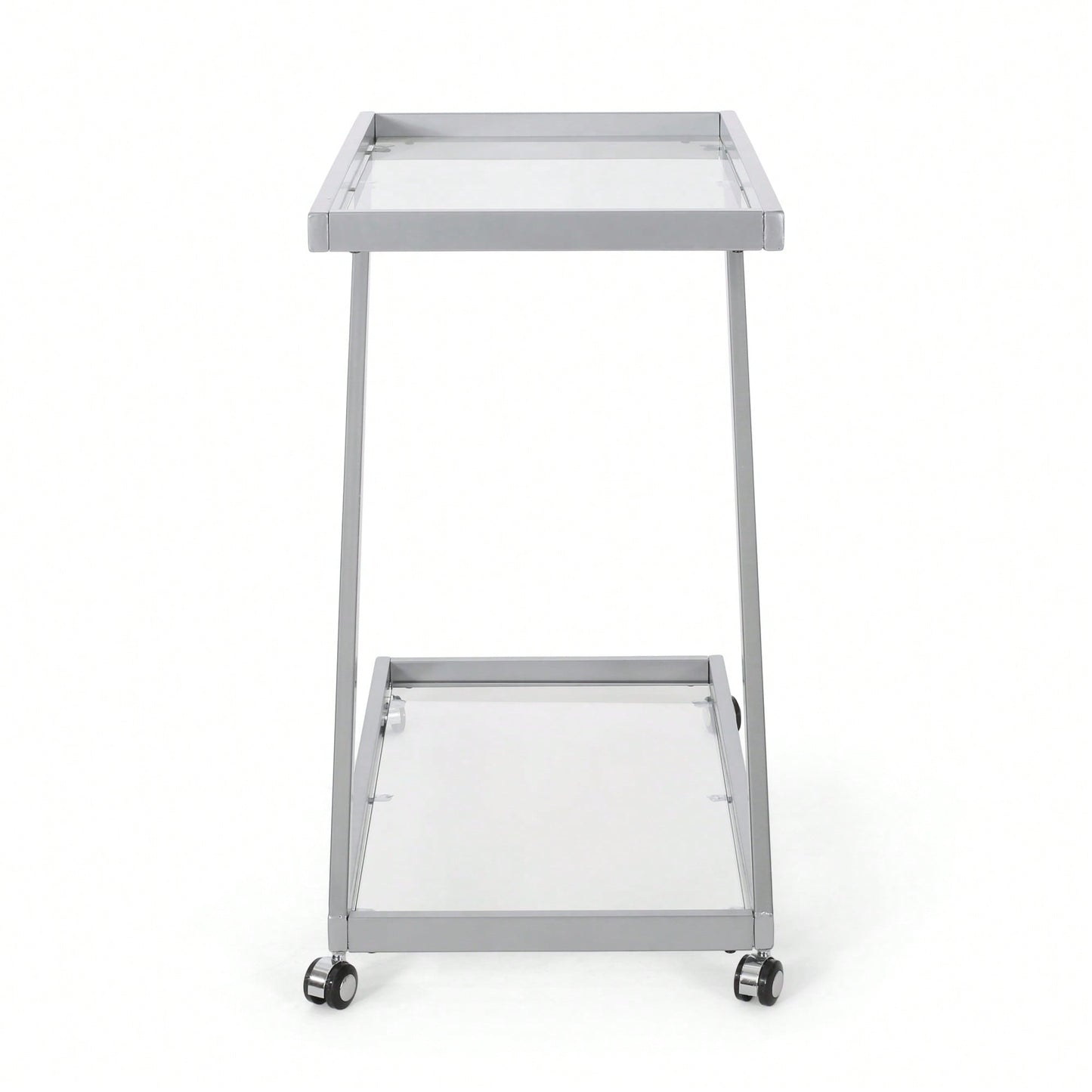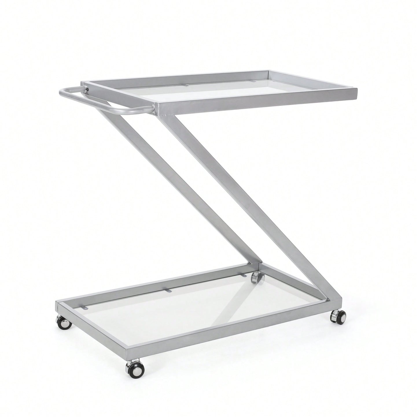 This modern bar cart is designed with a sleek, contemporary aesthetic, featuring a striking Z-shaped frame. The tempered glass shelves not only provide a sophisticated look but are also exceptionally strong and safe, ensuring longevity and resistance to shattering. The robust iron base offers exceptional durability, making it a reliable addition to your home décor. Designed for convenience, the bar cart is equipped with rolling casters that allow for effortless movement. When stability is needed, the casters can easily be locked in place.