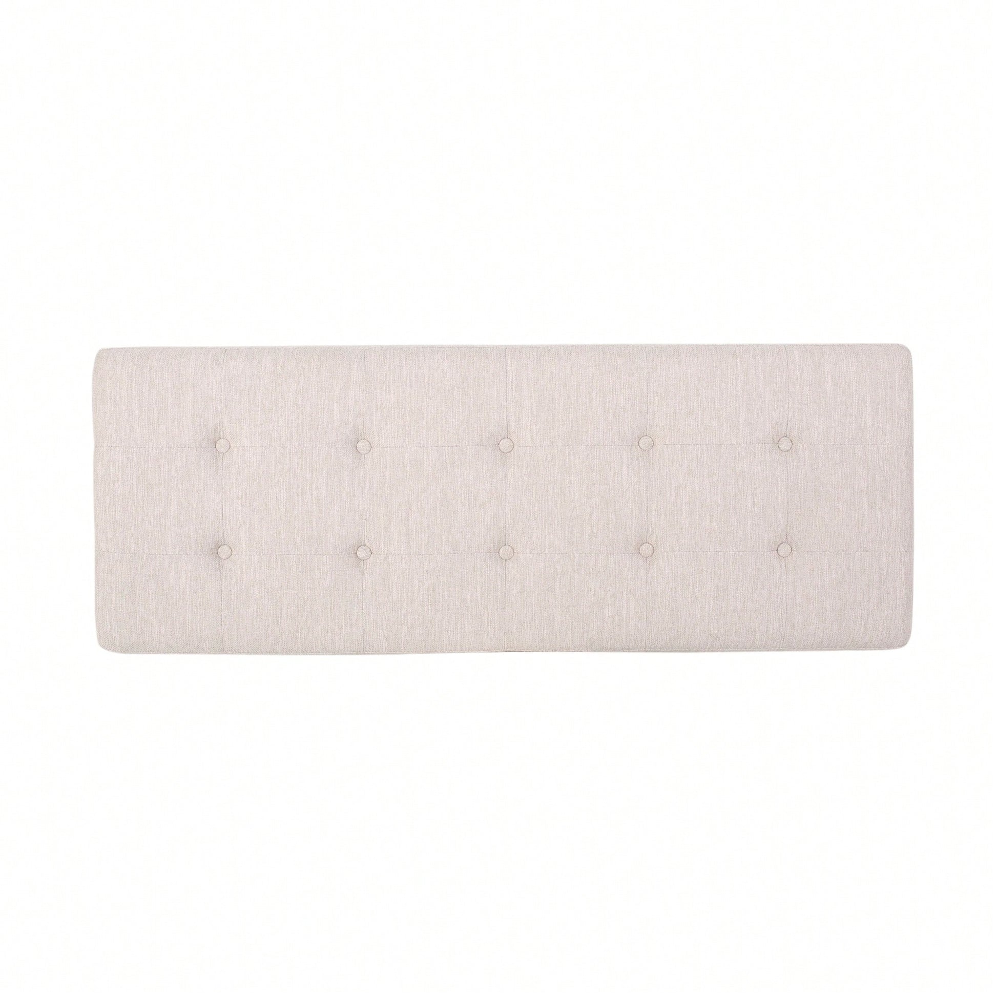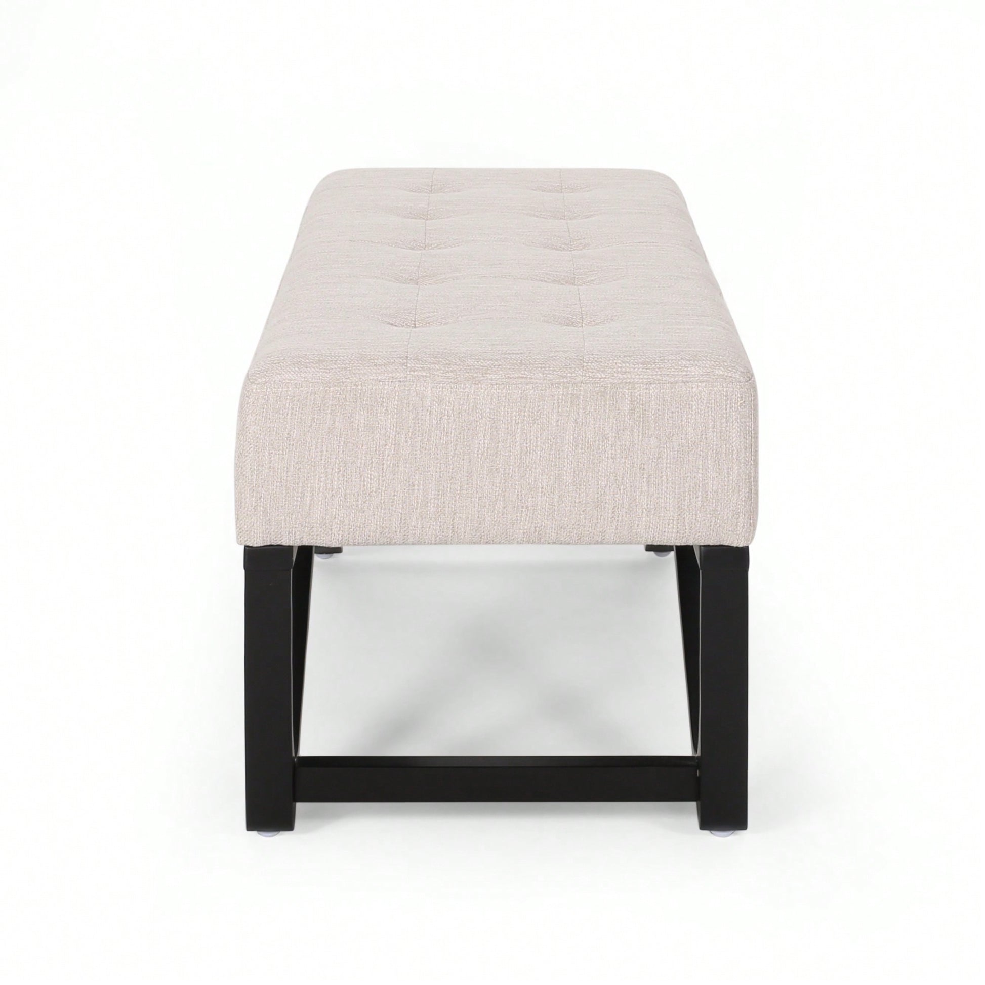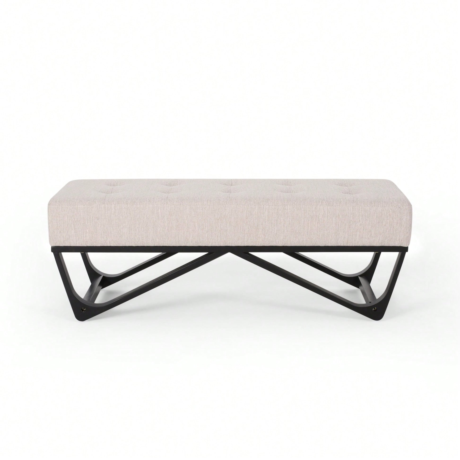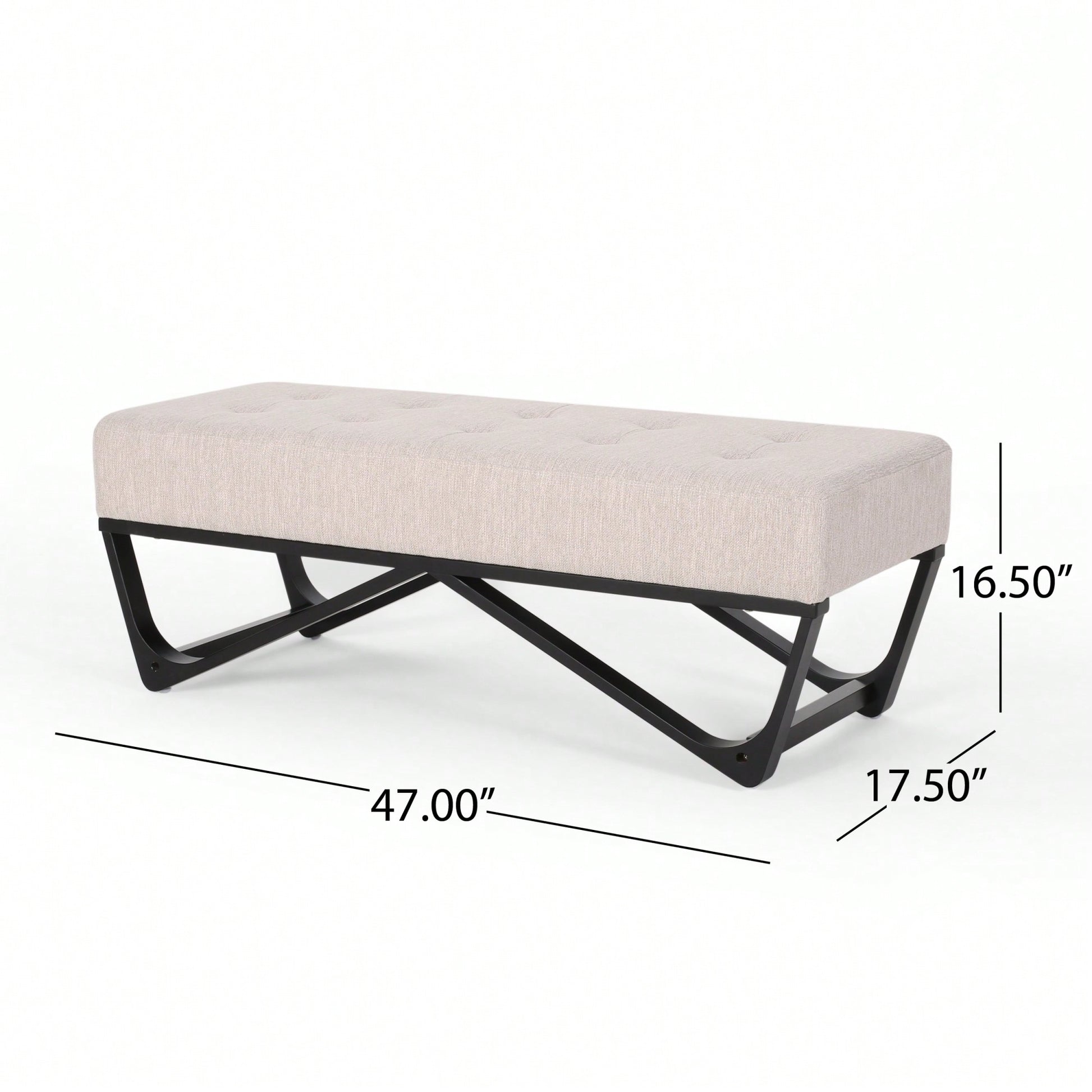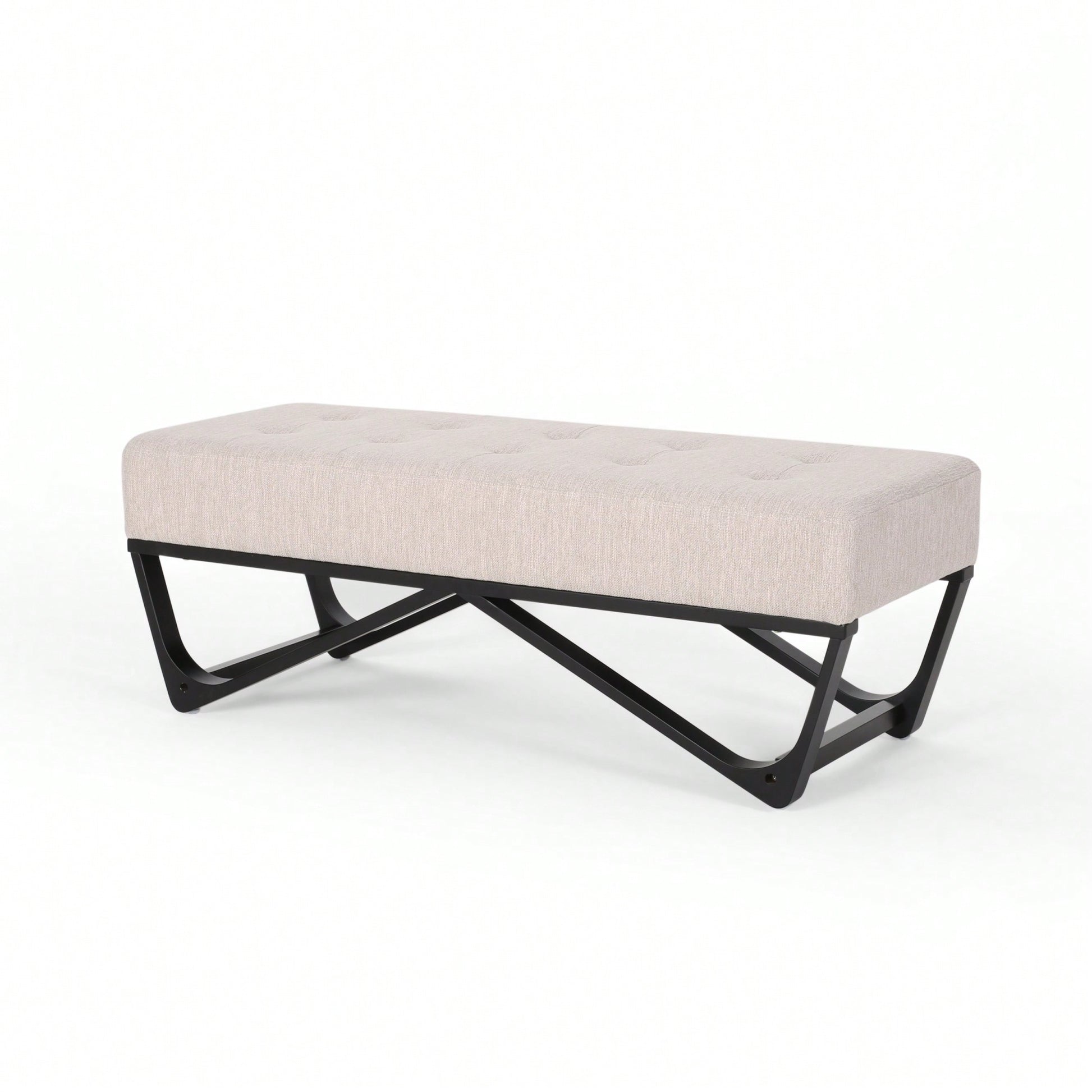 This sophisticated accessory enhances your interior space with a chic vibe. The bench features a plush, button-tufted seat with a waffled stitch design, combining comfort and style. Its polished faux wood frame and sleek geometric legs contribute to a contemporary aesthetic, making it a versatile addition to any room.