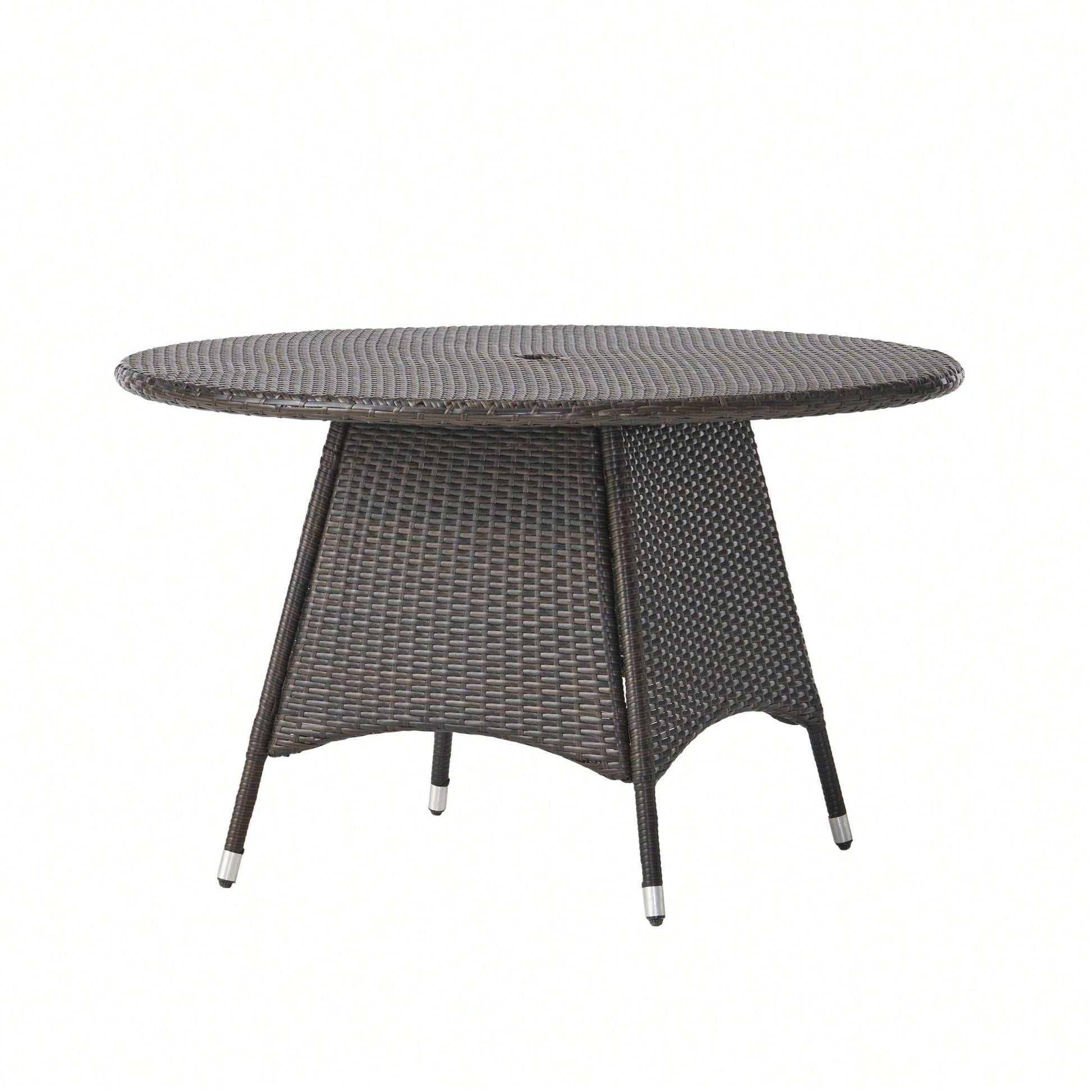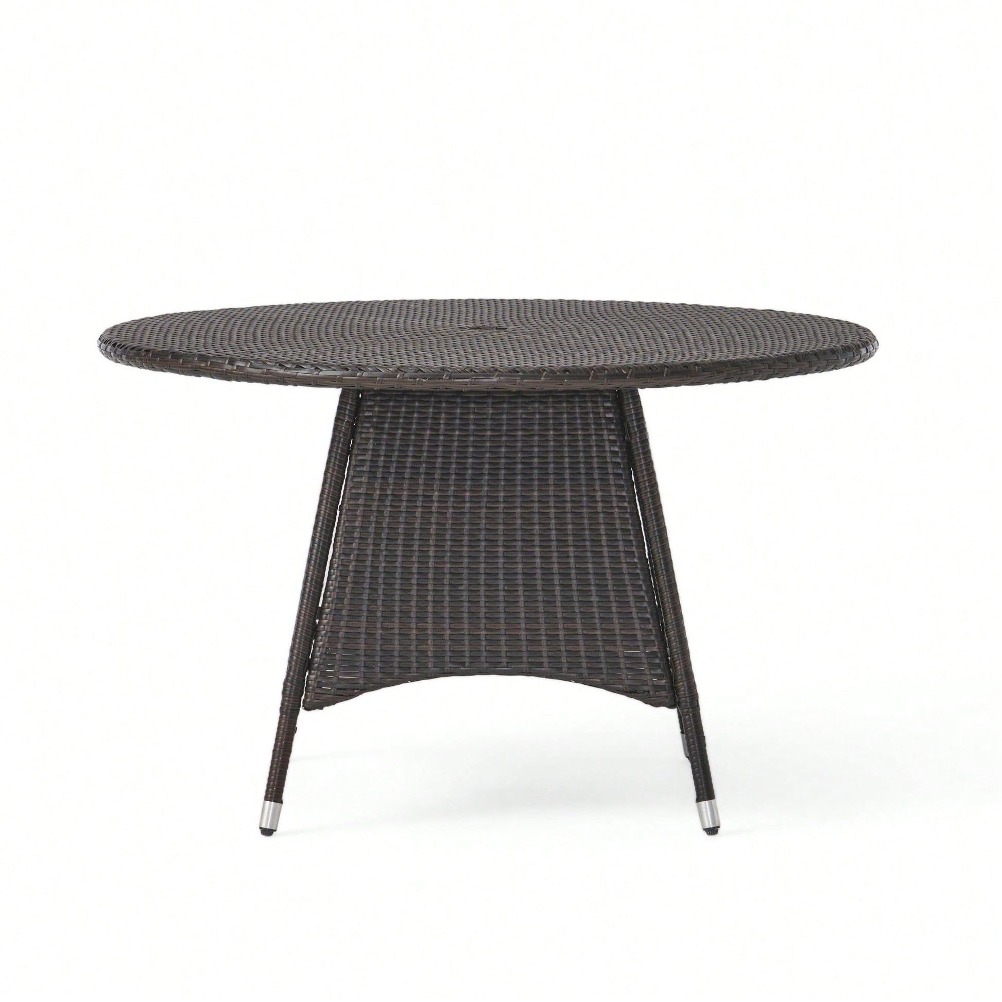 This stylish outdoor dining table is perfect for enjoying meals on the patio or casual gatherings on the porch. Constructed from sturdy wicker and a durable powder-coated iron frame, it is designed to withstand the elements and heavy use over the years. The circular tabletop comfortably seats four, while the matching chairs feature curved arms and a saddle seat for added comfort.