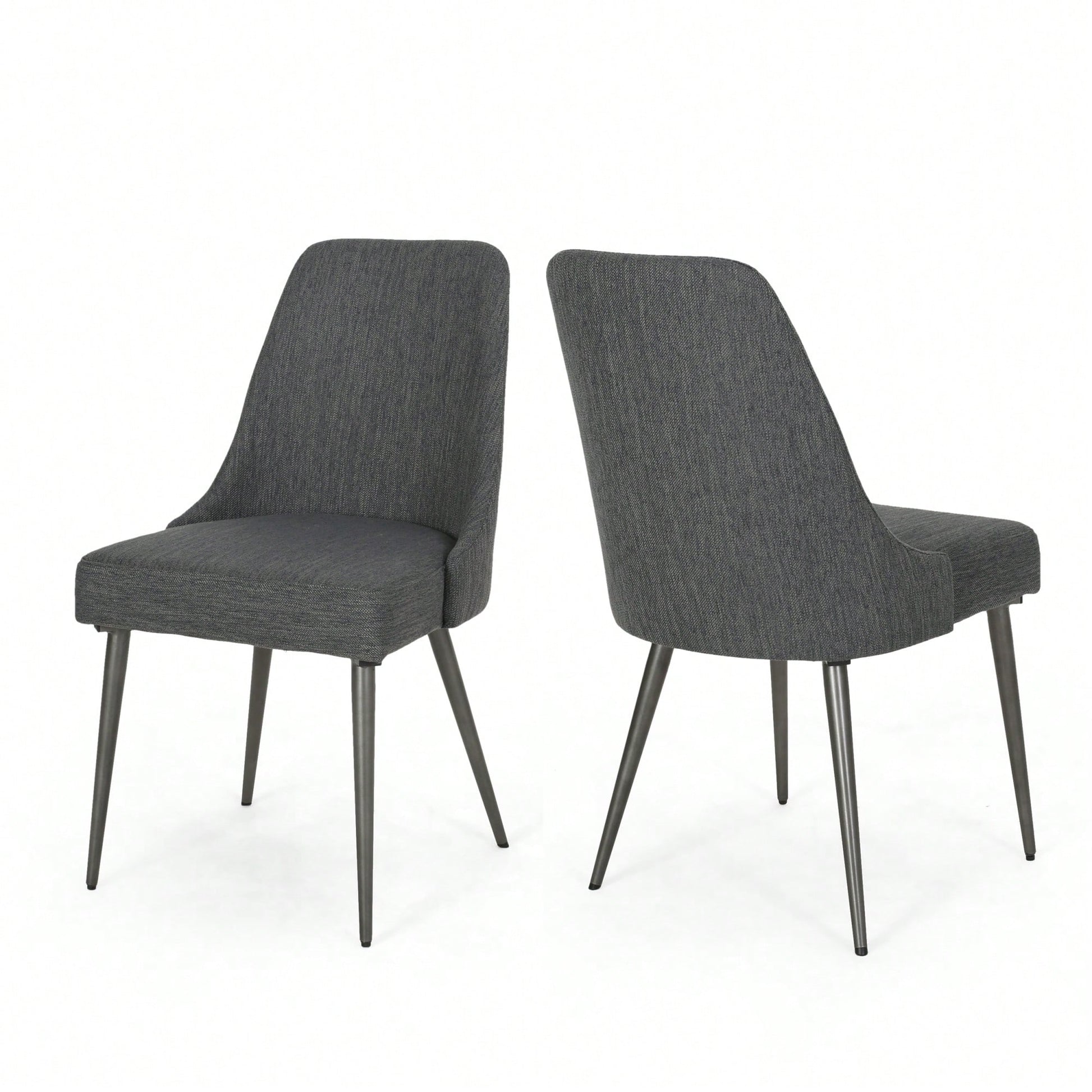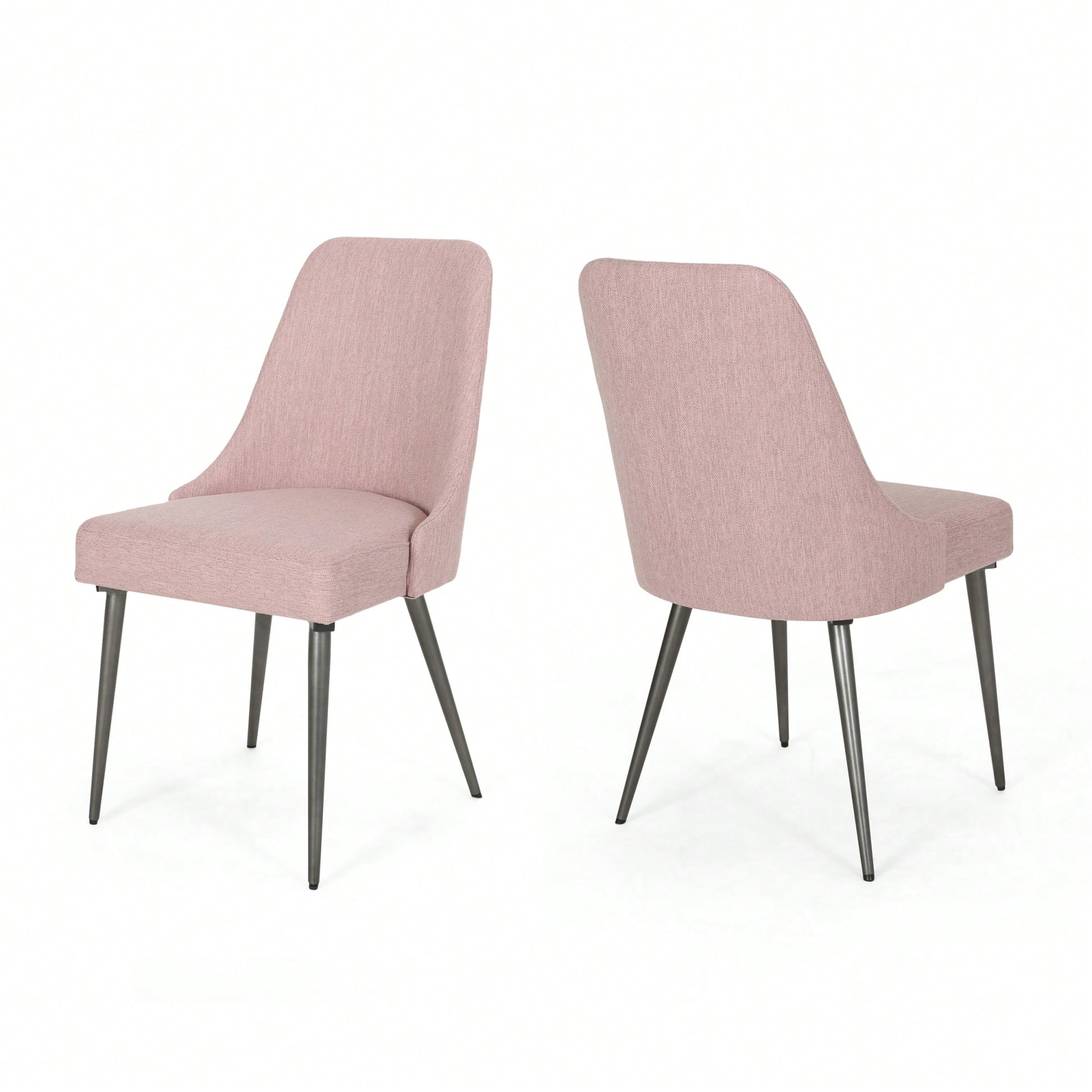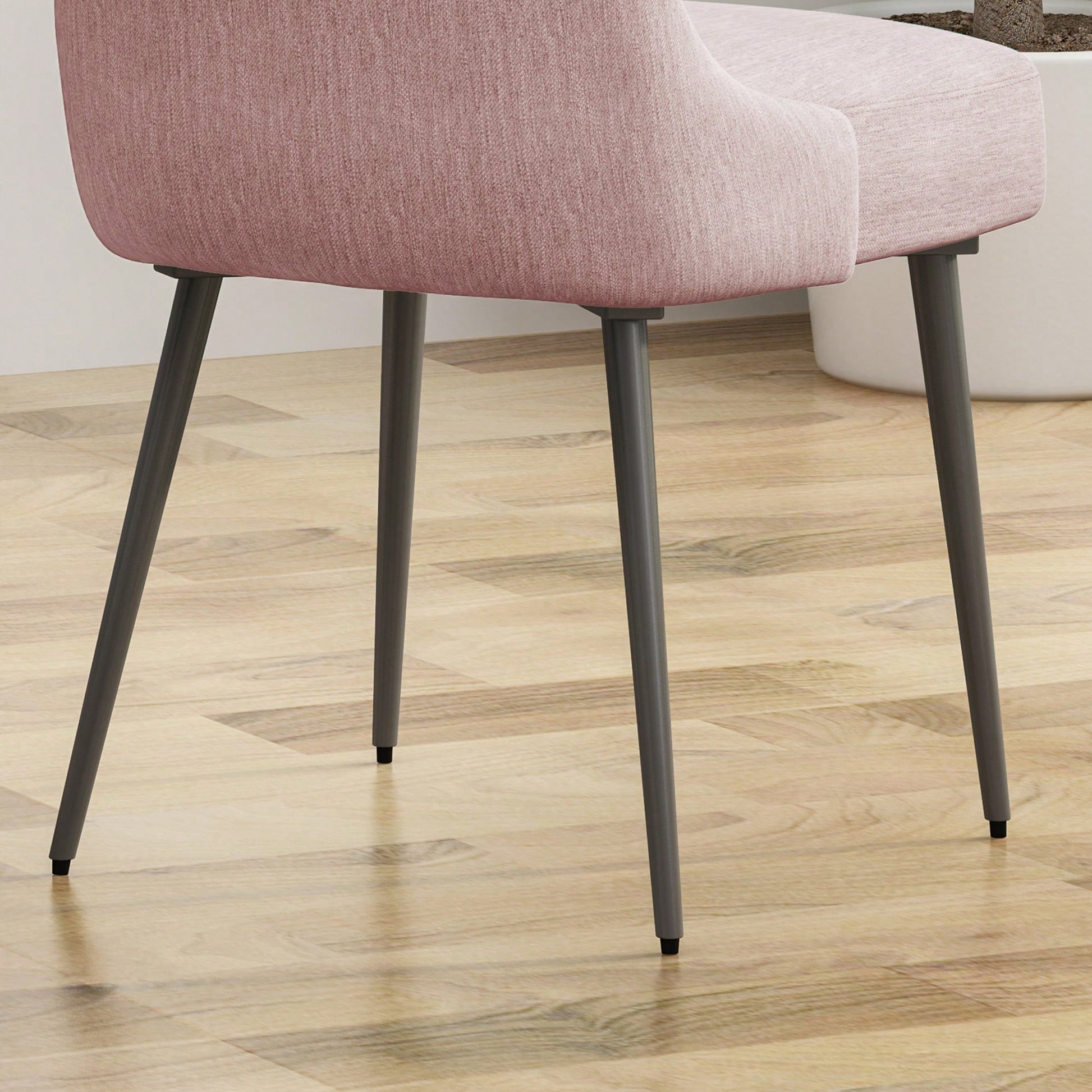Round out your dining room décor with dependable seating provided by this enchanting modern dining chair set. The chairs feature fresh colors and a modern finish, complemented by sturdy powder-coated iron legs that ensure durability. The simplistic structure, highlighted by a curved backrest and straight, angled legs, adds an elegant touch to any home. The upholstered design offers a smooth appearance and padded foam seating for exceptional comfort. Ideal for creating a unique dining set, this set includes two chairs that will enhance the style of your dining room.