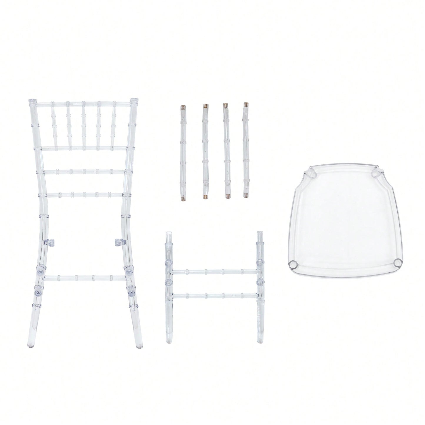 1. Features: - Simple and elegant design - Made from durable acrylic - Easy to assemble - Suitable for outdoor events - Low maintenance and easy to clean 2. Product Description: This beautiful transparent bamboo chair features a simple and generous design that aligns with current fashion . Crafted from high-quality acrylic, it offers both durability and style. The chair is easy to assemble, making it a convenient choice for any wedding or outdoor party. Its aesthetic appeal and practicality make it an excellent addition to your event furniture. Specifications: - Material: Acrylic - Design: Transparent bamboo style - Assembly: Self-assembly required - Use: Suitable for outdoor parties and weddings
