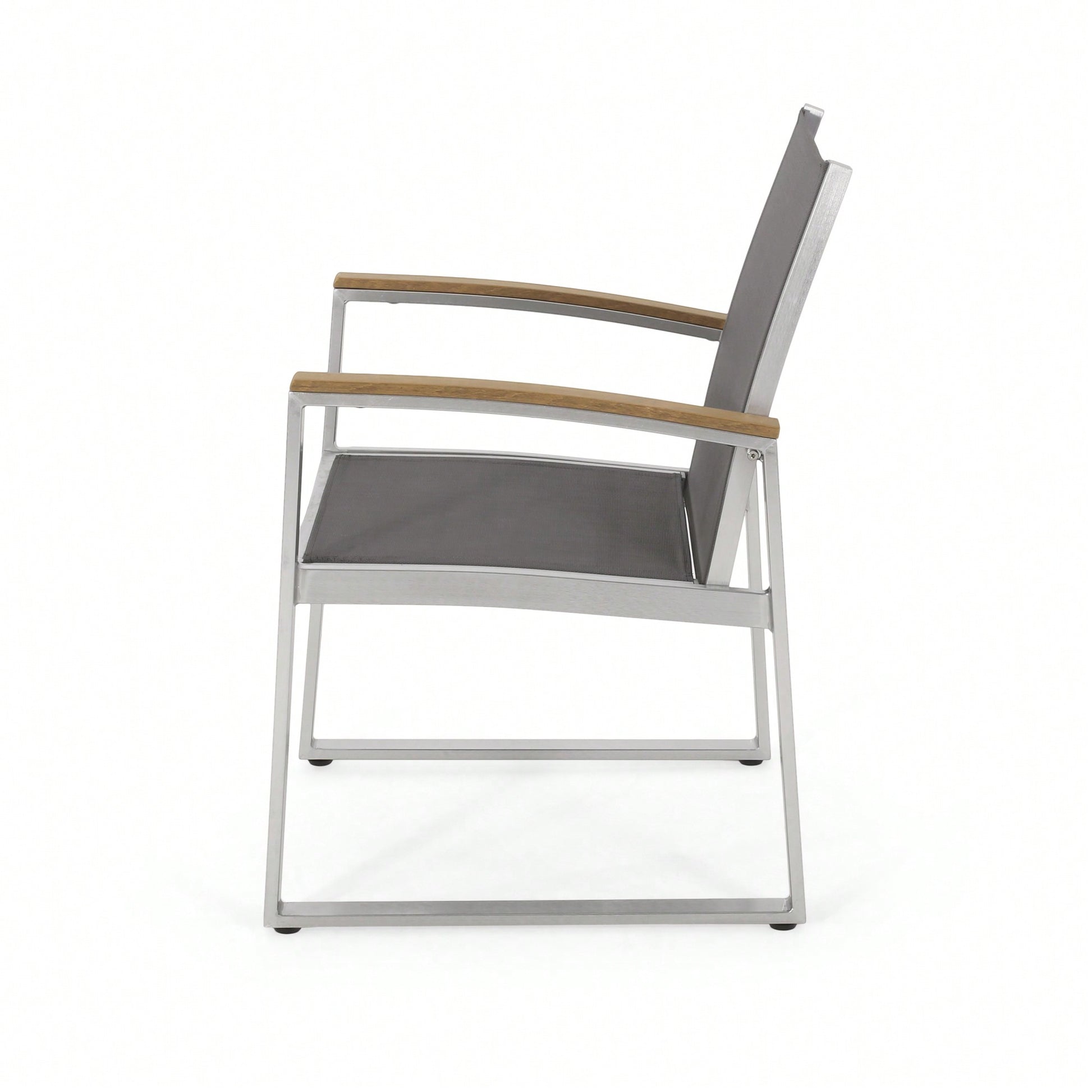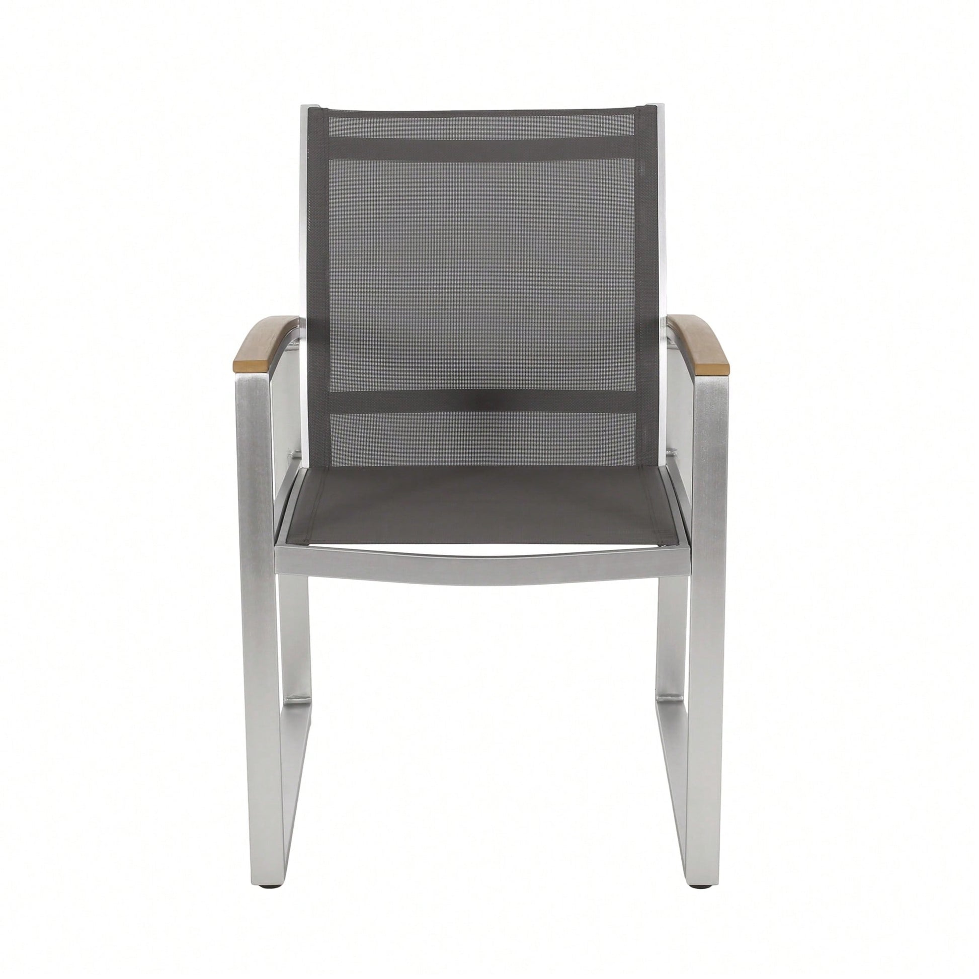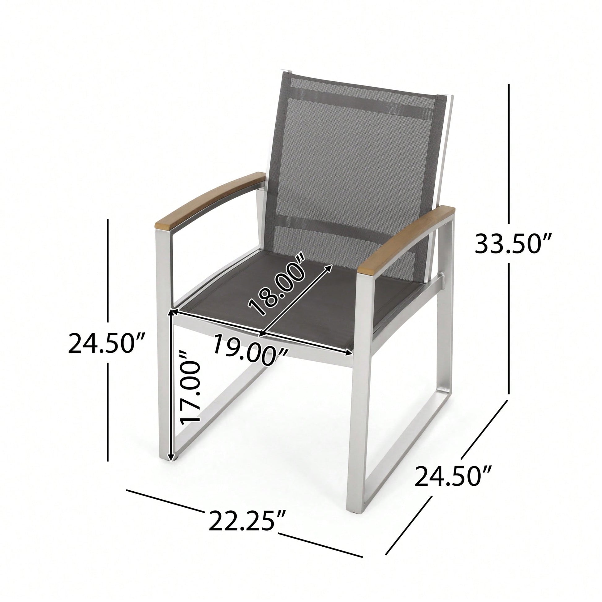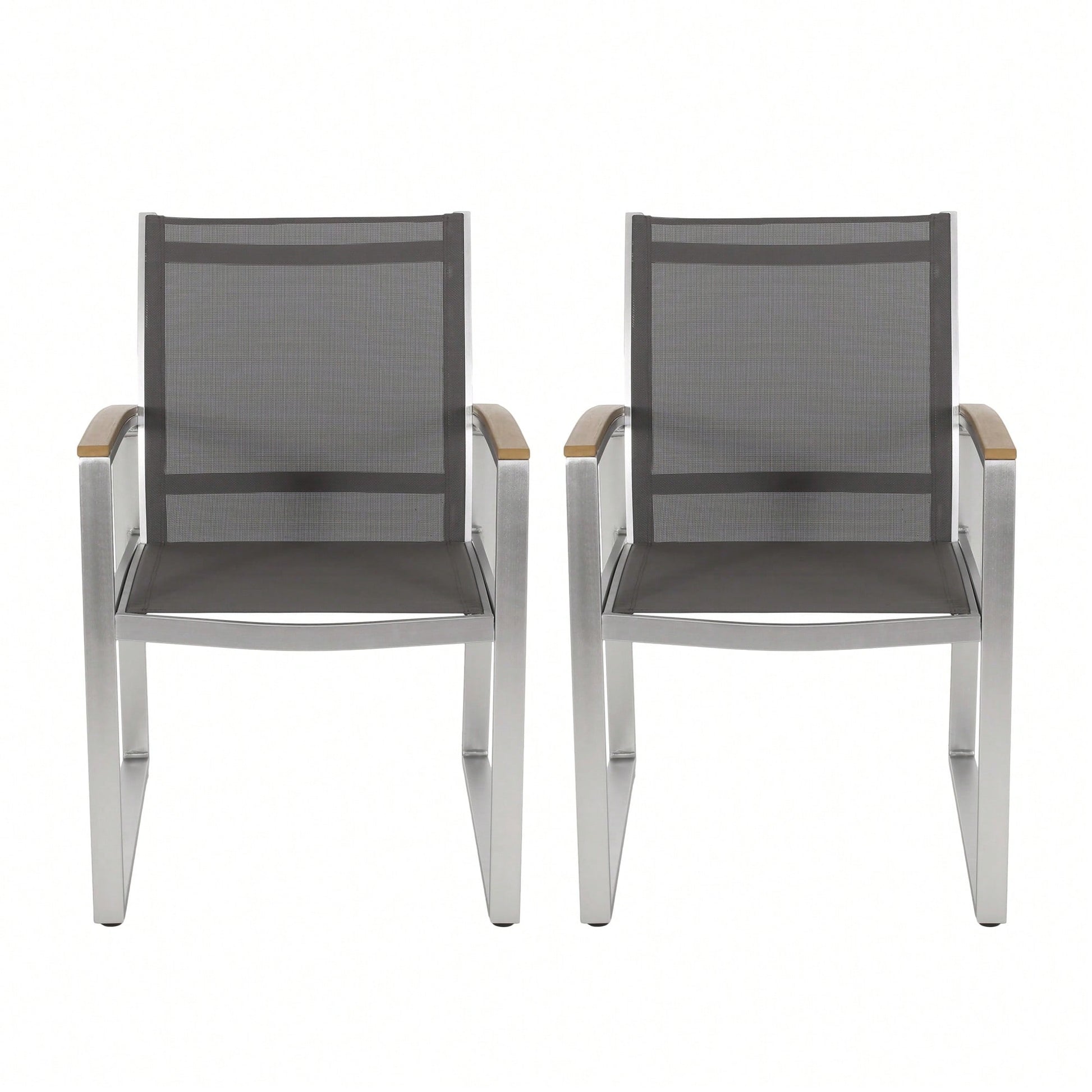 These patio dining chairs provide a stylish and comfortable seating option for outdoor dining. The combination of faux-wood arms and durable aluminum frames creates a modern aesthetic that enhances any outdoor space. The mesh seat and back design allows water to drain easily, making them practical for various weather conditions. Perfect for enjoying meals in the fresh air with family and friends.