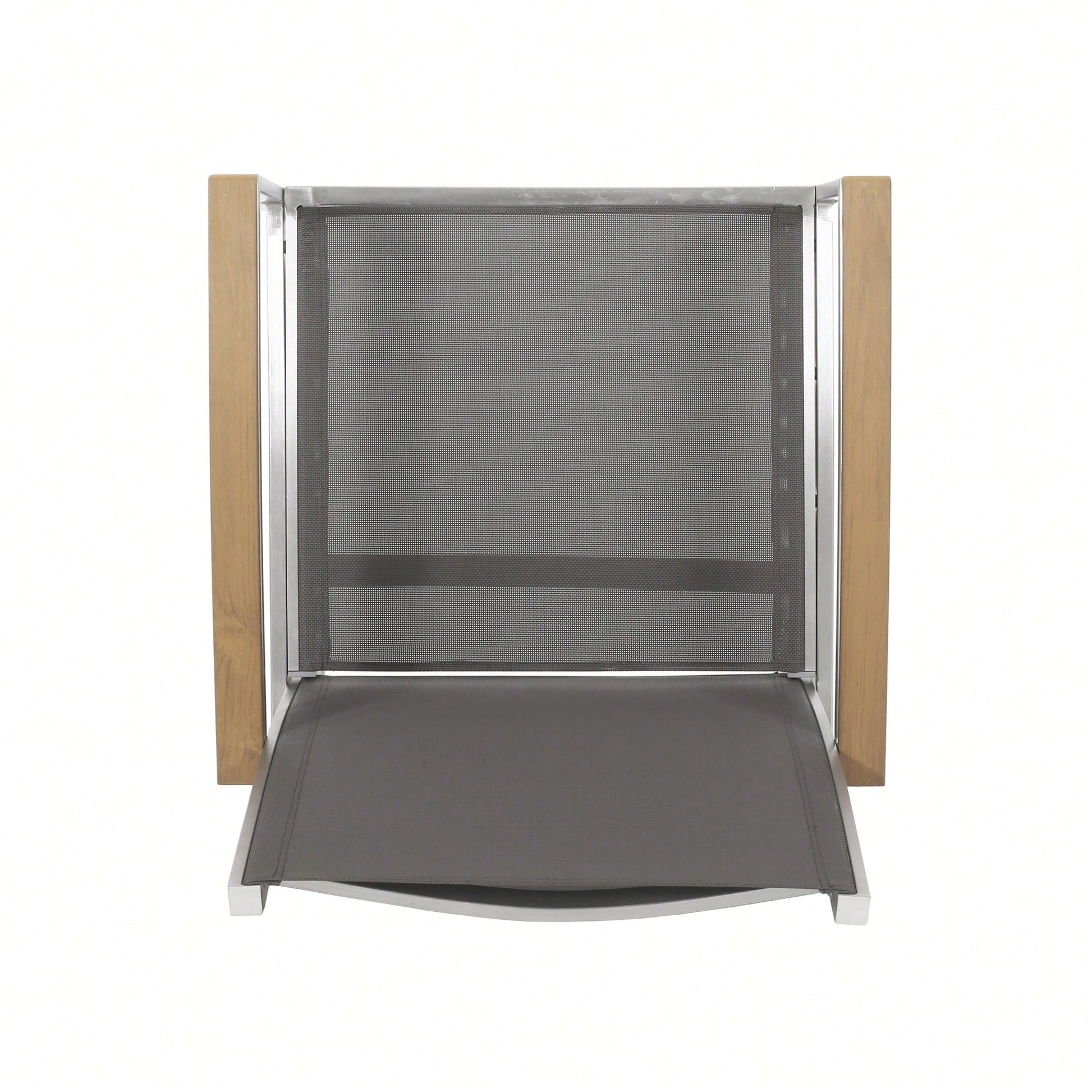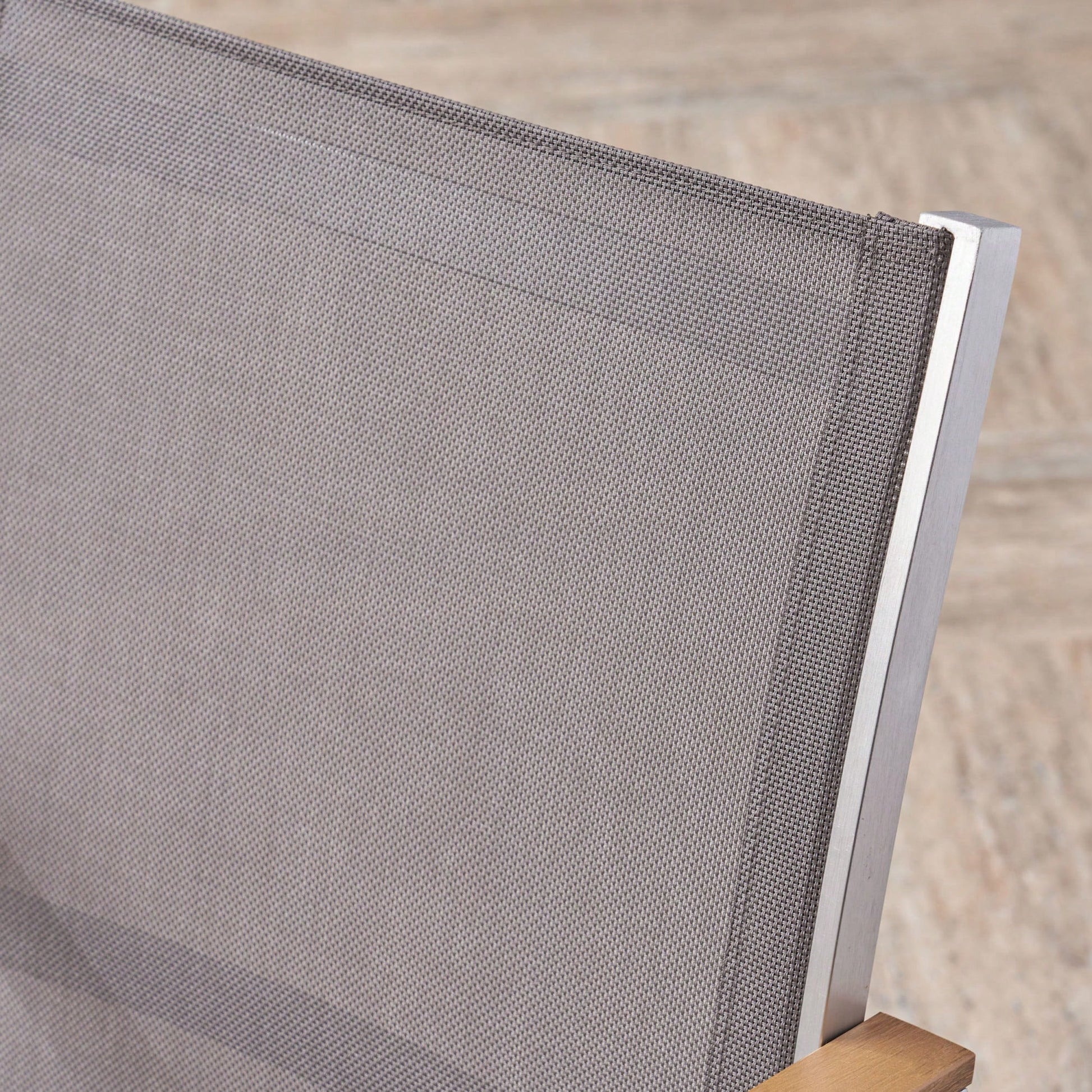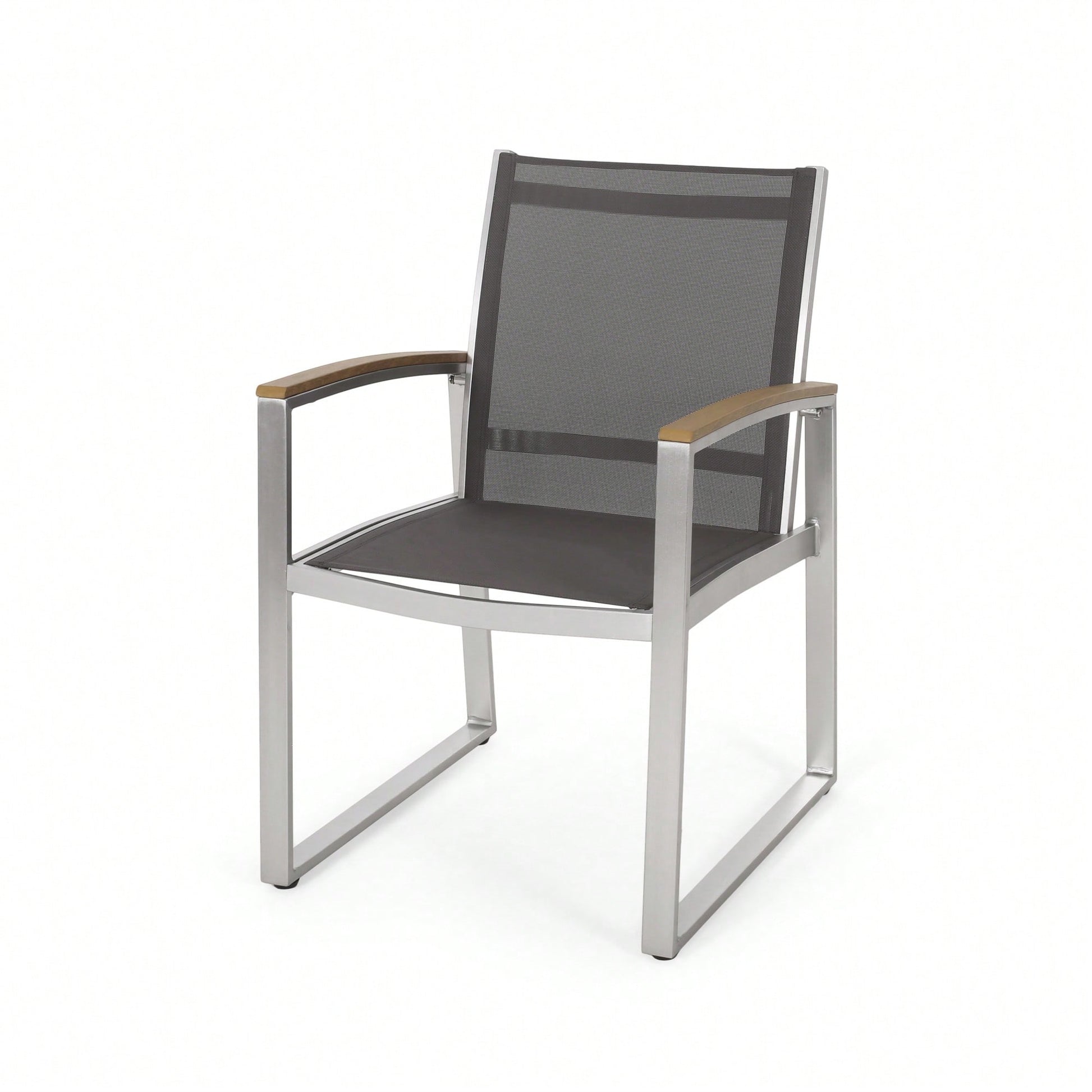 - Material: Aluminum frame, faux-wood arms, mesh seat and back