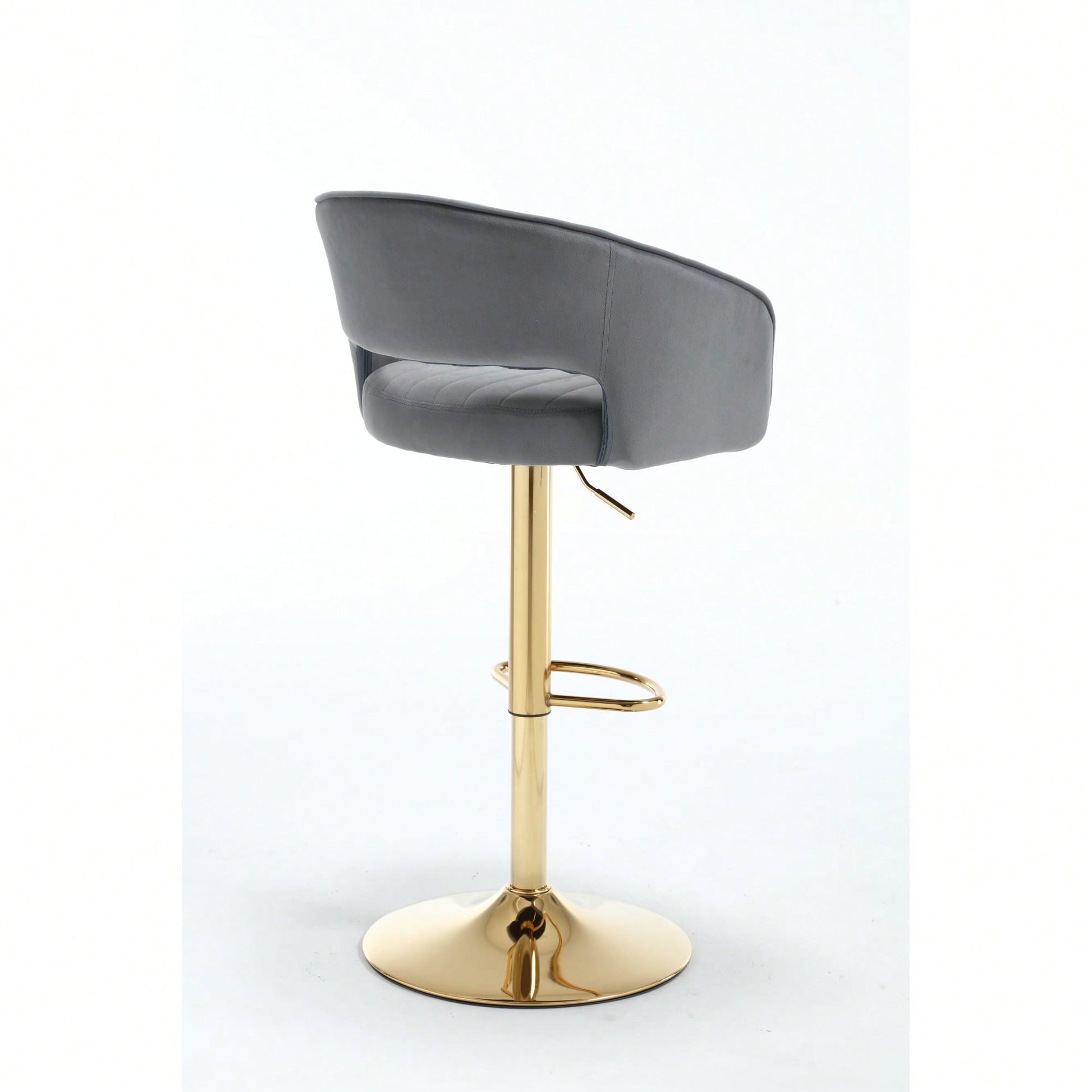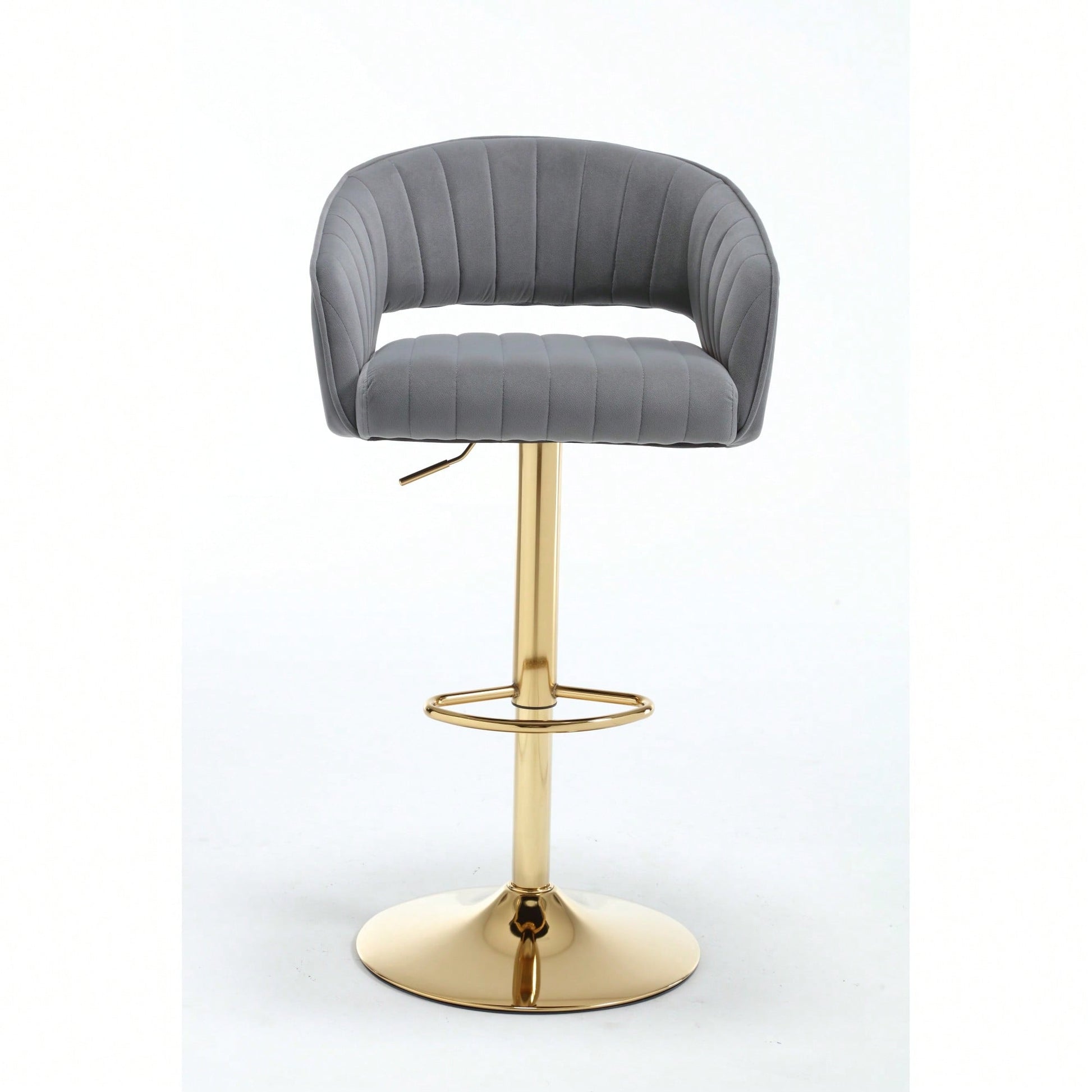 This modern velvet bar chair features a back hollowed-out design with armrests and a gold horn cross-legged base. The soft velvet fabric ensures a comfortable seating experience, whether for work or leisure. The height-adjustable mechanism allows users of all sizes to find their ideal seating position, promoting good posture and reducing discomfort during extended use. The stylish metal feet and disc-shaped base add a contemporary touch to any space, making it a perfect addition to home studies, offices, or conference rooms. Built with high-quality materials, this chair is designed for durability and stability, ensuring it remains a reliable seating option for years to come.