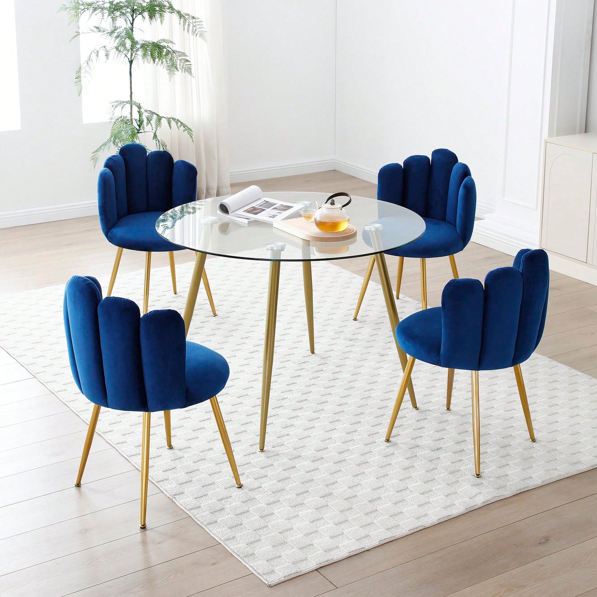 This set of modern velvet dining chairs features an elegant woven backrest and a unique arc design complemented by golden metal legs, creating a light luxury aesthetic. The soft velvet fabric and ergonomic tufted backrest ensure maximum comfort for you and your family, making them suitable for various settings including dining rooms, kitchens, living rooms, bedrooms, and powder rooms. Crafted from solid wood and thickened metal, these chairs are stable and durable. Assembly is straightforward, requiring only the attachment of the legs to the seat.
