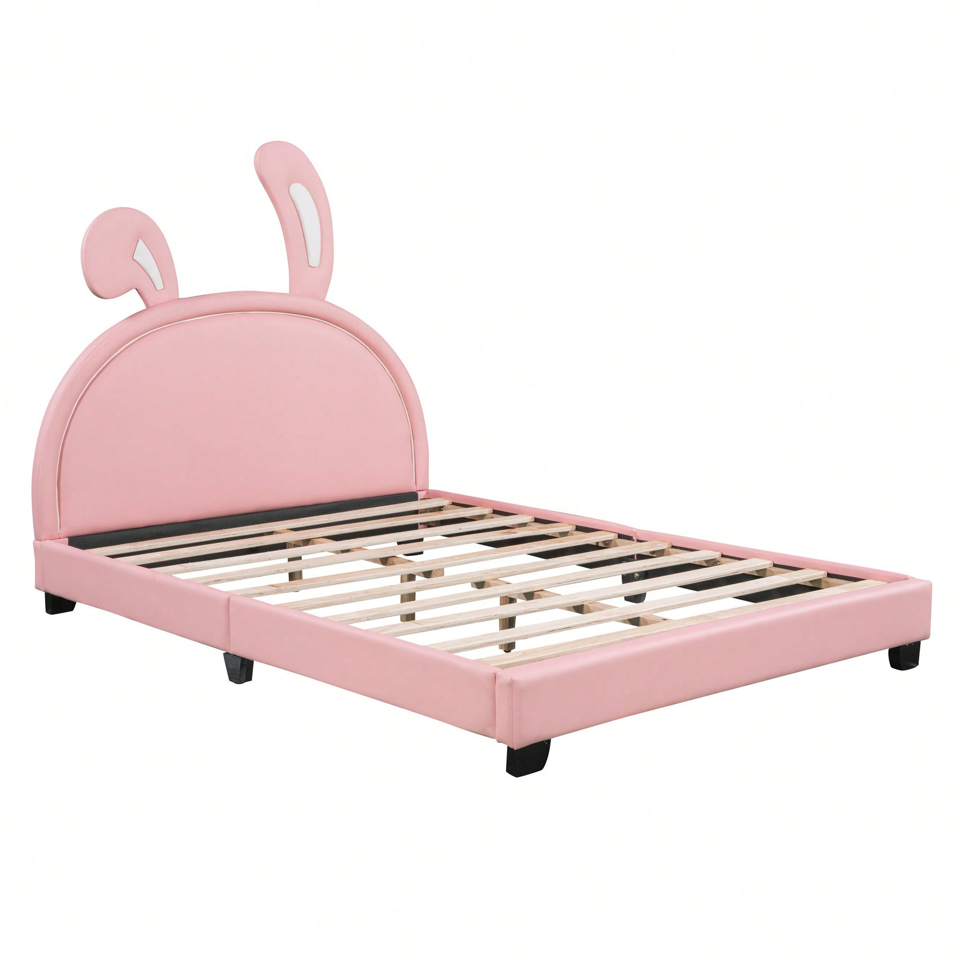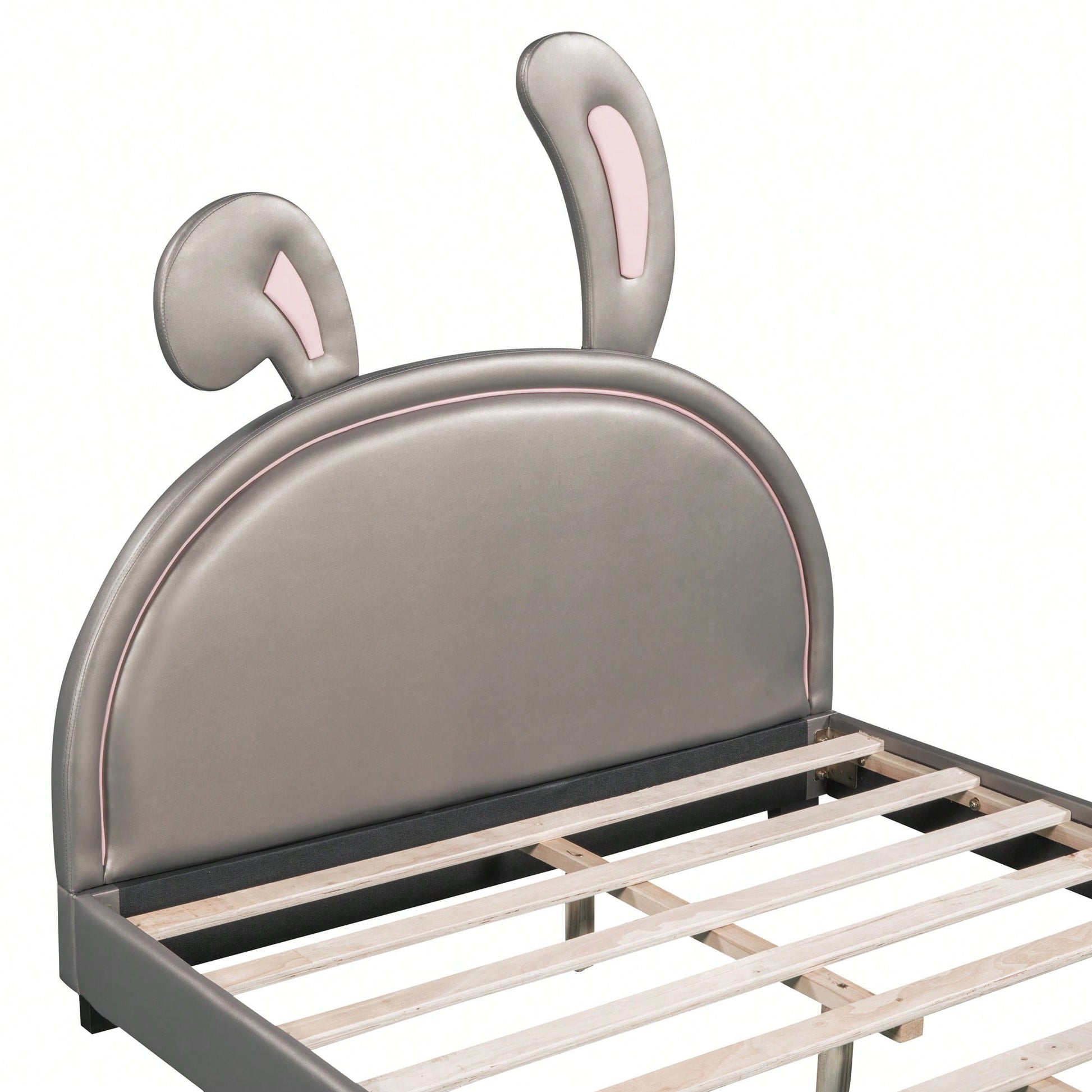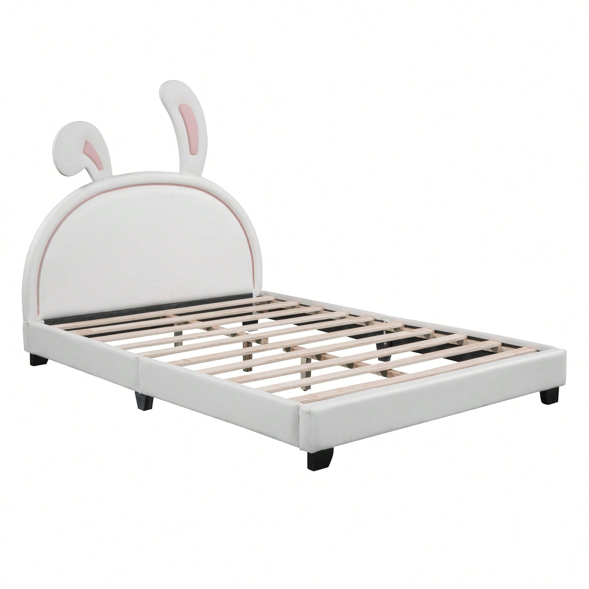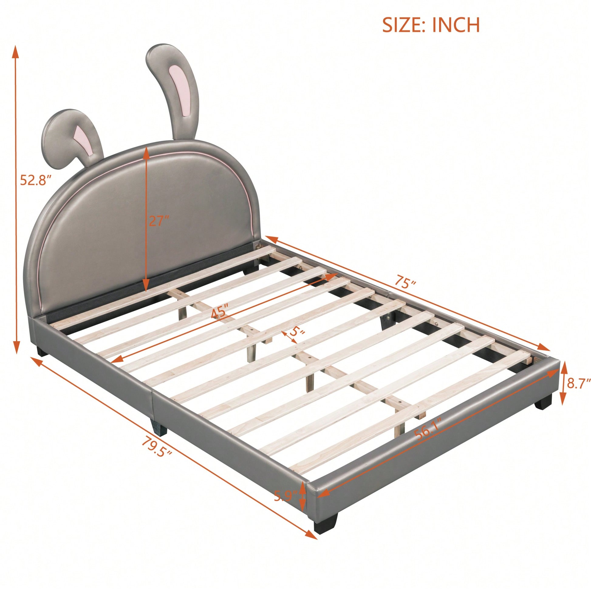 This full-size upholstered leather platform bed features an adorable rabbit ornament design, making it an ideal choice for your child's bedroom. With a load capacity of up to 400 lbs, the bed provides a stable and secure sleeping environment. Crafted from high-quality pine wood, the frame is resistant to humidity changes, ensuring long-lasting use. The included slats eliminate the need for a box spring, and assembly is straightforward with clear instructions provided. This bed combines functionality with a delightful aesthetic that will surely delight your little one.