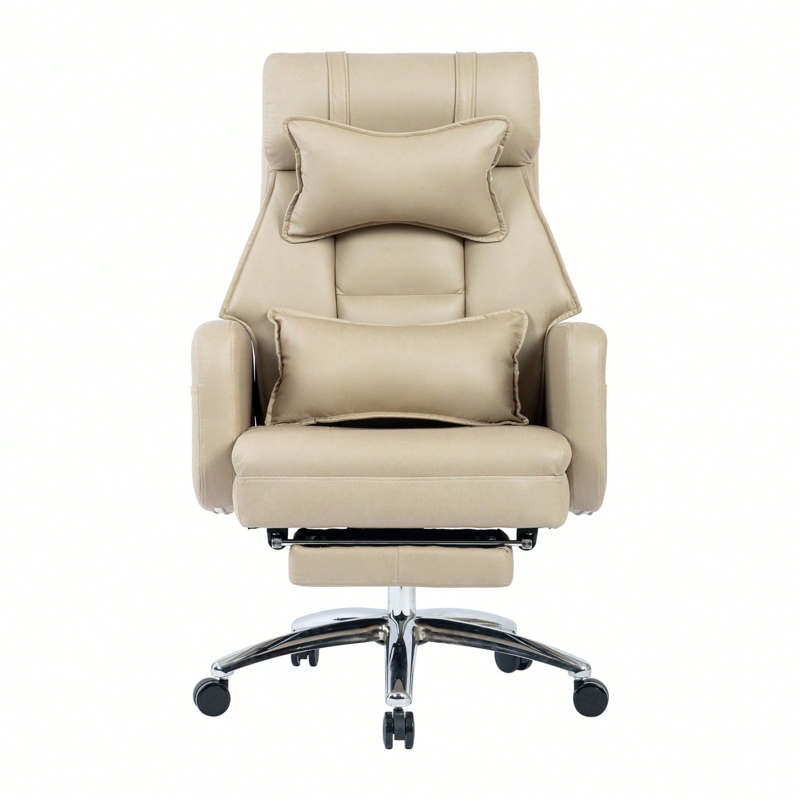 This ergonomic office chair is designed for comfort during long hours of work. It features a high back with lumbar support and a headrest, ensuring proper posture and reducing fatigue. The chair is upholstered in technology leather, which is soft, breathable, and durable, making it suitable for daily use. A hidden footrest can be pulled out for added relaxation during breaks, allowing for a comfortable lying position. With a reclining angle of up to 155°, this chair seamlessly transitions between work and leisure activities.