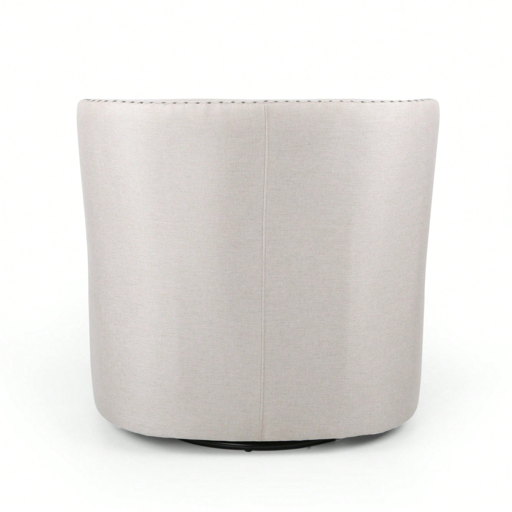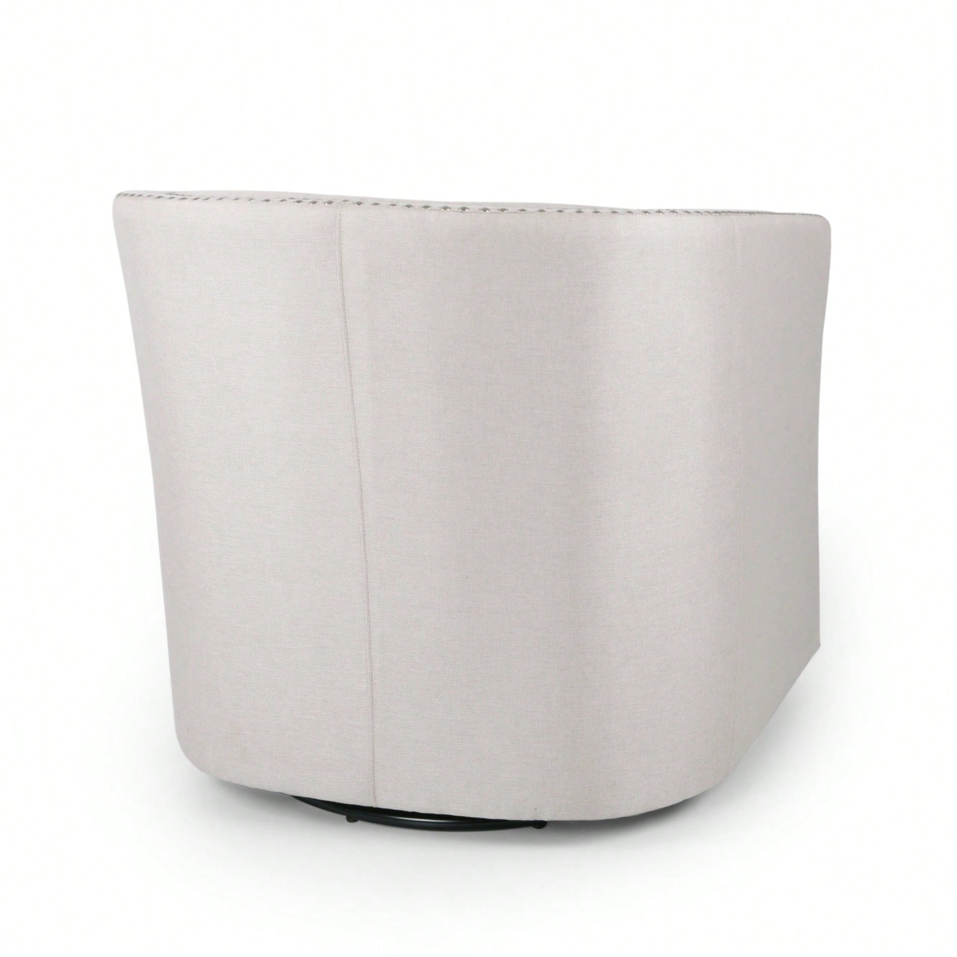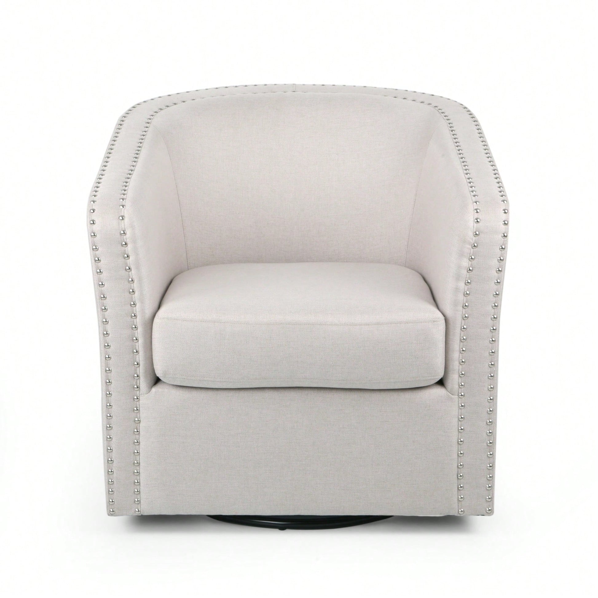 This swivel chair combines contemporary design with functionality, featuring a minimalistic yet refined structure that emphasizes comfort. The barrel club chair design envelops you with its gently sloped arms, enhancing your seating experience. The convenient swivel function allows for effortless movement, making it easy to get in and out without needing to adjust the chair's position. The carefully applied nailhead accents along the armrest and backrest add a touch of elegance, showcasing expert craftsmanship. Transform your living space with this stylish and comfortable swivel chair.