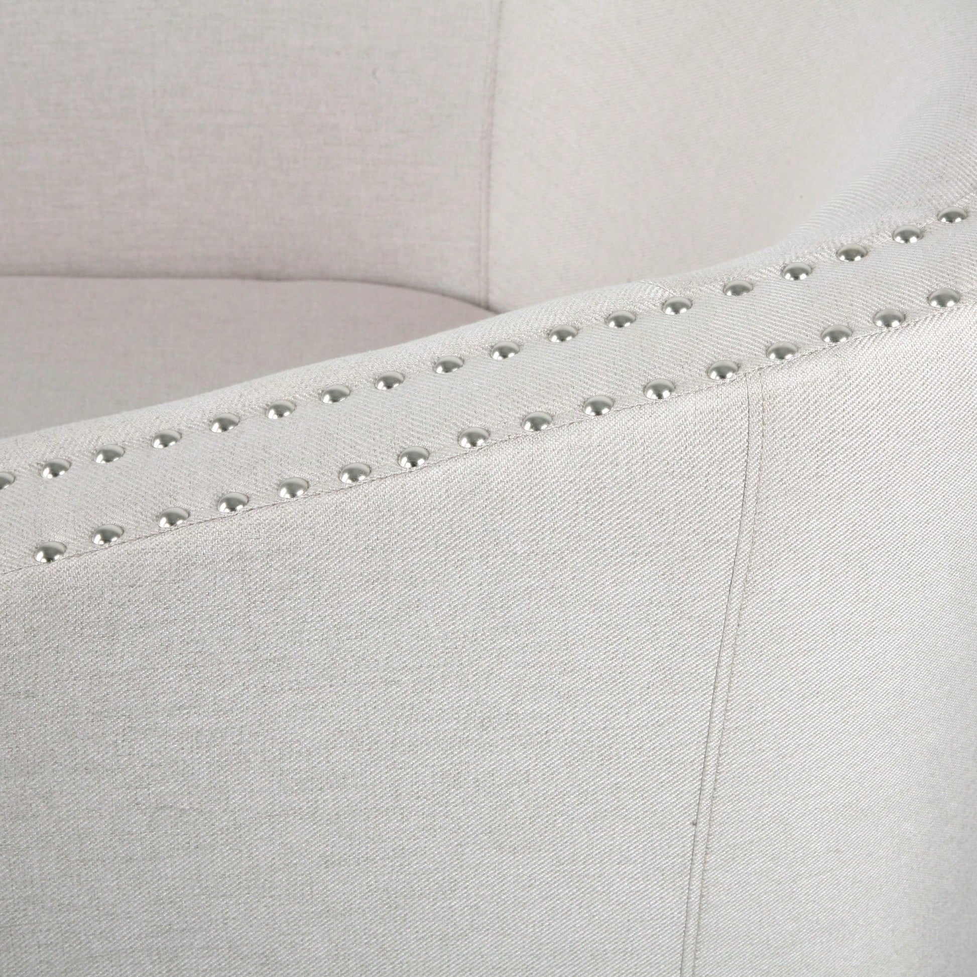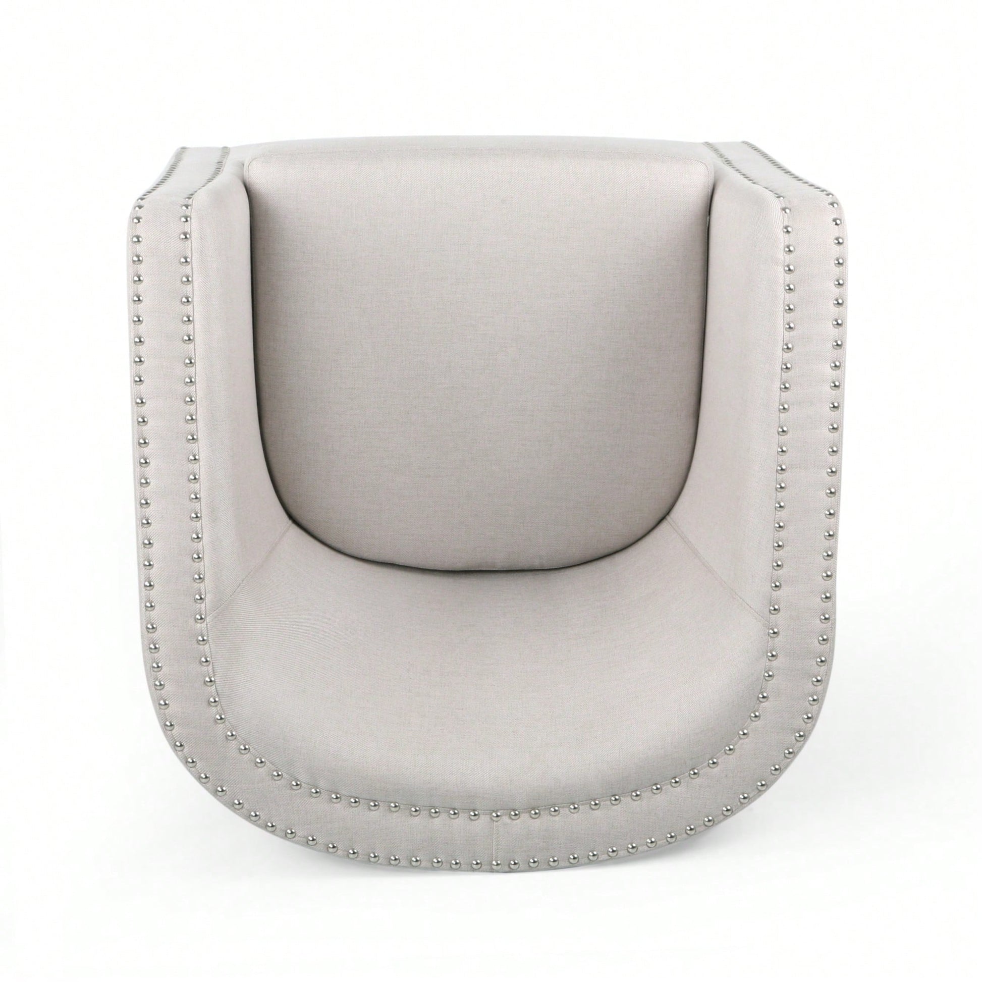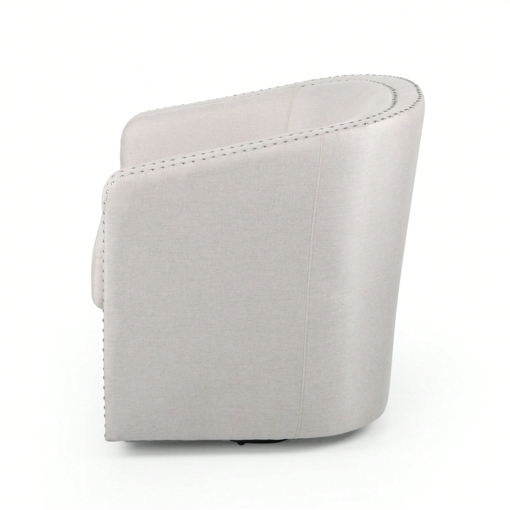 This swivel chair combines contemporary design with functionality, featuring a minimalistic yet refined structure that emphasizes comfort. The barrel club chair design envelops you with its gently sloped arms, enhancing your seating experience. The convenient swivel function allows for effortless movement, making it easy to get in and out without needing to adjust the chair's position. The carefully applied nailhead accents along the armrest and backrest add a touch of elegance, showcasing expert craftsmanship. Transform your living space with this stylish and comfortable swivel chair.