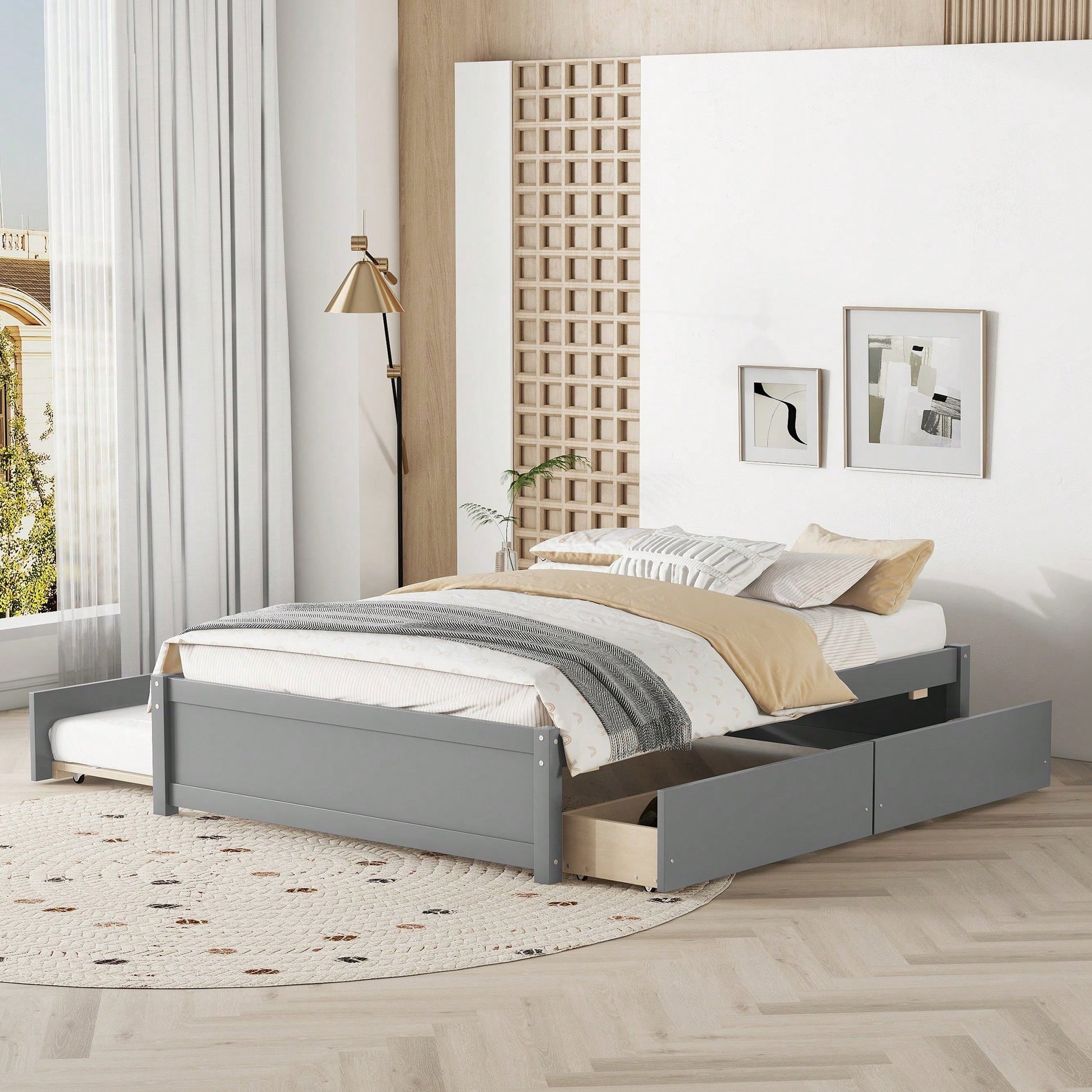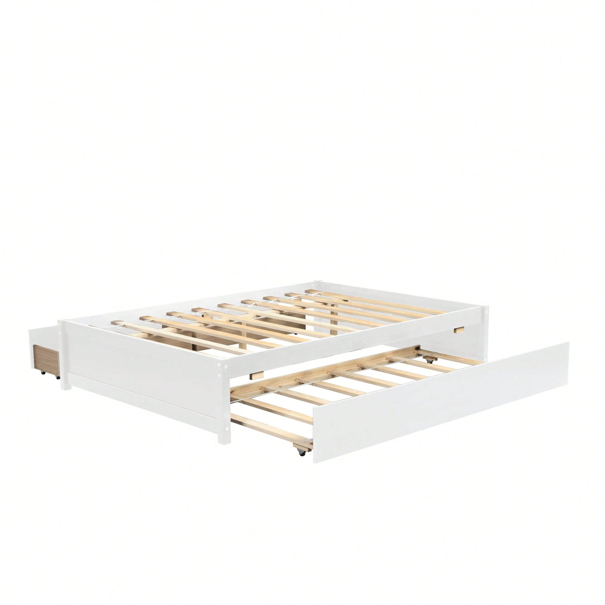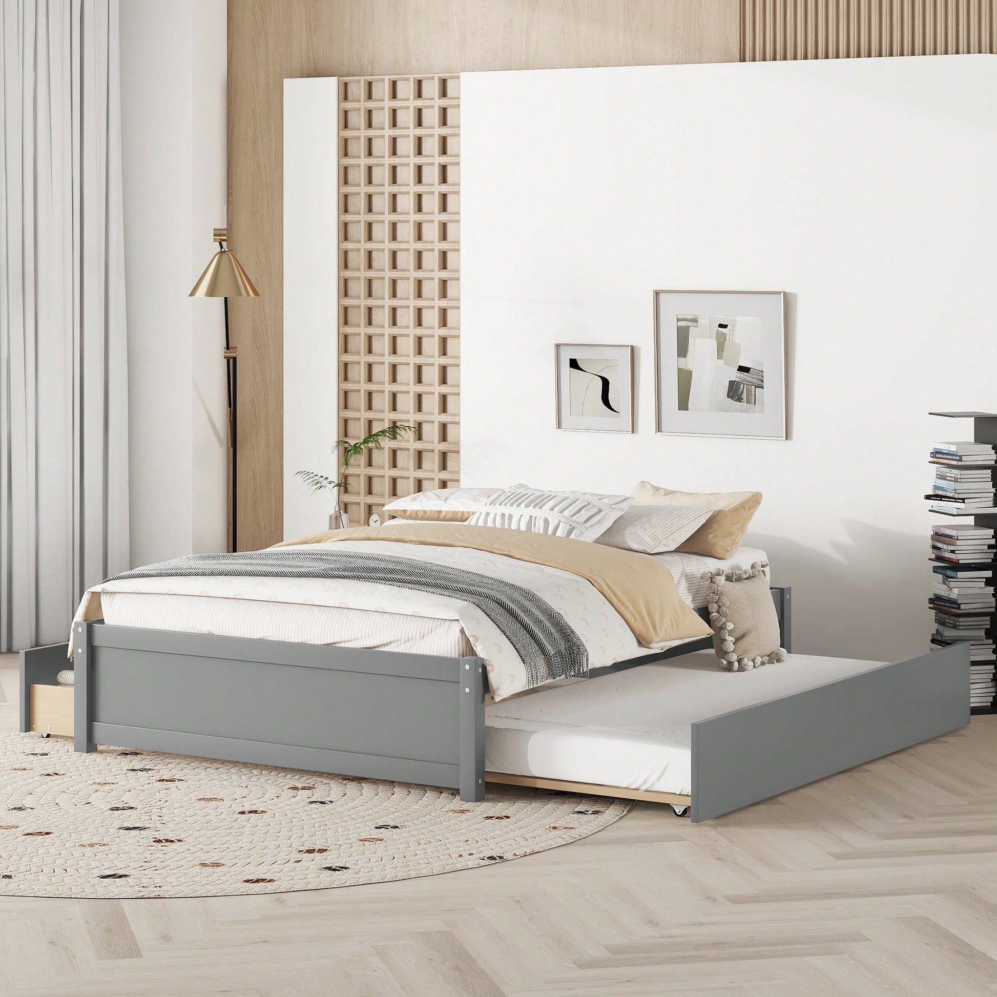 1. Features: - Solid wood frame made of sturdy pinewood and plywood for enhanced stability and durability - Modern design with an elegant headboard and footboard suitable for various room styles - Space-saving features include 2 drawers and a twin size trundle for extra storage and sleeping space - Extra middle support legs increase weight capacity and stability - No box spring needed; mattress can be placed directly on solid wood slats 2. Product Description: This full bed with a twin size trundle offers a perfect blend of style and functionality. Constructed from high-quality pinewood and plywood, it provides a sturdy and durable sleeping solution. The modern and clean design of the headboard and footboard adds an airy feel to any room. With two drawers for storage and a trundle bed that easily rolls out, this bed maximizes space while keeping your bedding and seasonal items organized. The additional middle support legs enhance the bed's stability and weight capacity, ensuring a safe sleeping environment. The included solid wood slats eliminate the need for a box spring, allowing for direct mattress placement while providing ventilation. Specification: Overall Product Dimension: 79.52"L x 56.96"W x 15.67"H Mattress not included Slats included, no box spring required