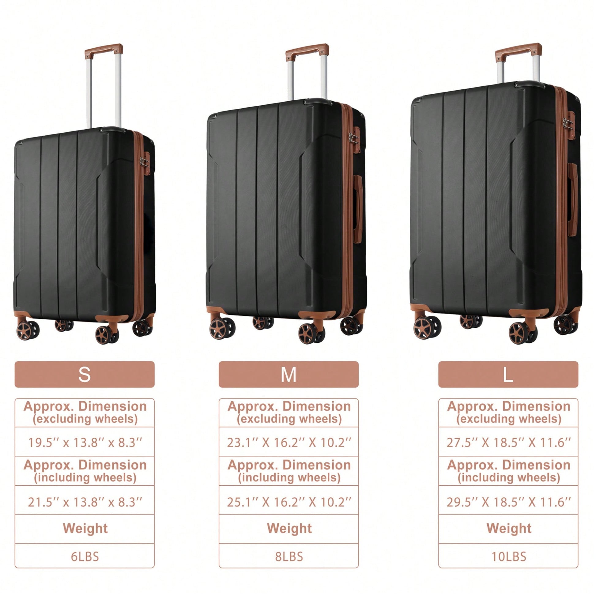 1. Key Features - Durable ABS hard shell for excellent wear and impact resistance - Expandable design adds 25% extra space for additional packing - TSA approved 3-dial combination lock for enhanced security - Smooth double spinner wheels for easy maneuverability - Adjustable telescopic handle with 3 height levels for user comfort 2. Product Description This luggage set includes three expandable hard shell suitcases in 20, 24, and 28 inches, designed to meet all your travel needs. Made from lightweight ABS material, these suitcases are built to withstand the rigors of travel while keeping your belongings secure. The 24-inch and 28-inch suitcases feature a 25% expansion option, allowing you to pack more items for your journey. Each suitcase is equipped with a TSA approved lock for added security during customs checks. The upgraded double spinner wheels ensure smooth navigation through busy airports and streets, while the telescopic handle adjusts to accommodate users of different heights. Corner protectors enhance durability by minimizing wear and tear from collisions. Specifications: - 20-inch suitcase: 13.8*8.3*21.5 inches - 24-inch suitcase: 16.2*10.2*25.1 inches - 28-inch suitcase: 18.5*11.6*29.5 inches