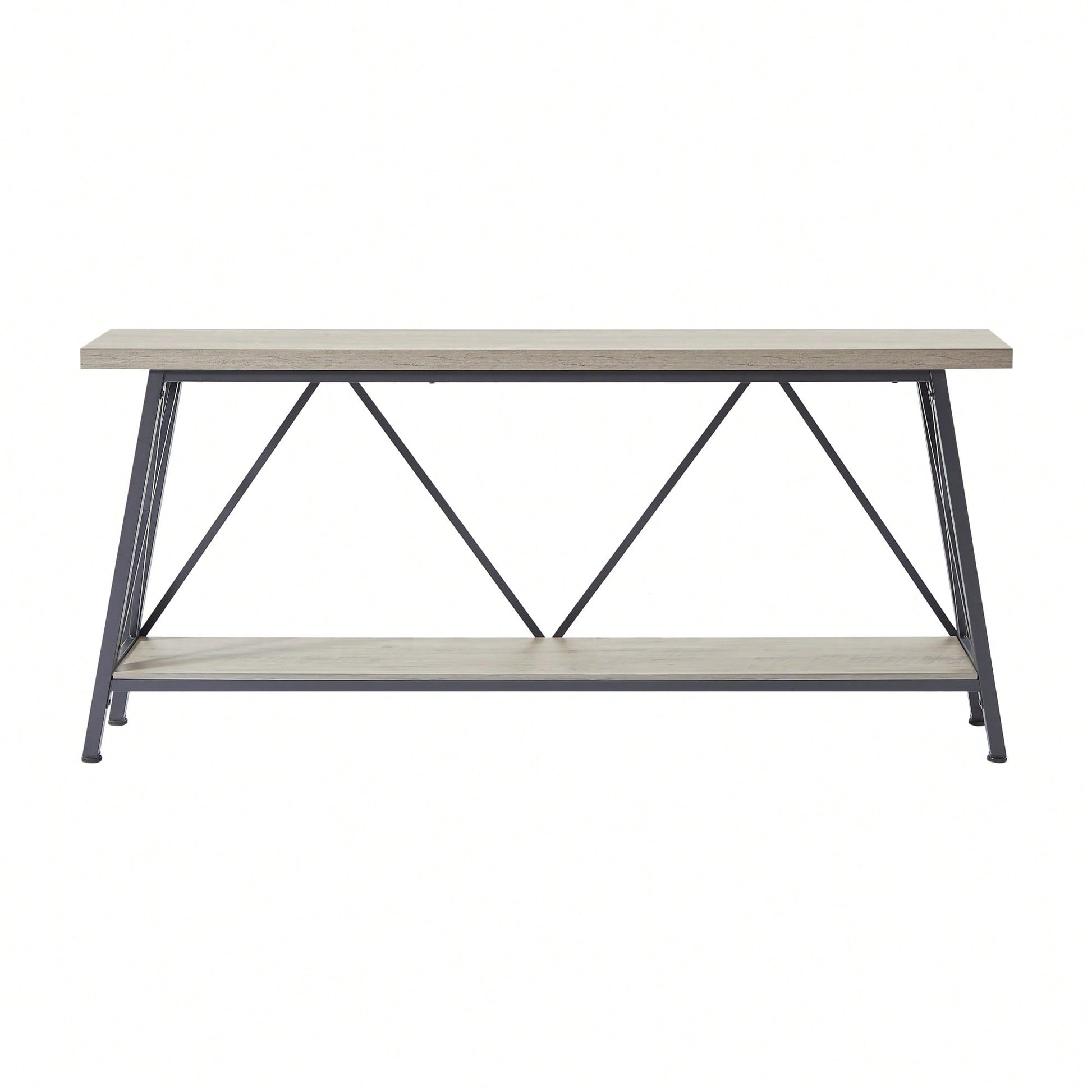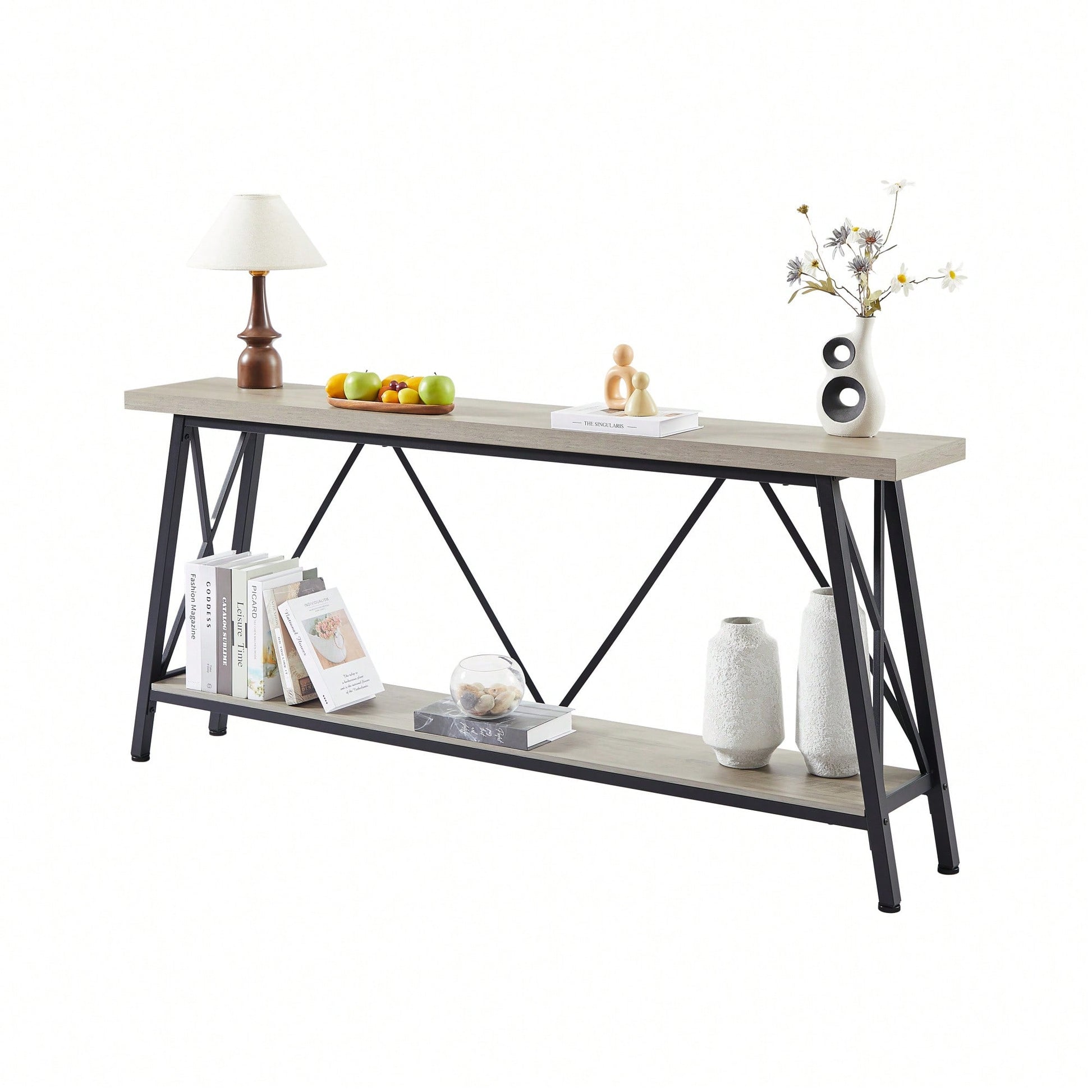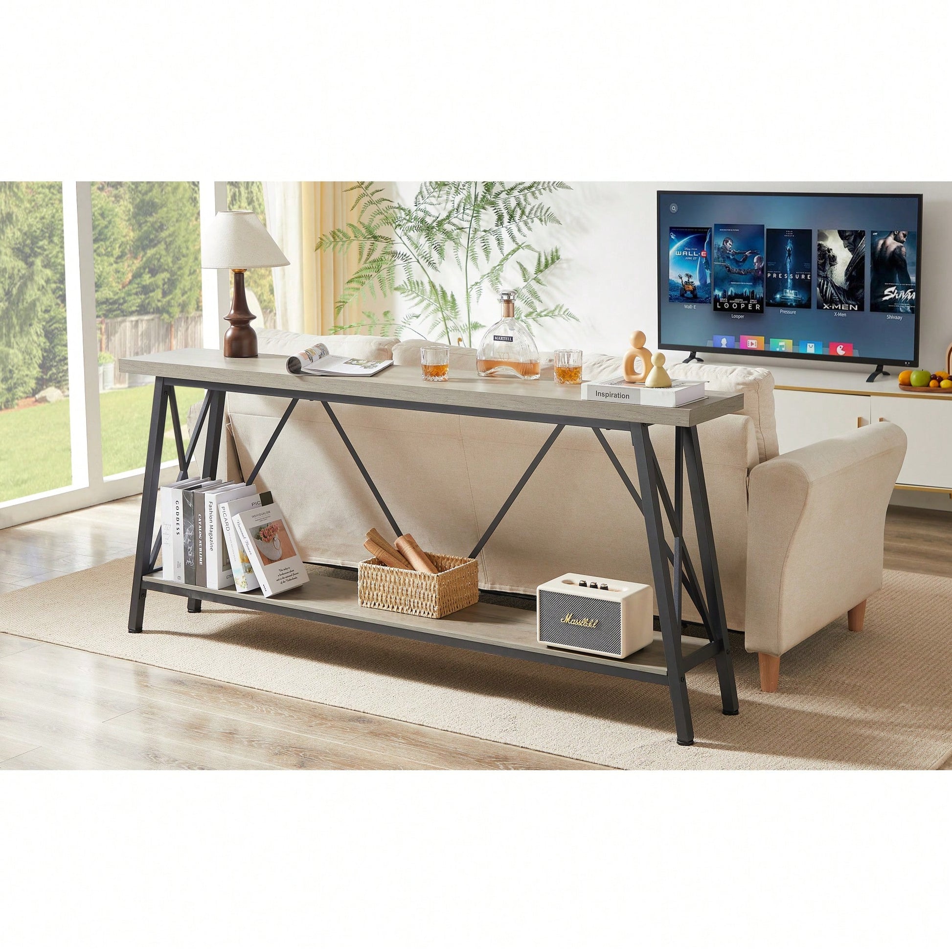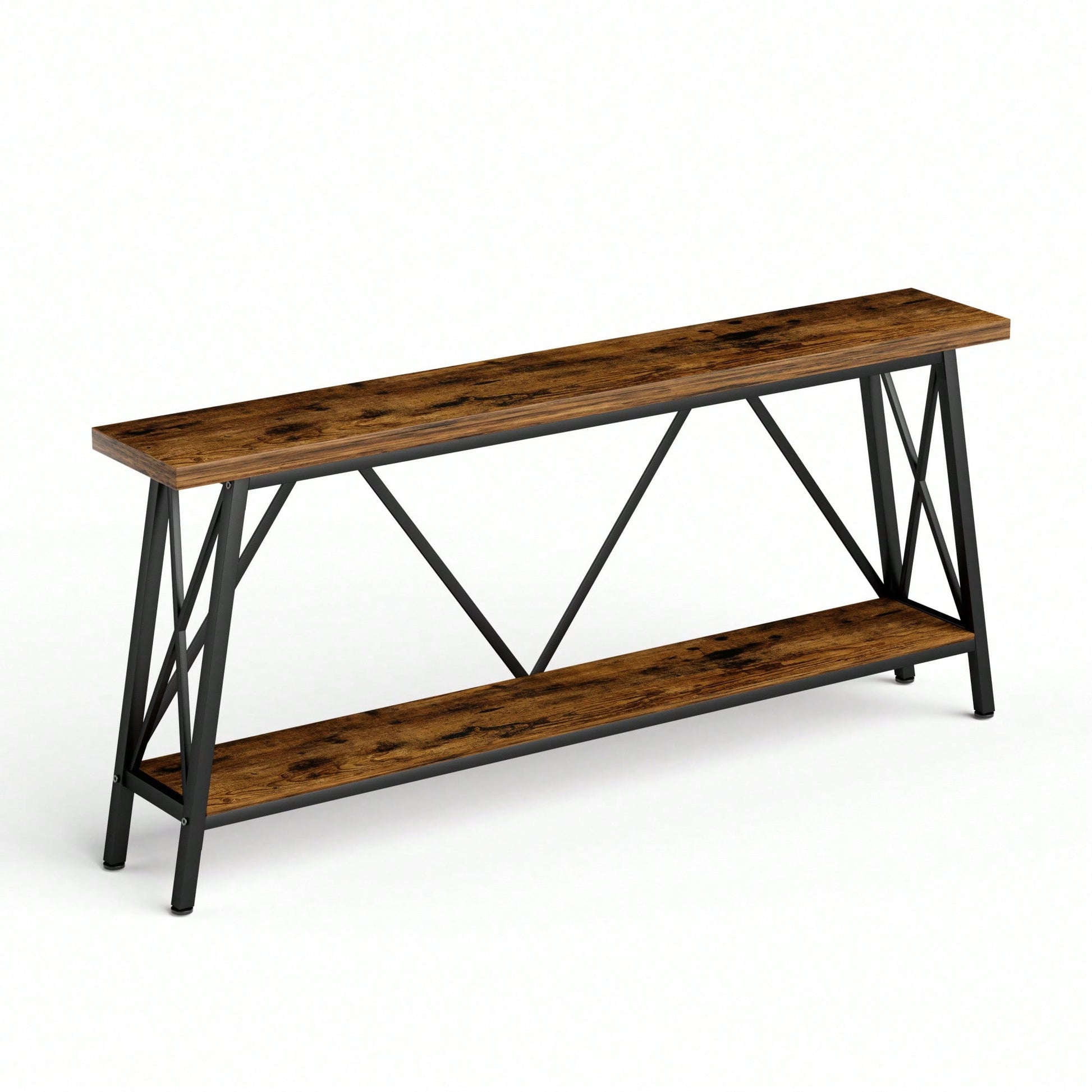 1. Key Features - Extra long size: 70.9" L x 11.8" W x 32" H - Two tiers of open storage shelves for ample organization - Strong construction with high-quality particle board and steel - Adjustable feet for stability on uneven surfaces - Chic industrial design in rustic gray and black 2. Product Description This extra long sofa table is designed to fit seamlessly in various spaces, whether behind a sofa or in a narrow entryway. It features two tiers of open storage shelves that allow you to display your favorite items while providing additional storage for sundries and decorations. Constructed from high-quality particle board and steel, the table boasts an X-shaped side frame and M-shaped back for enhanced stability. The tabletop is 1.6" thick, ensuring a strong weight capacity, while the durable surface is easy to clean. The adjustable feet help maintain balance and prevent floor scratches. With its rustic gray and black finish, this table adds a modern touch to any living room, hallway, or foyer. Specifications: - Overall size: 70.9" L * 11.8" W * 32" H - Tabletop thickness: 1.6"