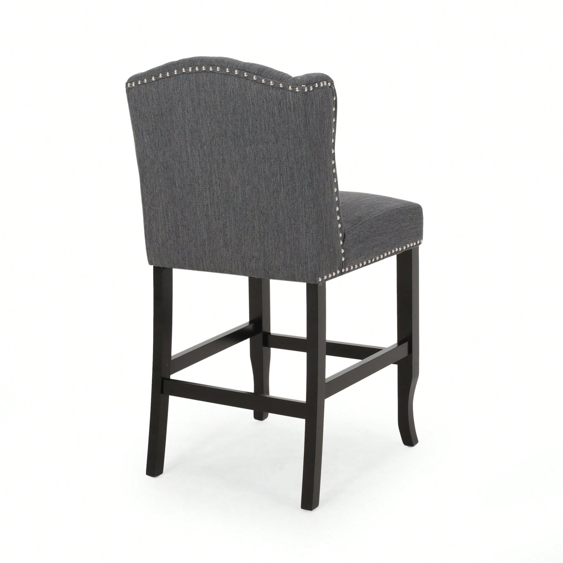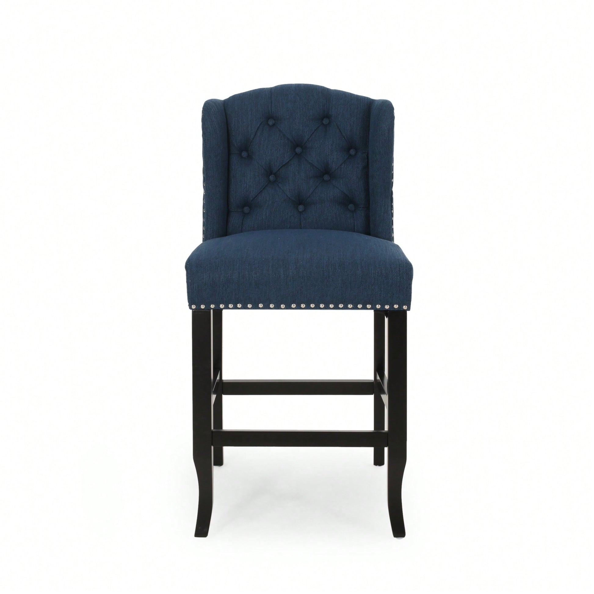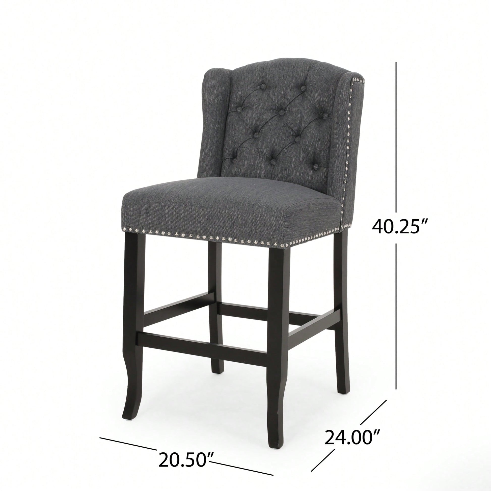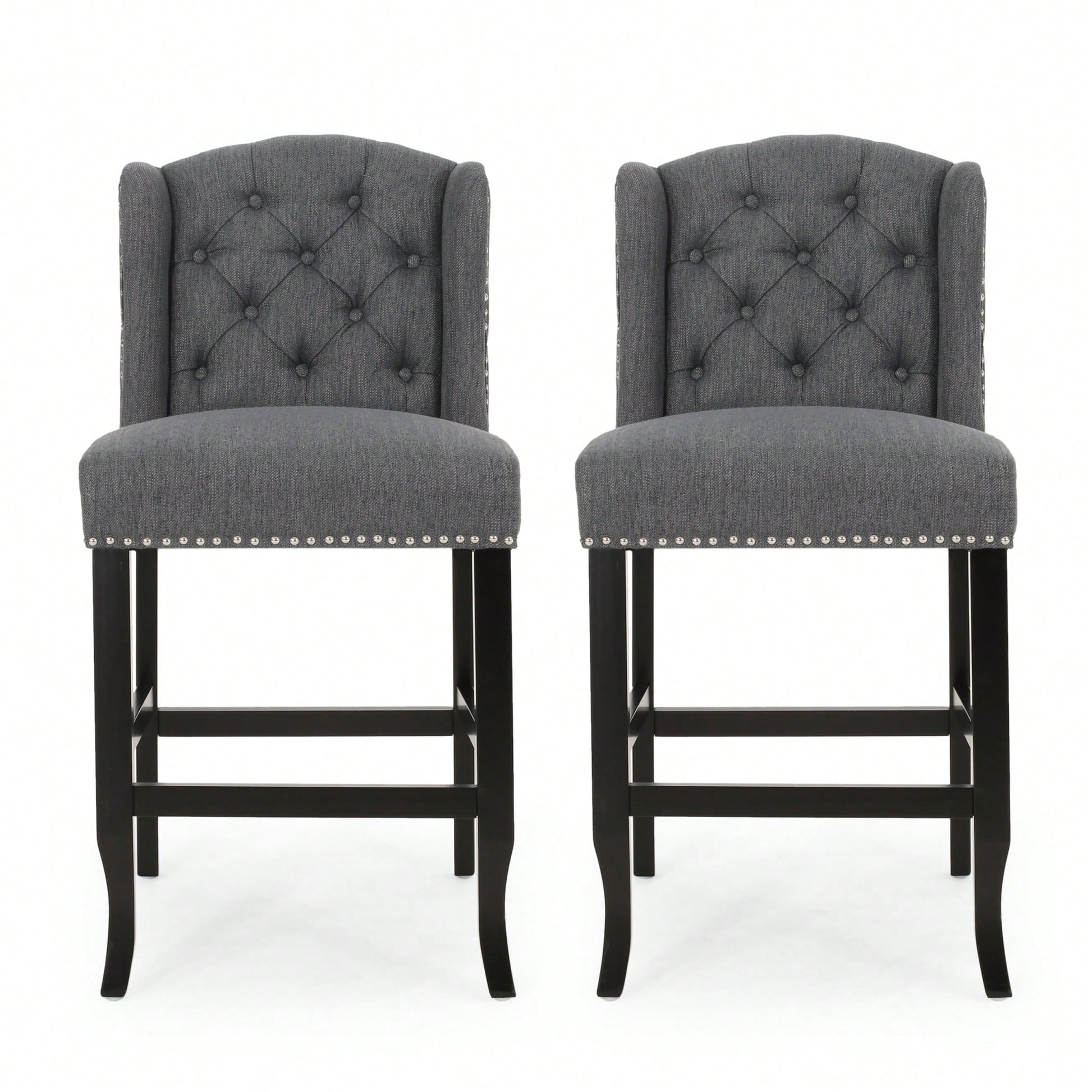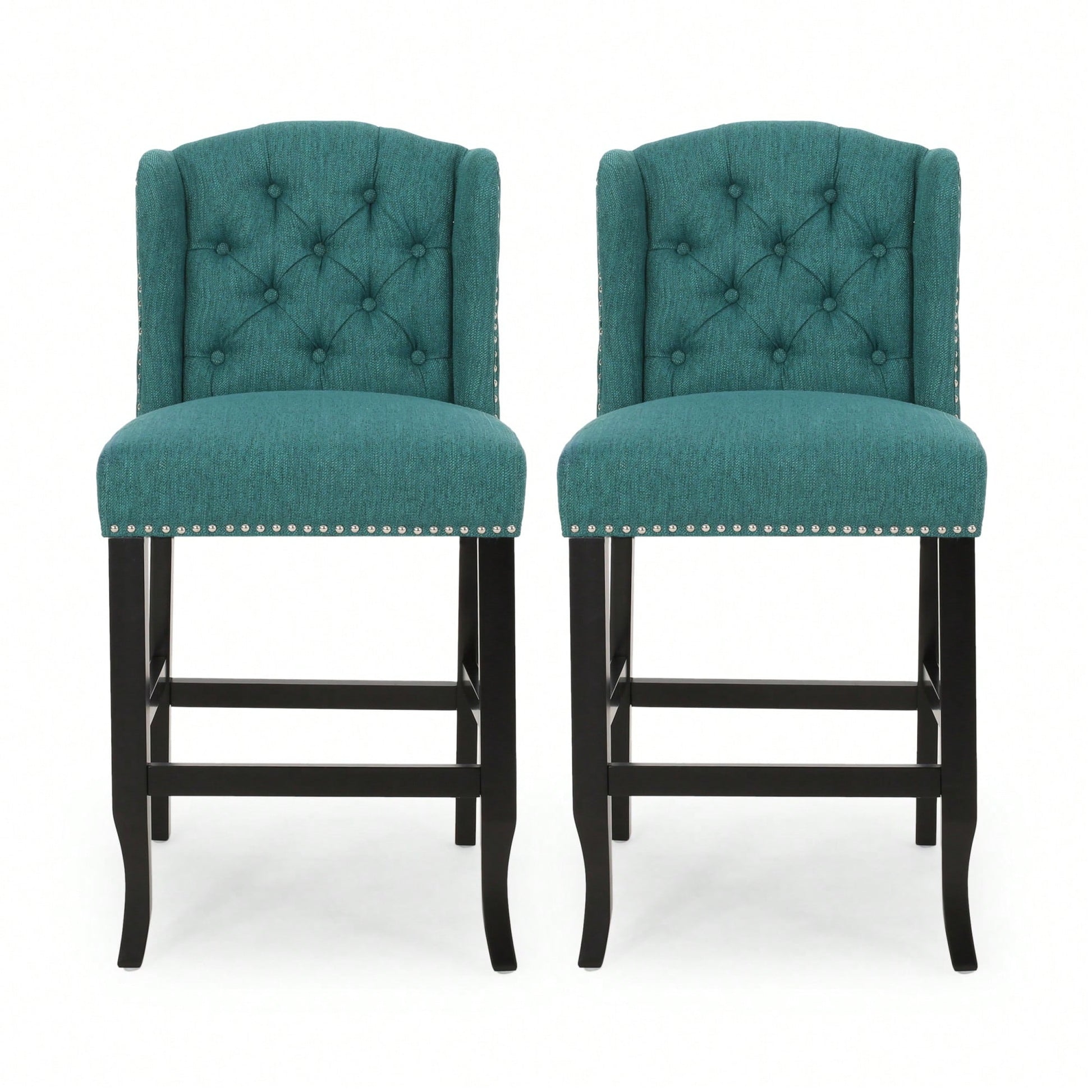 This set of two fabric tufted wingback counter stools features a button-tufted diamond stitch backrest that enhances its contemporary design while providing comfort. The wingback design not only adds a classic touch but also helps trap heat and shield from drafts. Tasteful nailhead accents border the seat and wings, showcasing a beautiful, hand-crafted finish. Constructed from durable rubberwood, these stools boast a natural-grain look, making them a standout addition to any room. With a seat height of 27 inches, they are perfect for kitchen islands or breakfast nooks.