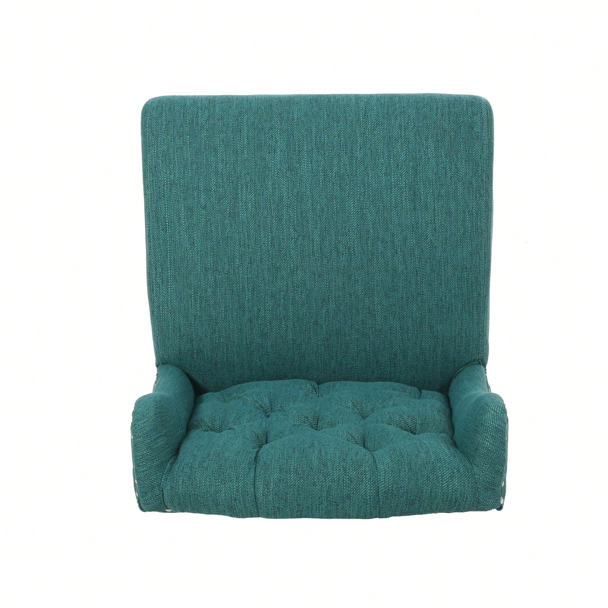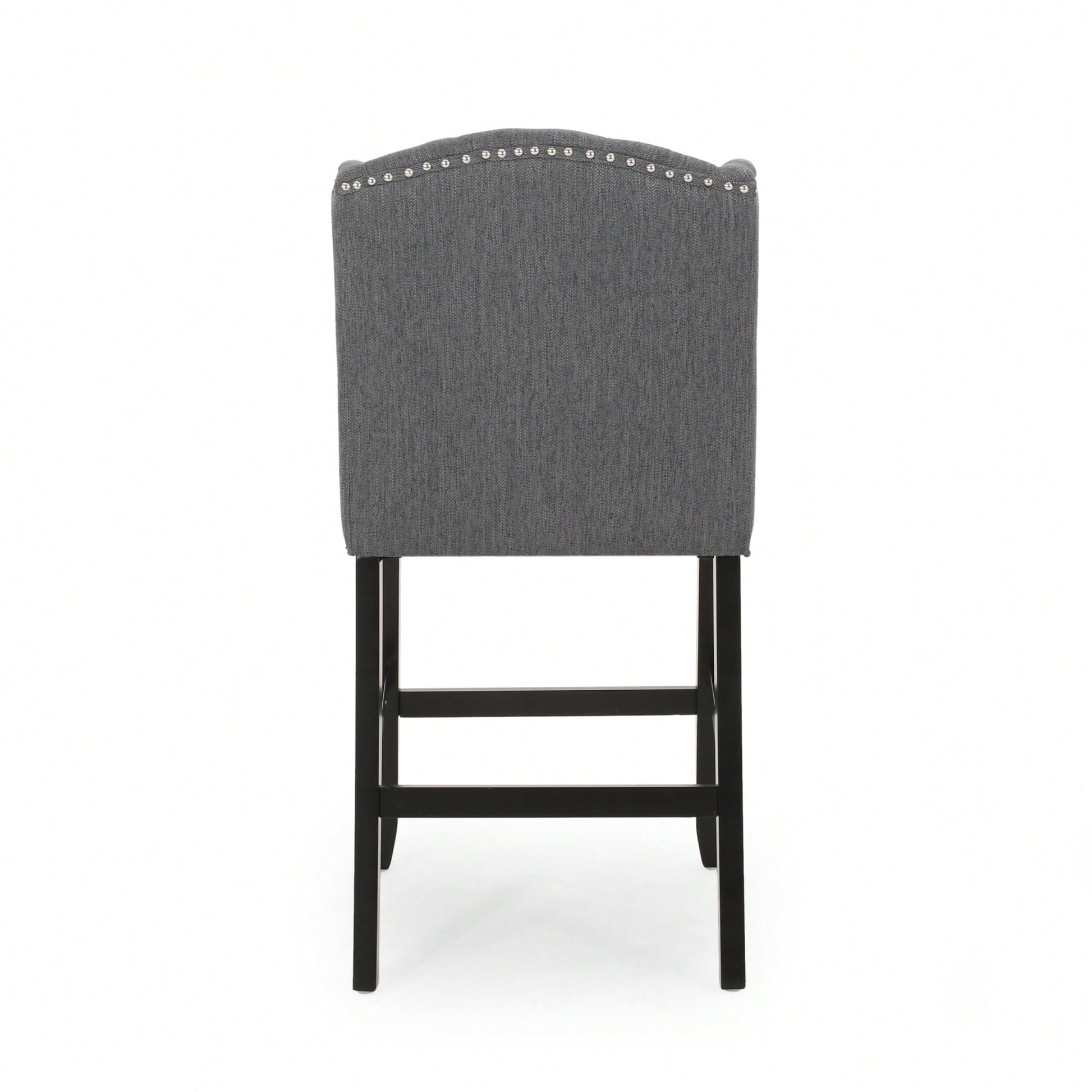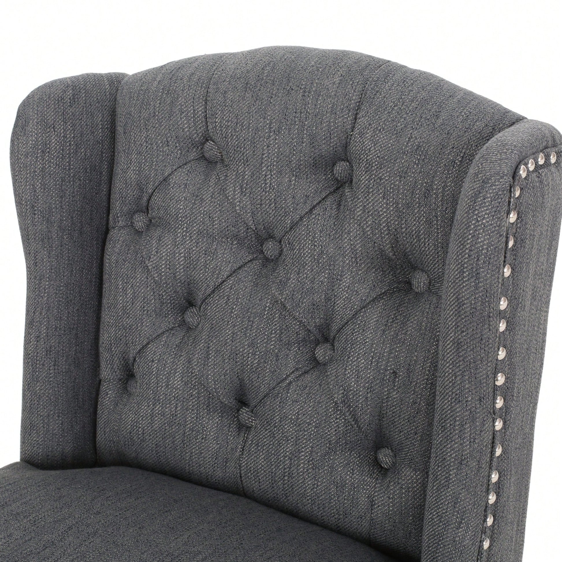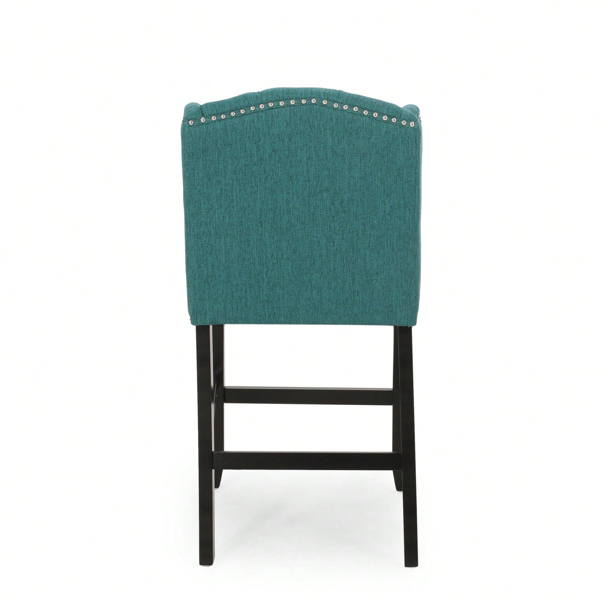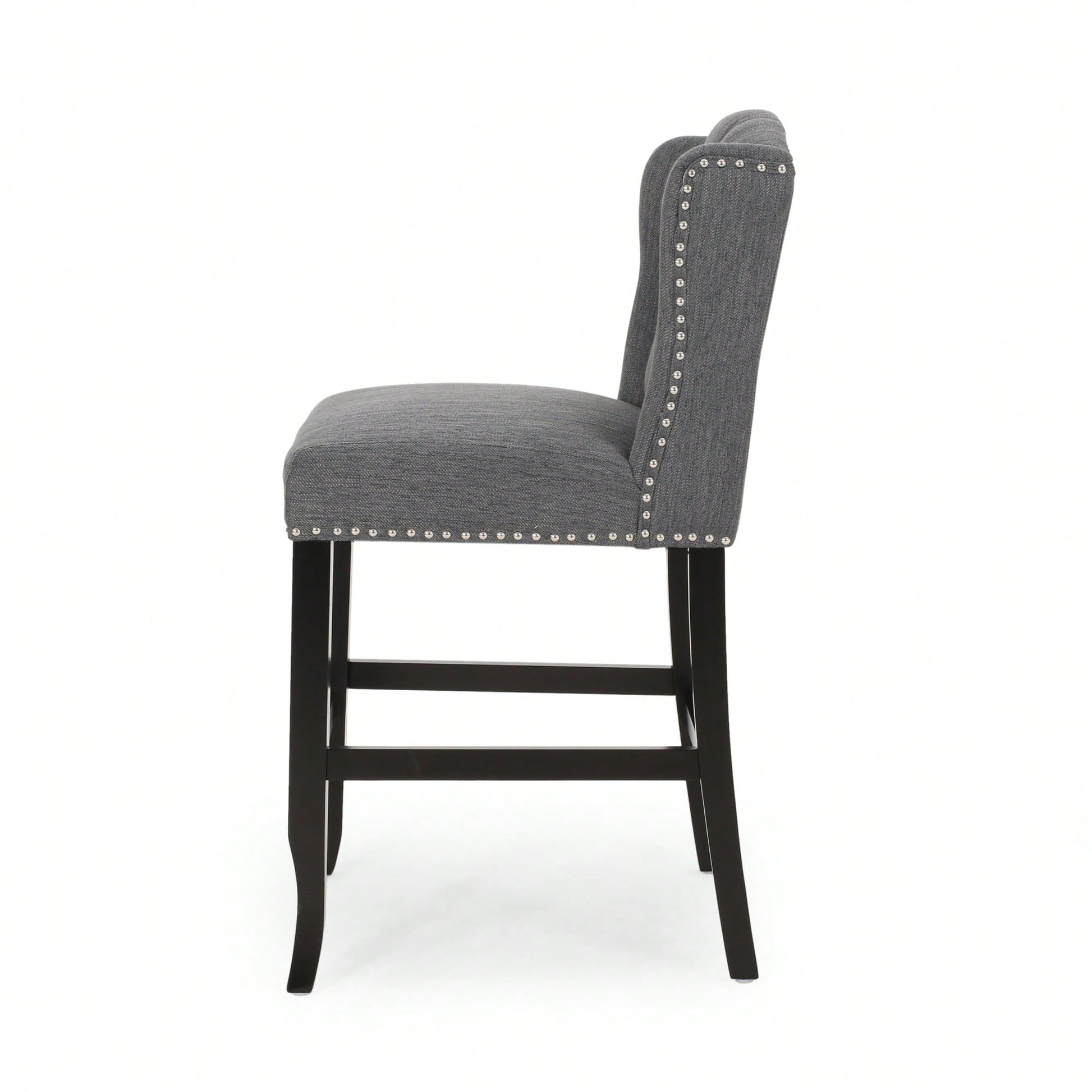 This set of two fabric tufted wingback counter stools features a button-tufted diamond stitch backrest that enhances its contemporary design while providing comfort. The wingback design not only adds a classic touch but also helps trap heat and shield from drafts. Tasteful nailhead accents border the seat and wings, showcasing a beautiful, hand-crafted finish. Constructed from durable rubberwood, these stools boast a natural-grain look, making them a standout addition to any room. With a seat height of 27 inches, they are perfect for kitchen islands or breakfast nooks.