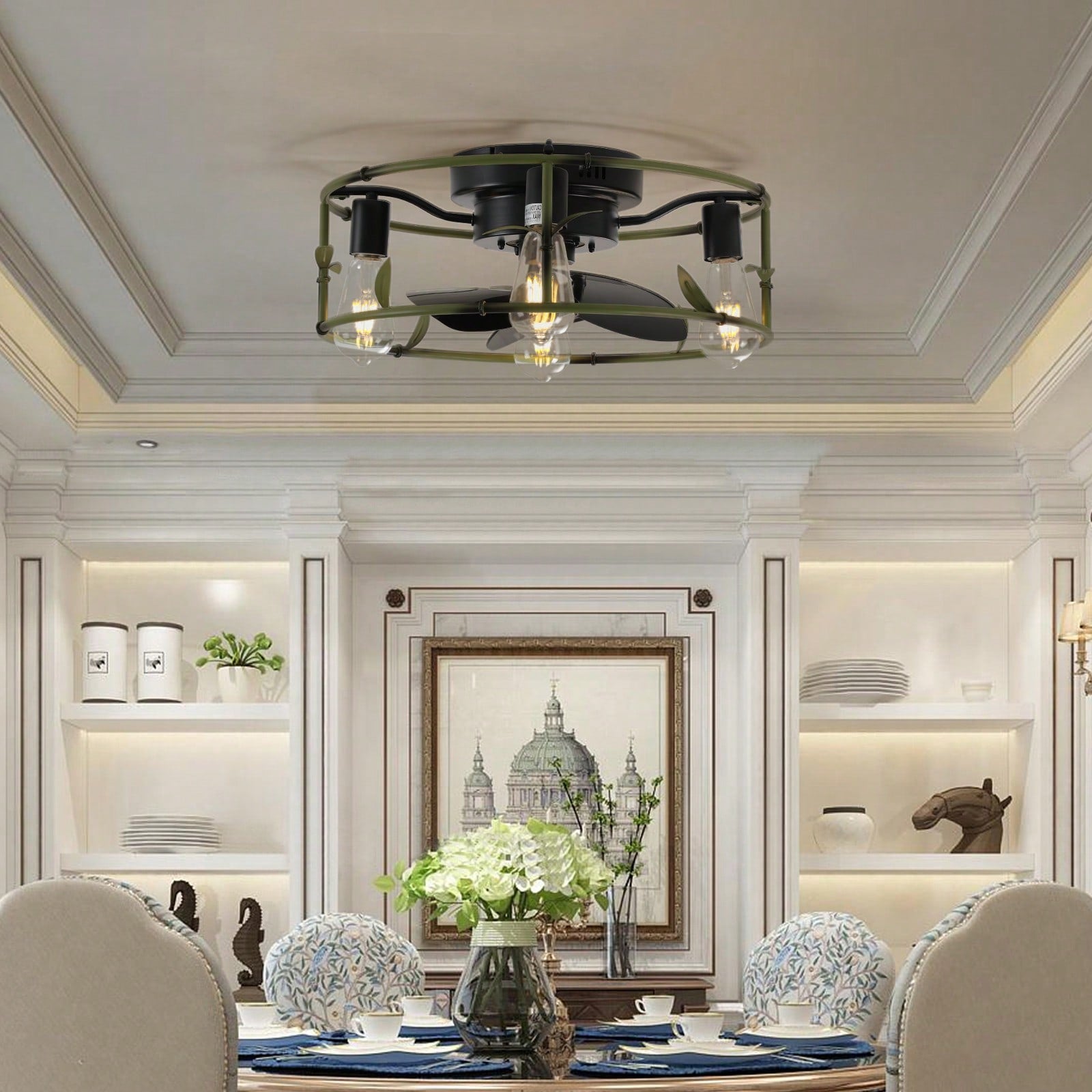 Green Caged Flush Mount Ceiling Fan with Lights and Remote for Modern Farmhouse Living Room Bedroom Kitchen