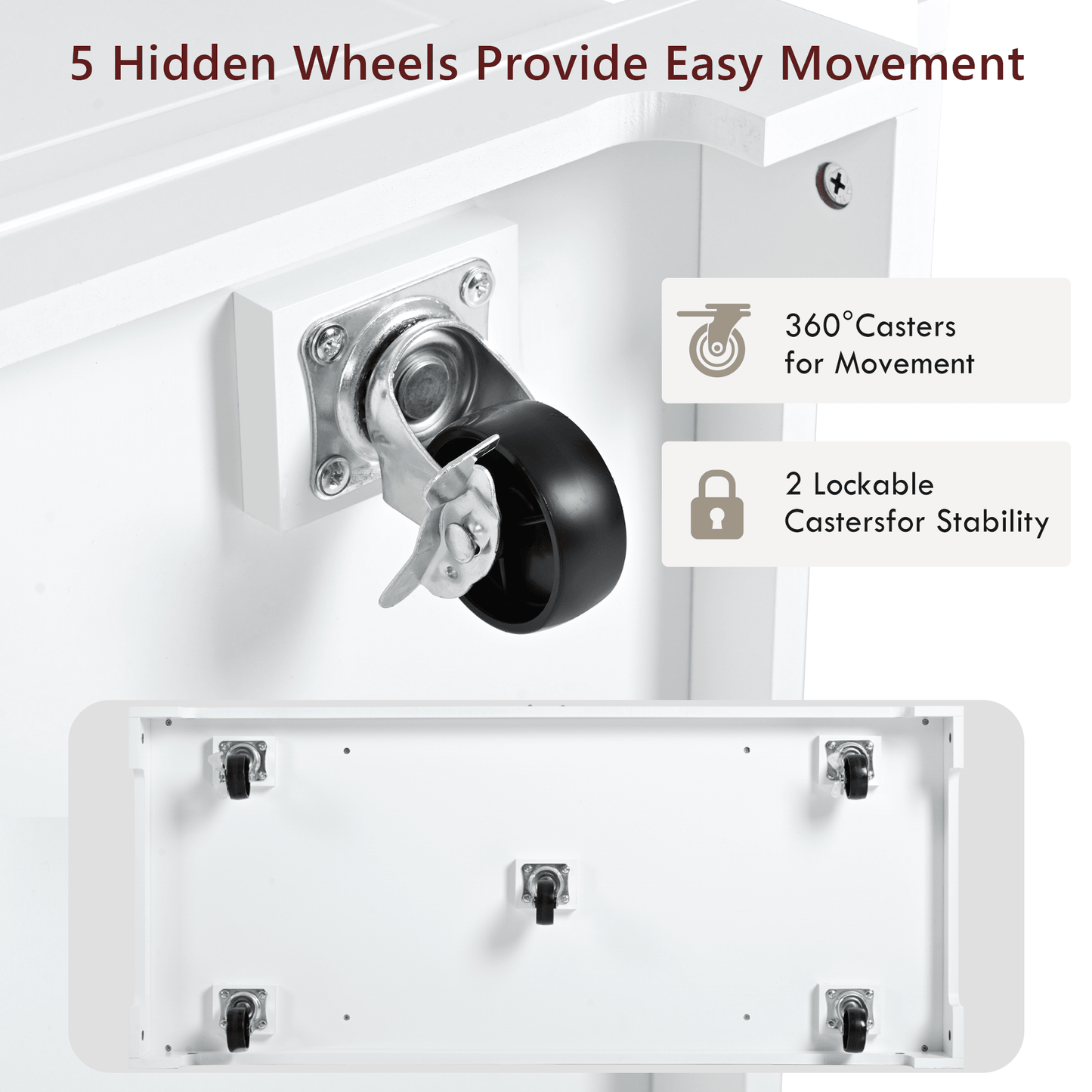 **Key Features:** - Concealed tilt-out trash can storage for a tidy kitchen, accommodating a 10-gallon bin (not included). - Built-in power outlet with 2 AC outlets, 1 USB port, and 1 Type-C port for easy charging of appliances and devices. - Stylish two-tone design with fluted drawers and luxury handle, enhancing contemporary kitchen decor. - Ample storage space with wide countertop, 3 drawers, and 3 open side shelves for organizing kitchen essentials. - Mobile design with 5 hidden wheels, including 2 lockable options, or can be used stationary for stability. **Product Description:** This fluted kitchen island features a concealed trash can cabinet that keeps your kitchen organized and odor-free. The built-in power outlet allows for convenient charging of kitchen appliances, making it a versatile addition to your workspace or dining area. Its trendy design combines natural rubber wood and a classic white cabinet, complete with stylish handles. With a spacious countertop, multiple storage options, and mobile functionality, this kitchen island caters to all your culinary needs while adding a touch of elegance to your home. **Specifications:** - Dimensions: 47.2"W x 20.5"D x 36.0"H - Weight capacity: Up to 400 lbs - Material: CARB Phase certified MDF boards, rubber wood tabletop - Assembly: Simple assembly required with step-by-step instructions included.