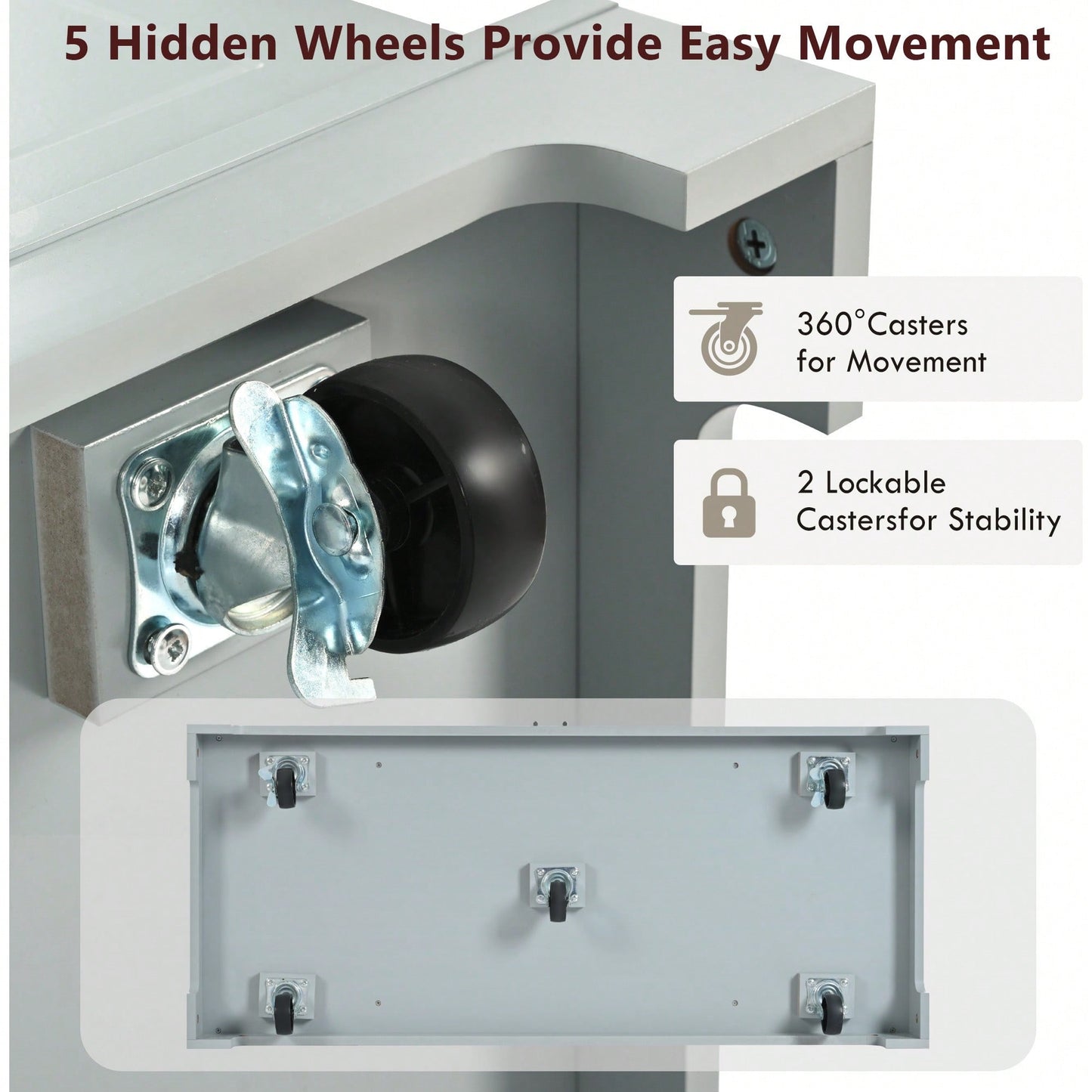 Fluted Kitchen Island With Trash Can Storage, Power Outlet, Internal Storage Rack, Rolling Design On 5 Wheels, 10 Gallon Bin, White